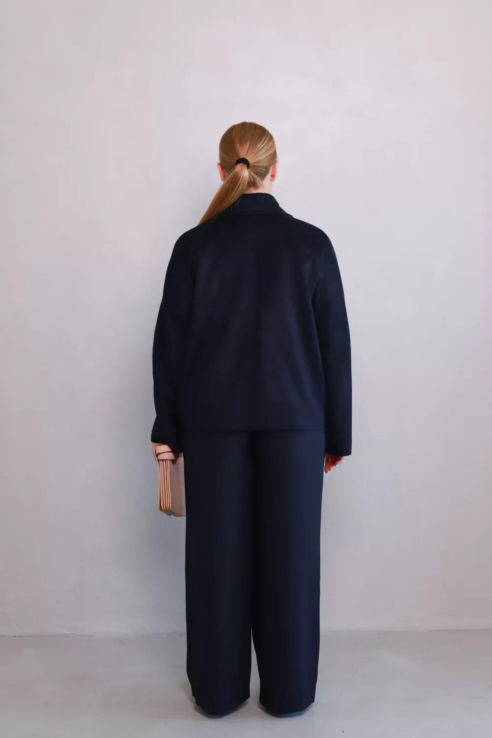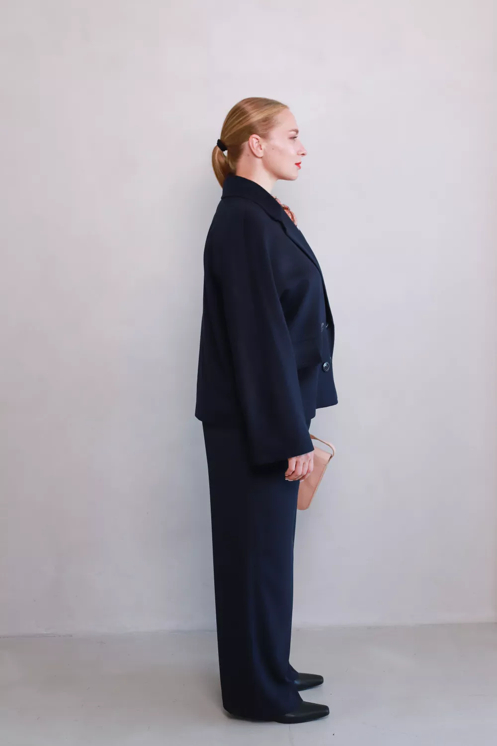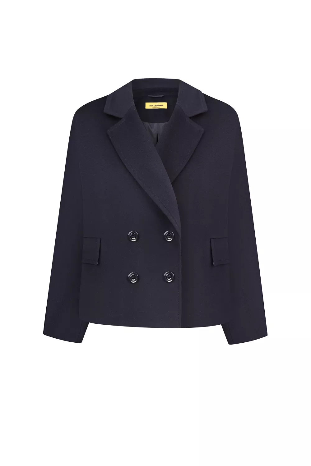 Add a bright accent to your wardrobe with this elegant coat made of 100% wool. The rich dark blue color creates the image of a confident woman who loves to be the center of attention.