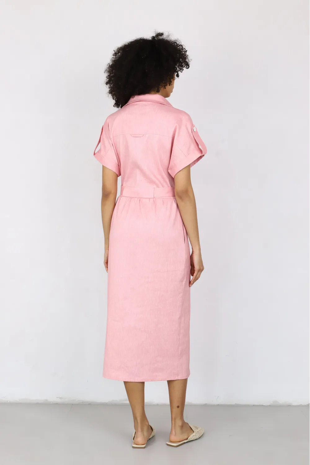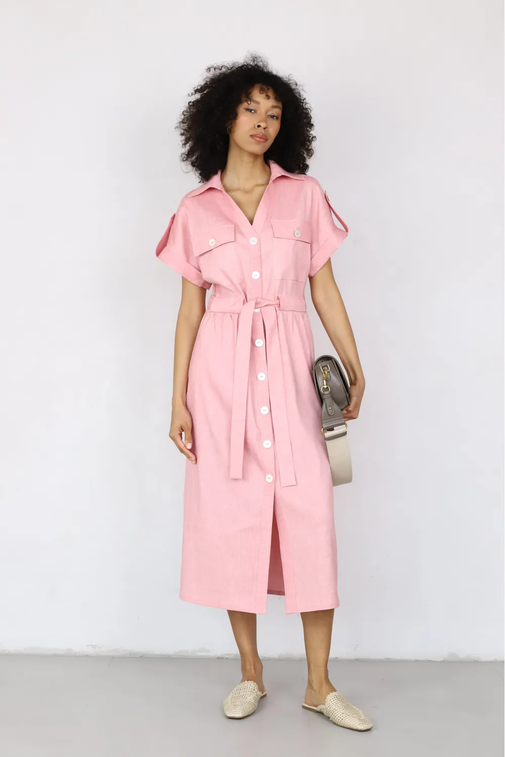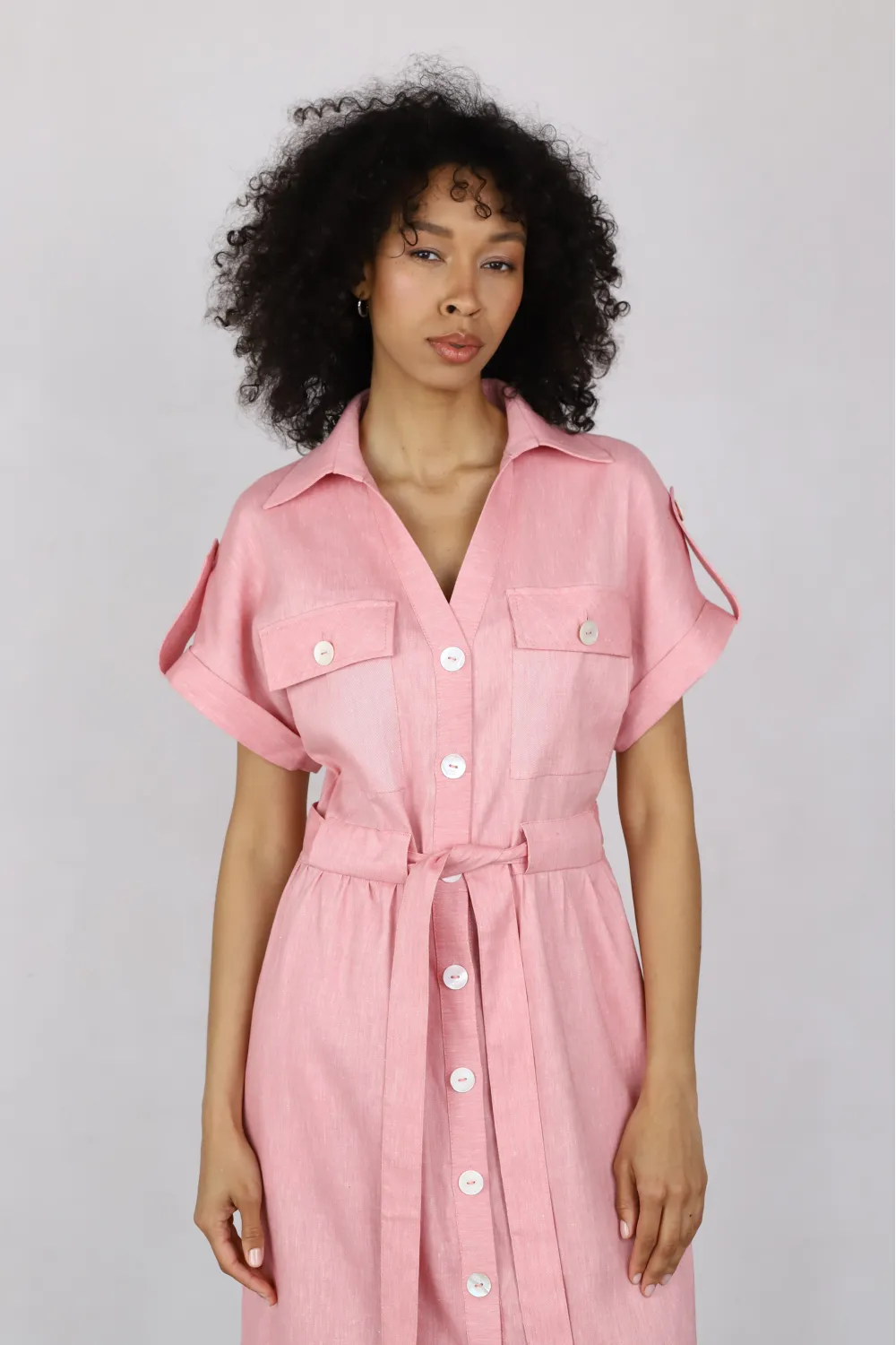Midi shirt dress crafted from a lightweight natural fabric in a soft pink shade. The straight silhouette is complemented by a waist tie for a defined shape, while patch pockets and short sleeves create an effortless, modern everyday look.