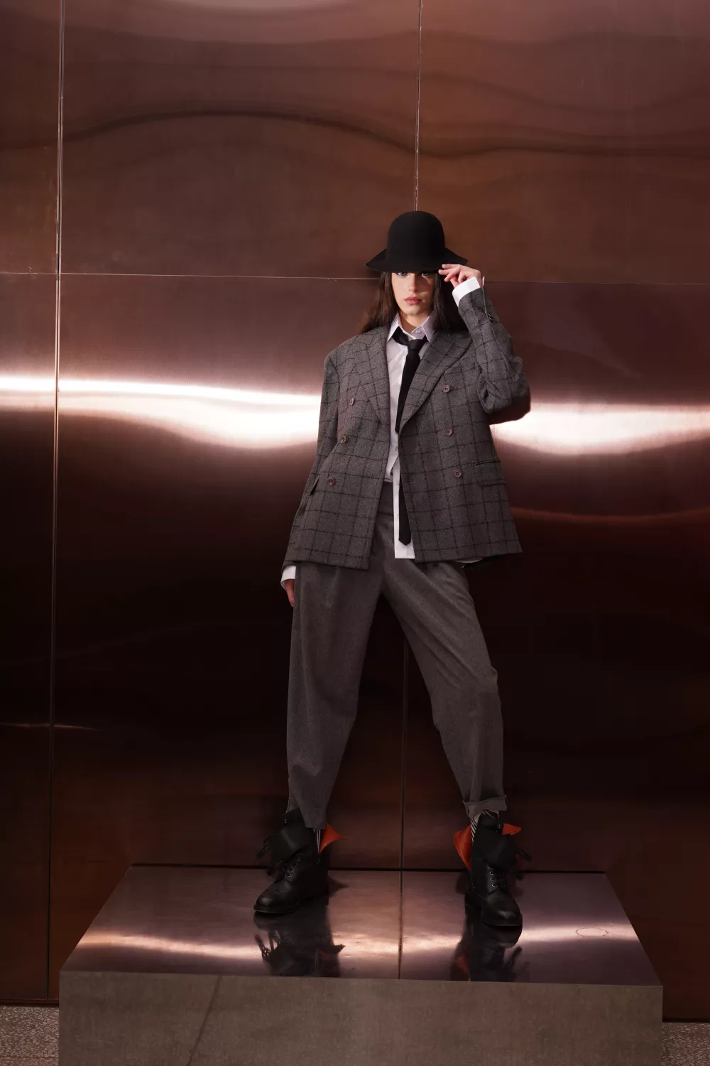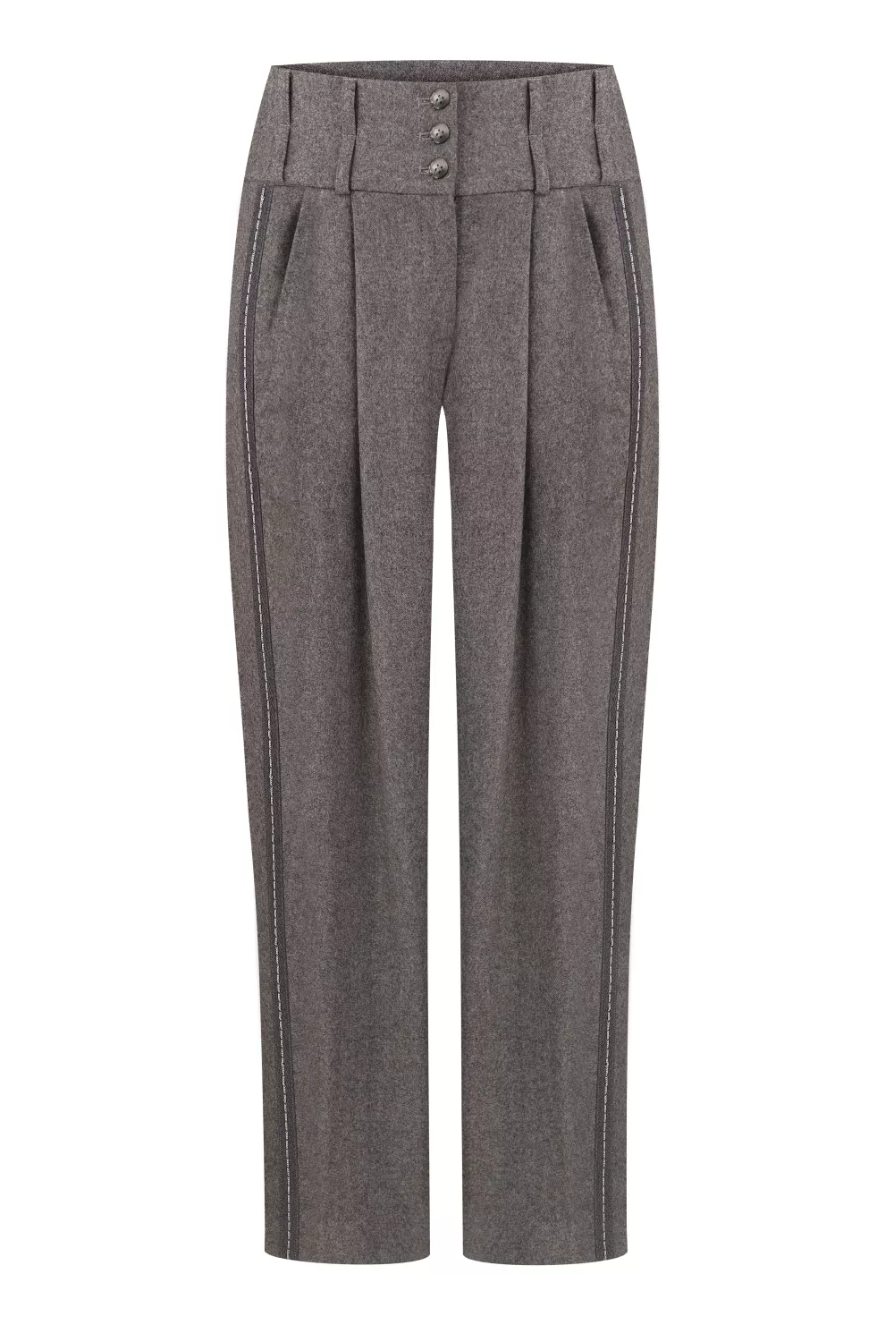 Cropped pants "bananas" made of wool flannel with pleats at the waist and a decorative chain along the side seam