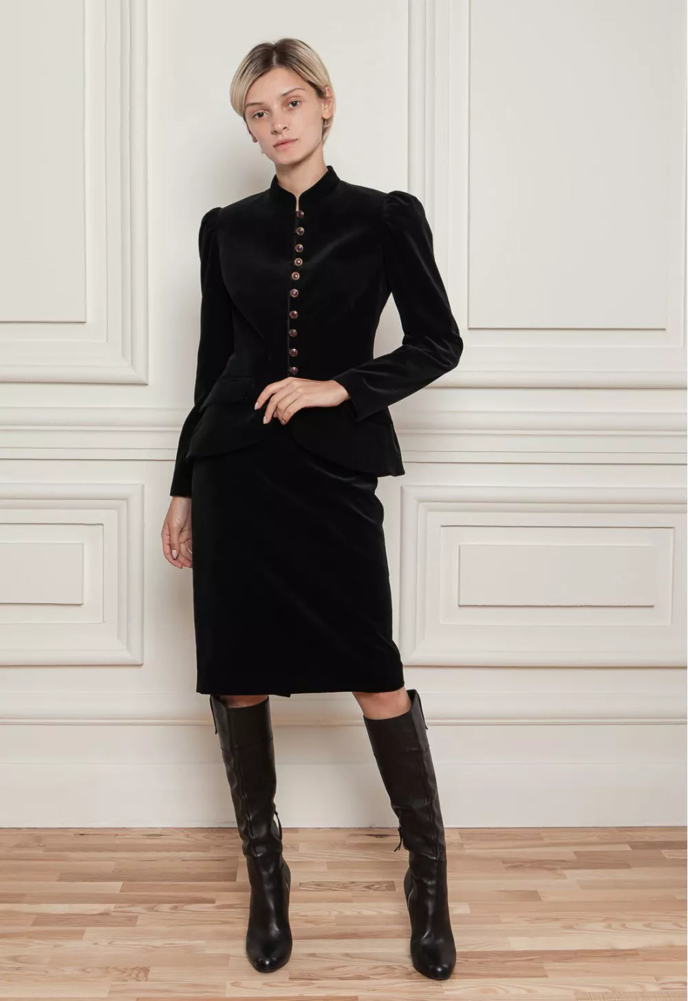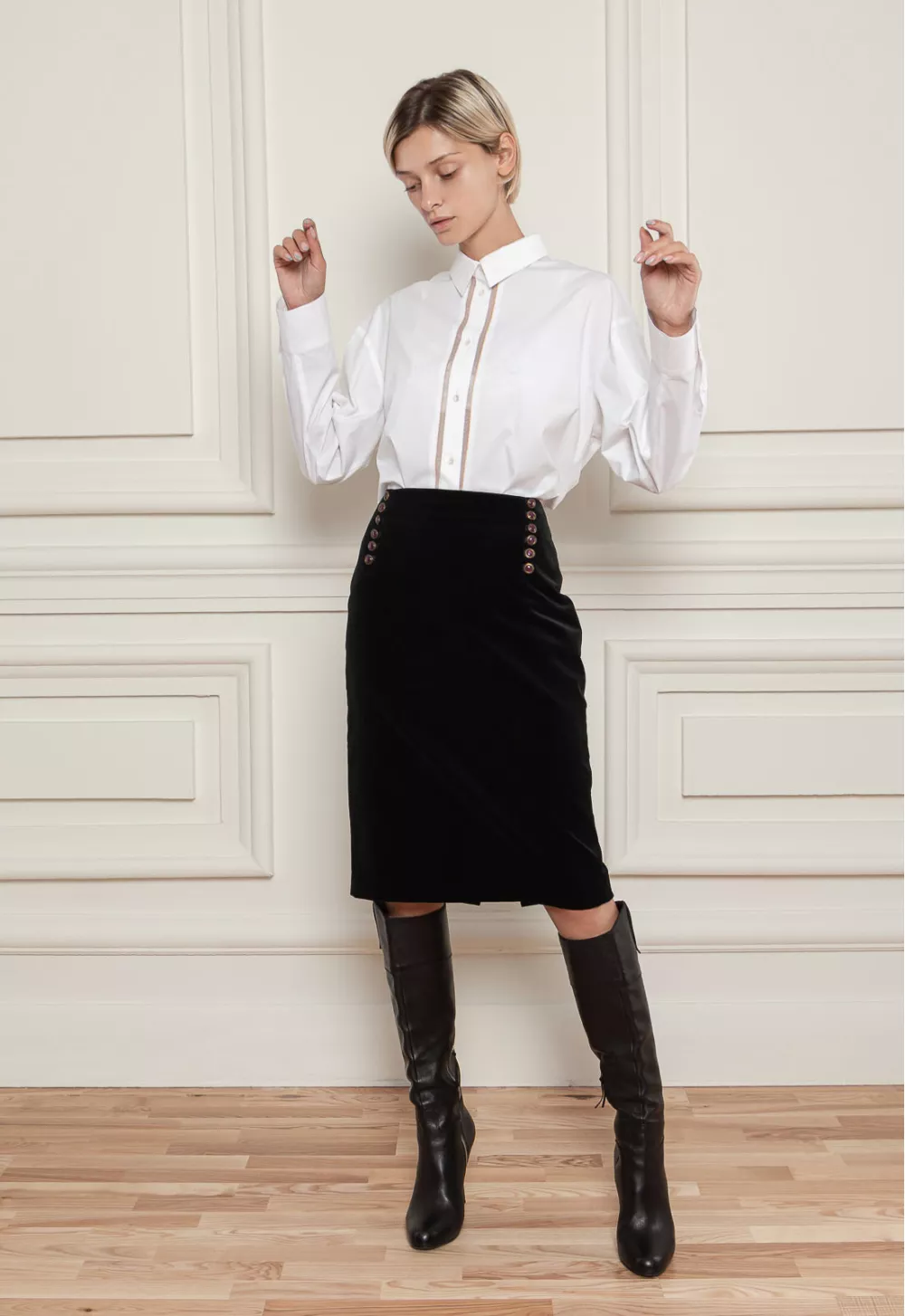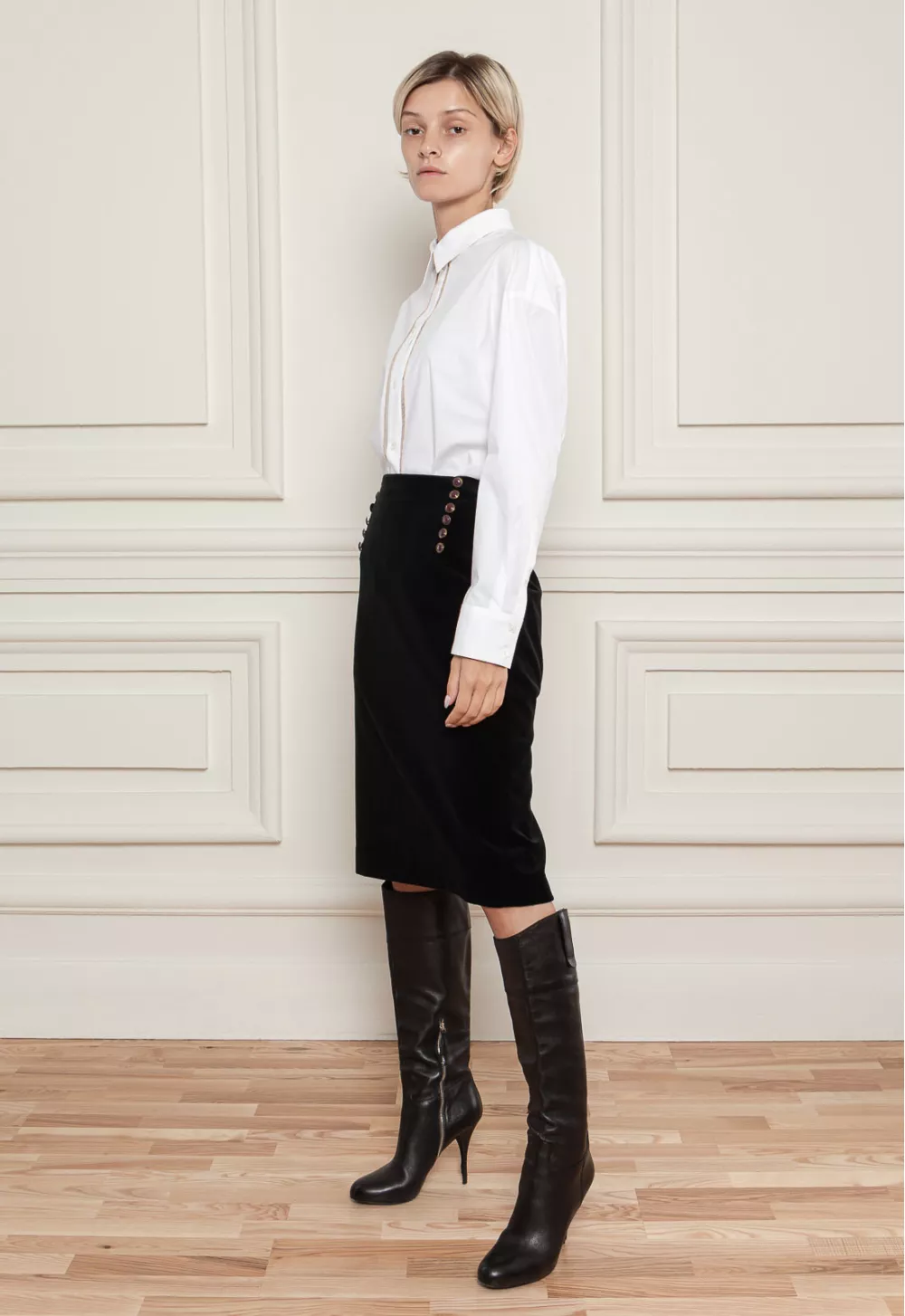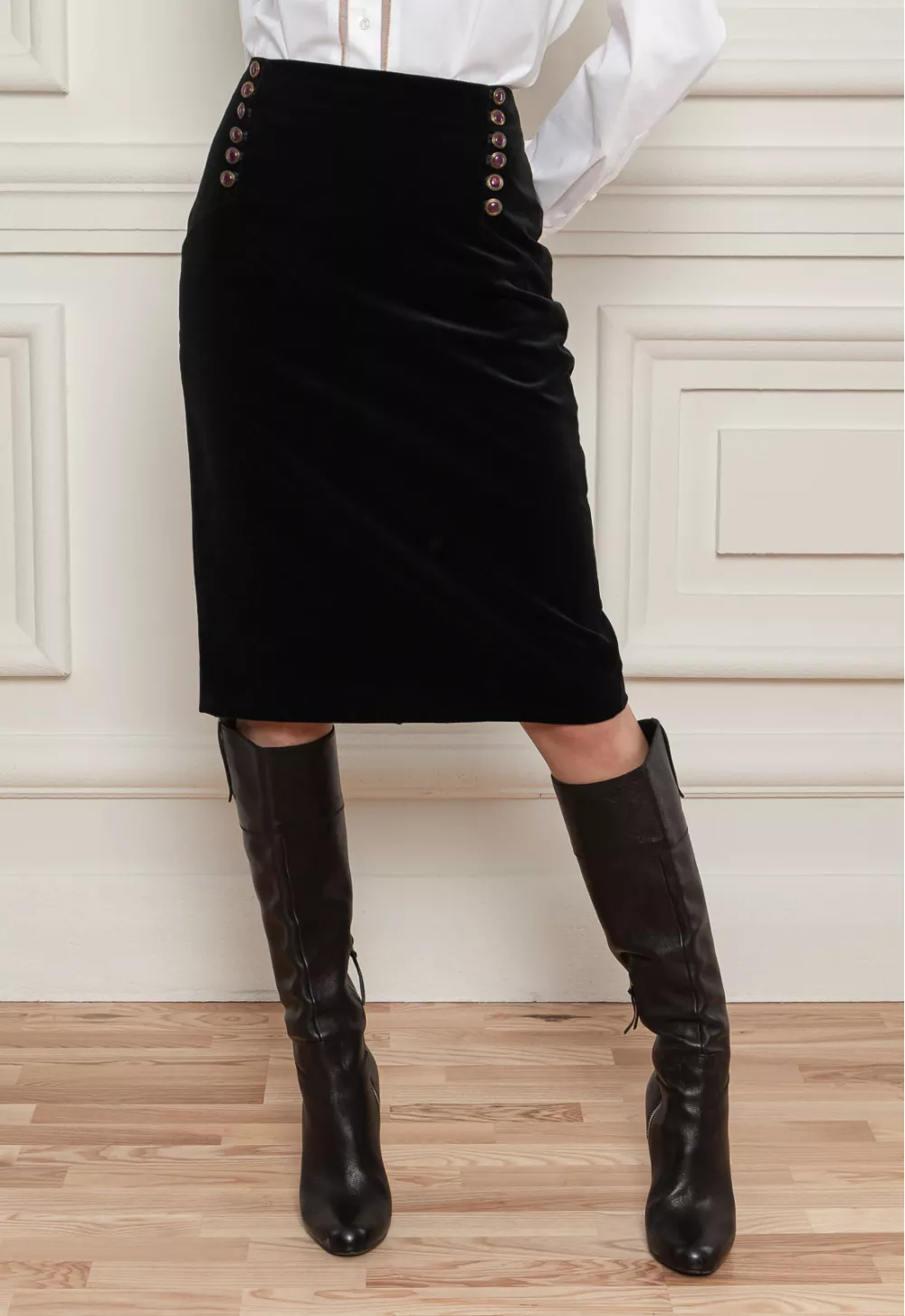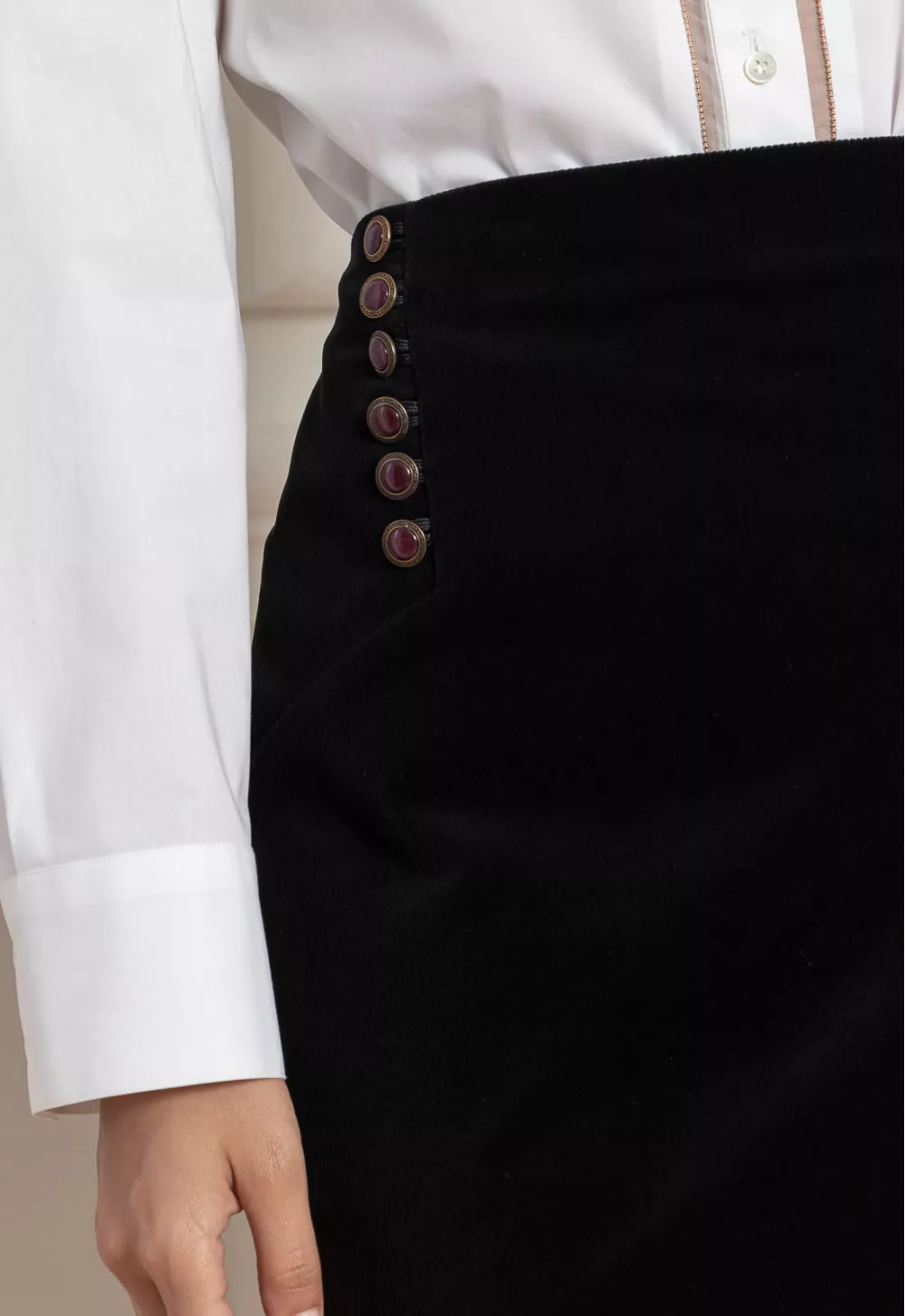 Юбка-карандаш в аристократическом стиле с пуговицами. Крой прямой. Эта оригинальная юбка будет идеально сочетаться с однотонным верхом.