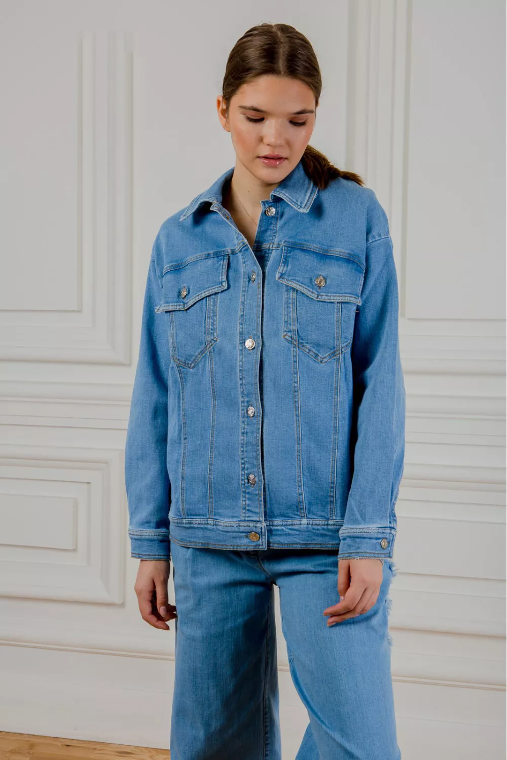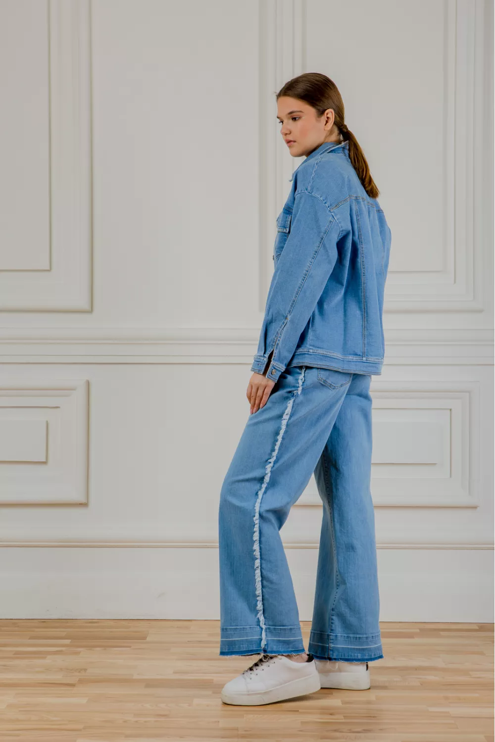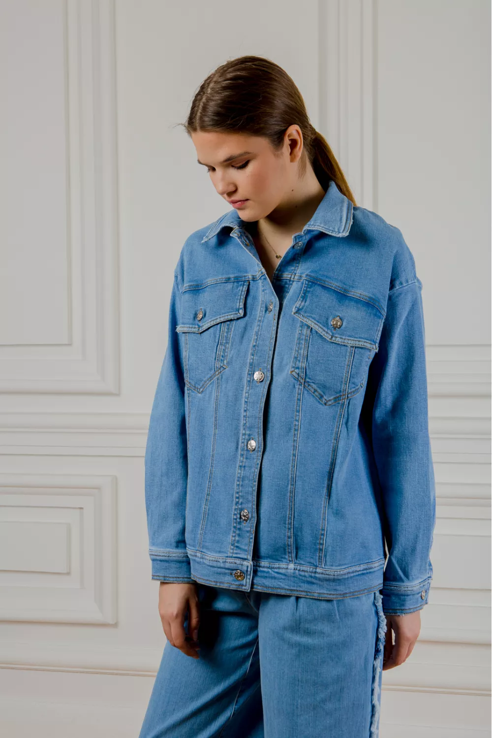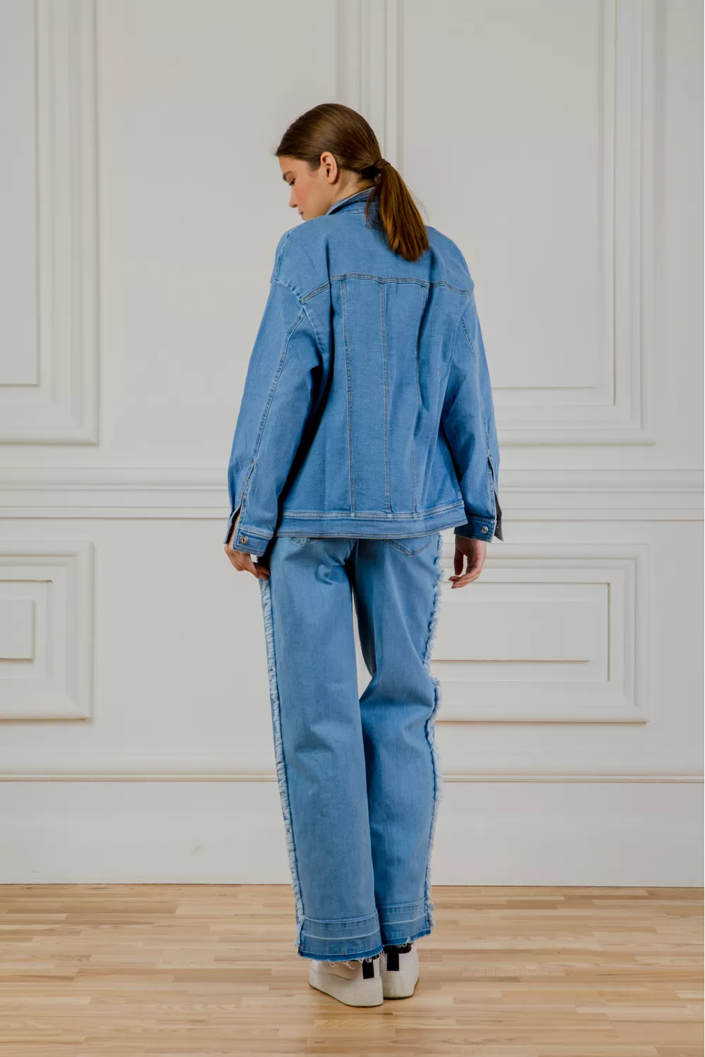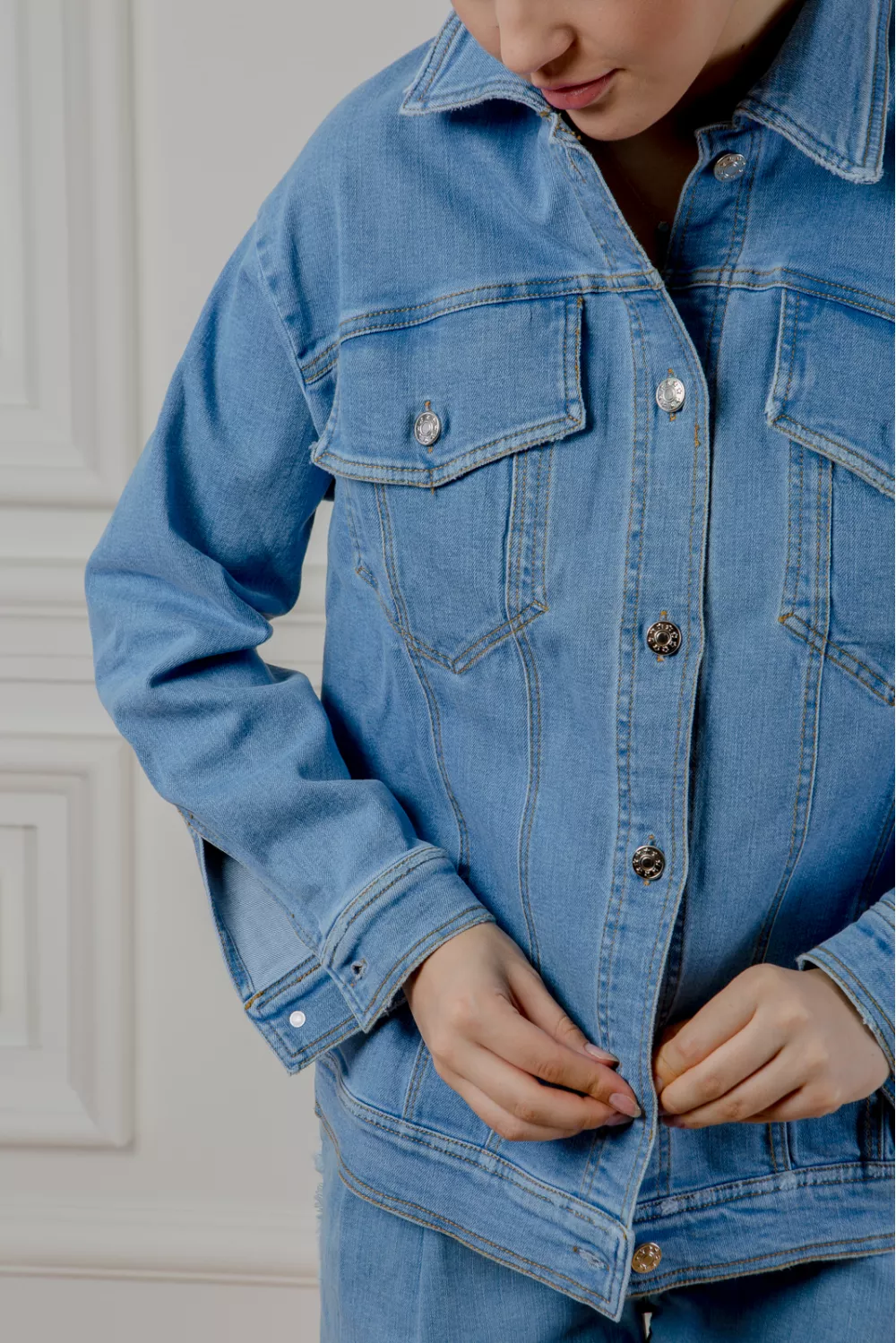 Джинсовая куртка среднего объема с потертостями и накладными карманами. Застежка - на металлических пуговицах, по низу и рукавам - манжеты