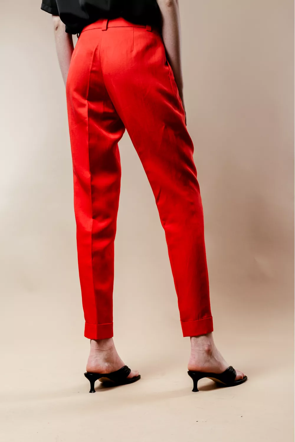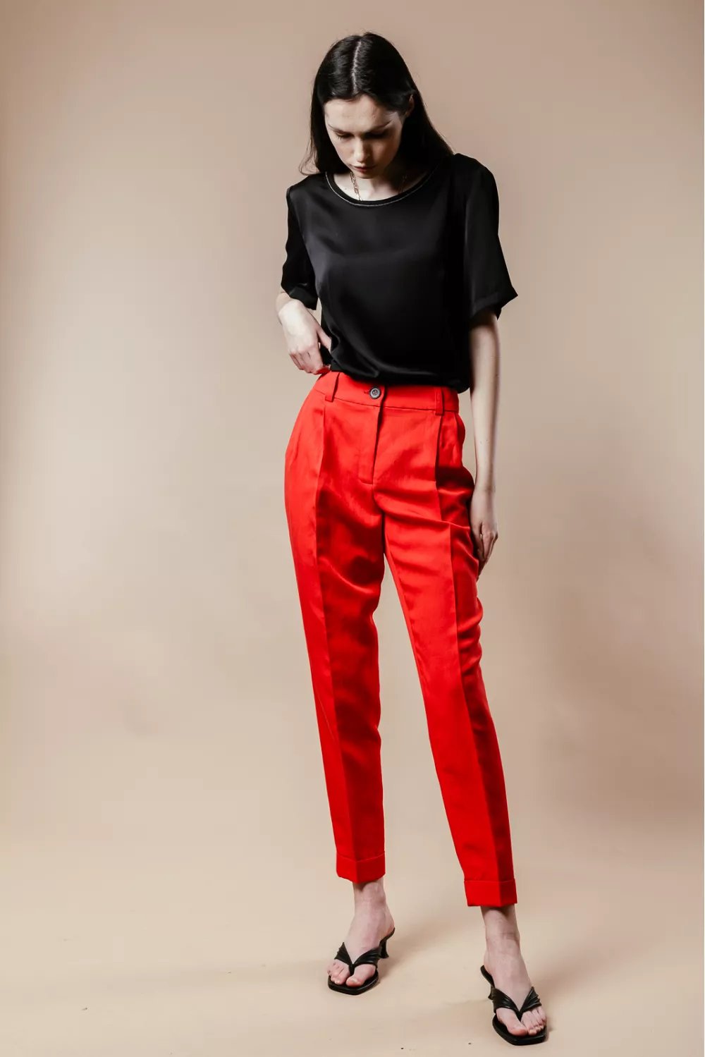 Базовые брюки с защипами боковыми карманами. Застежка - на молнию и пуговицу, по низу - манжеты