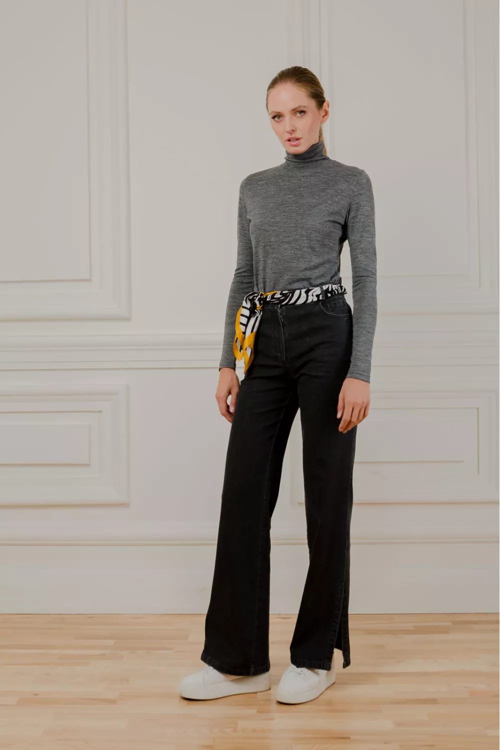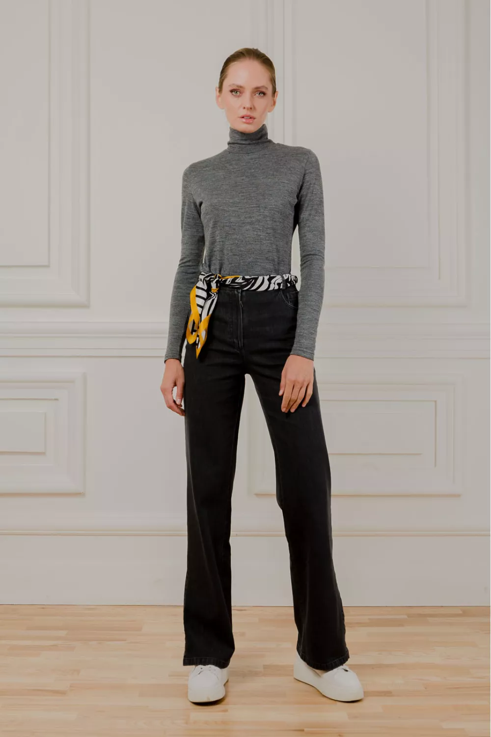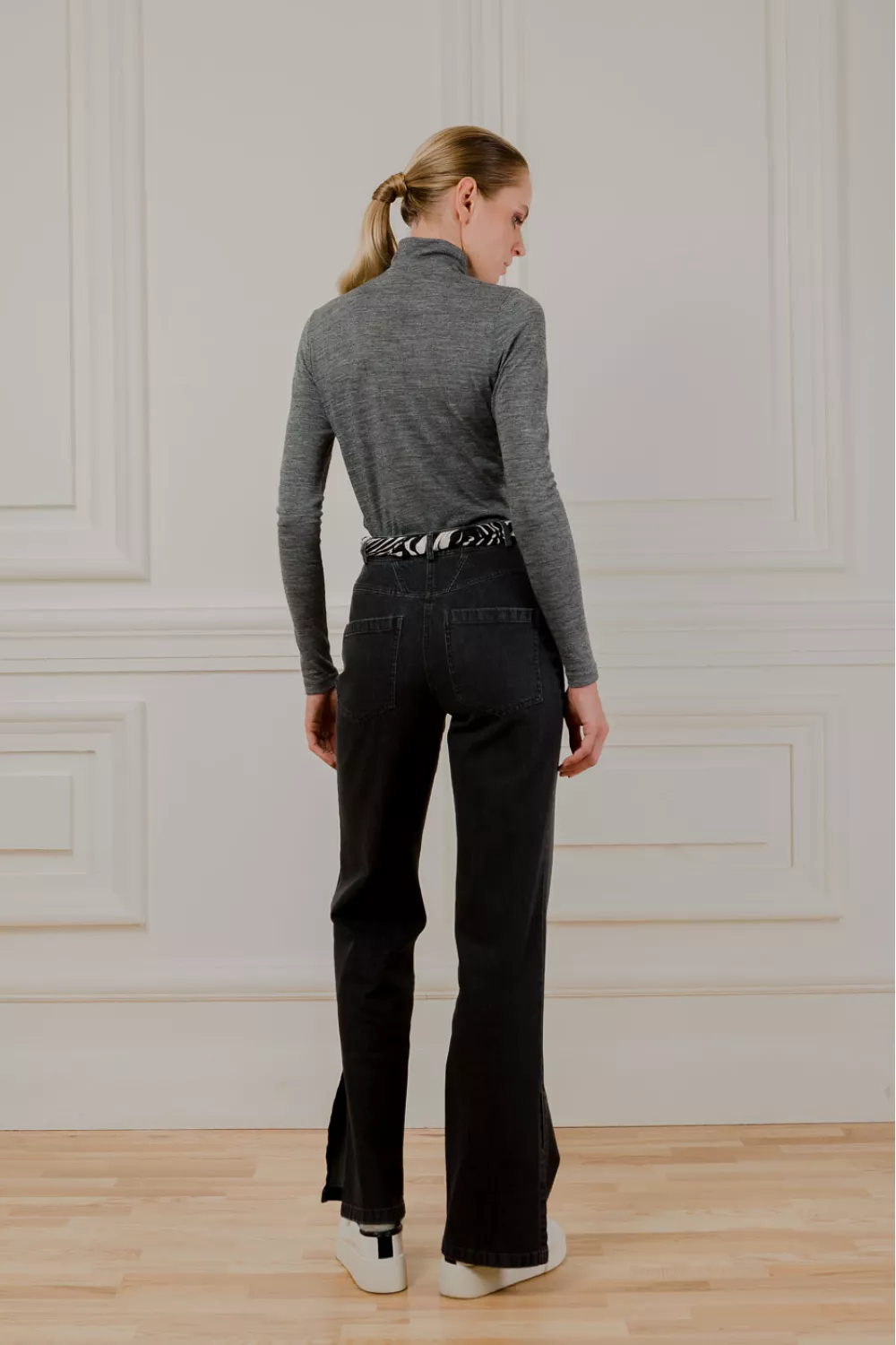 Джинсы со средней посадкой, зауженные по бедрам и имеют широкую ширину до колена, пропорционально корректирующую фигуру
