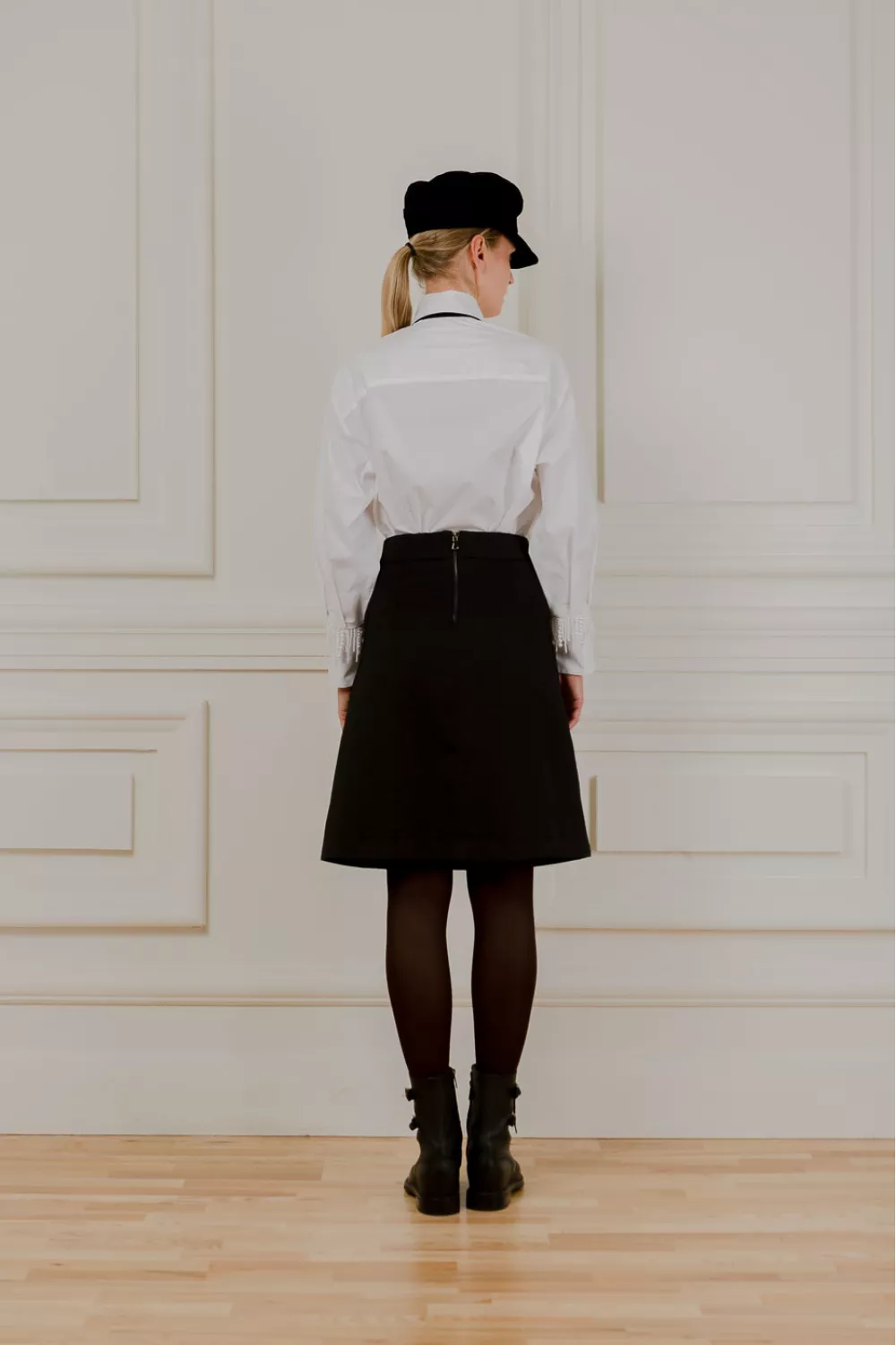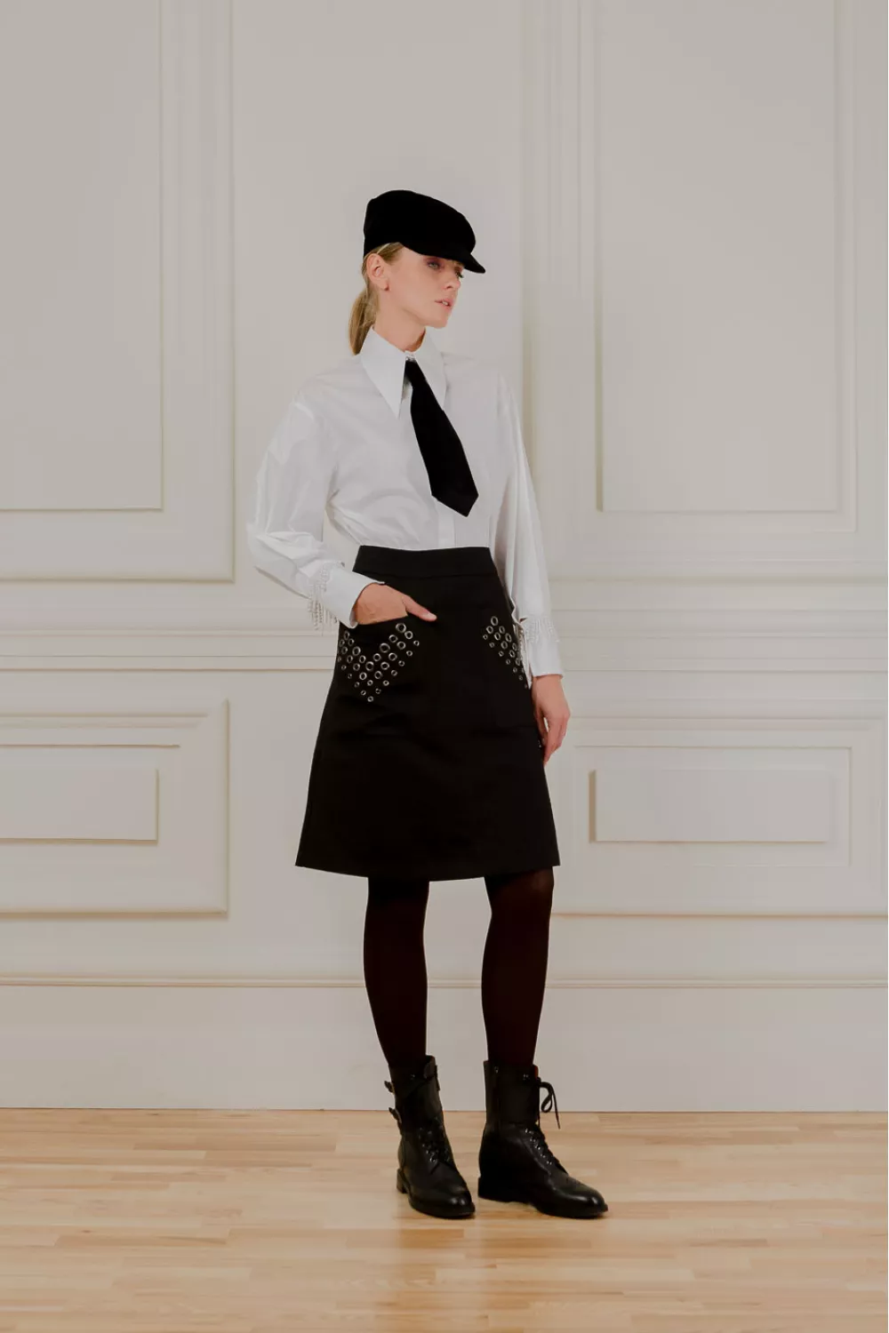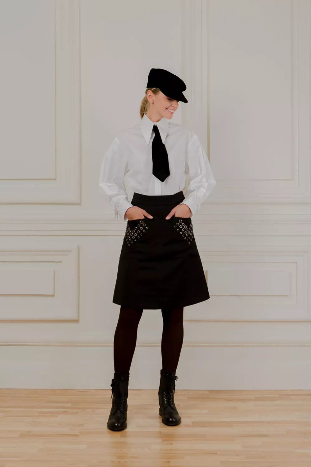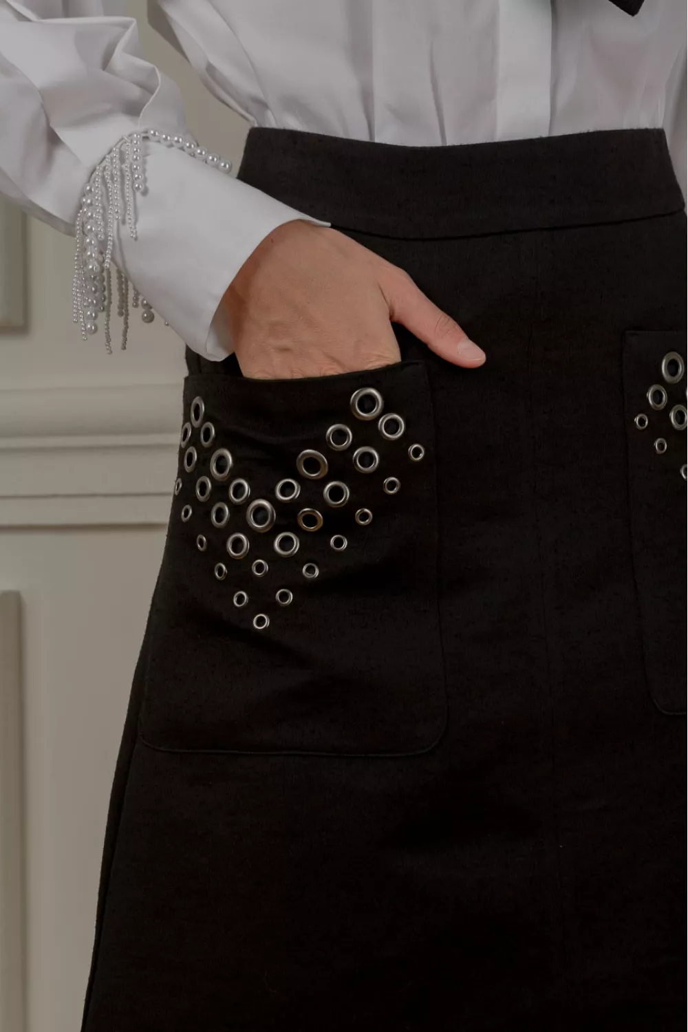 Юбка выше колена с передними карманами, украшенными люверсами. Теплая плотная ткань позволит одевать ее даже зимой и станет хорошим дополнением как к офисному, так и повседневному гардеробу