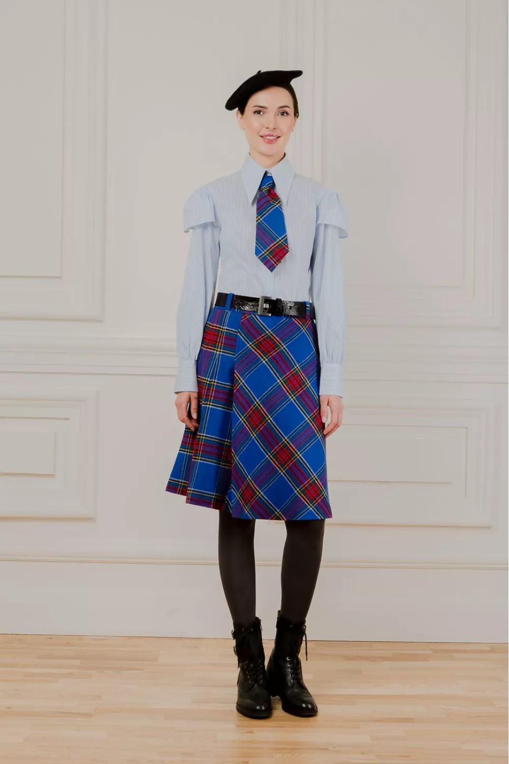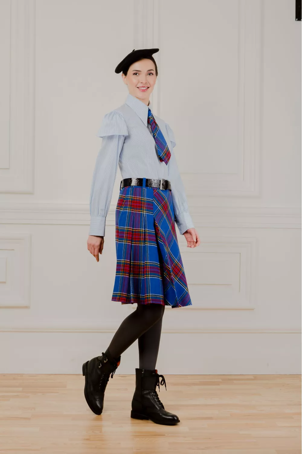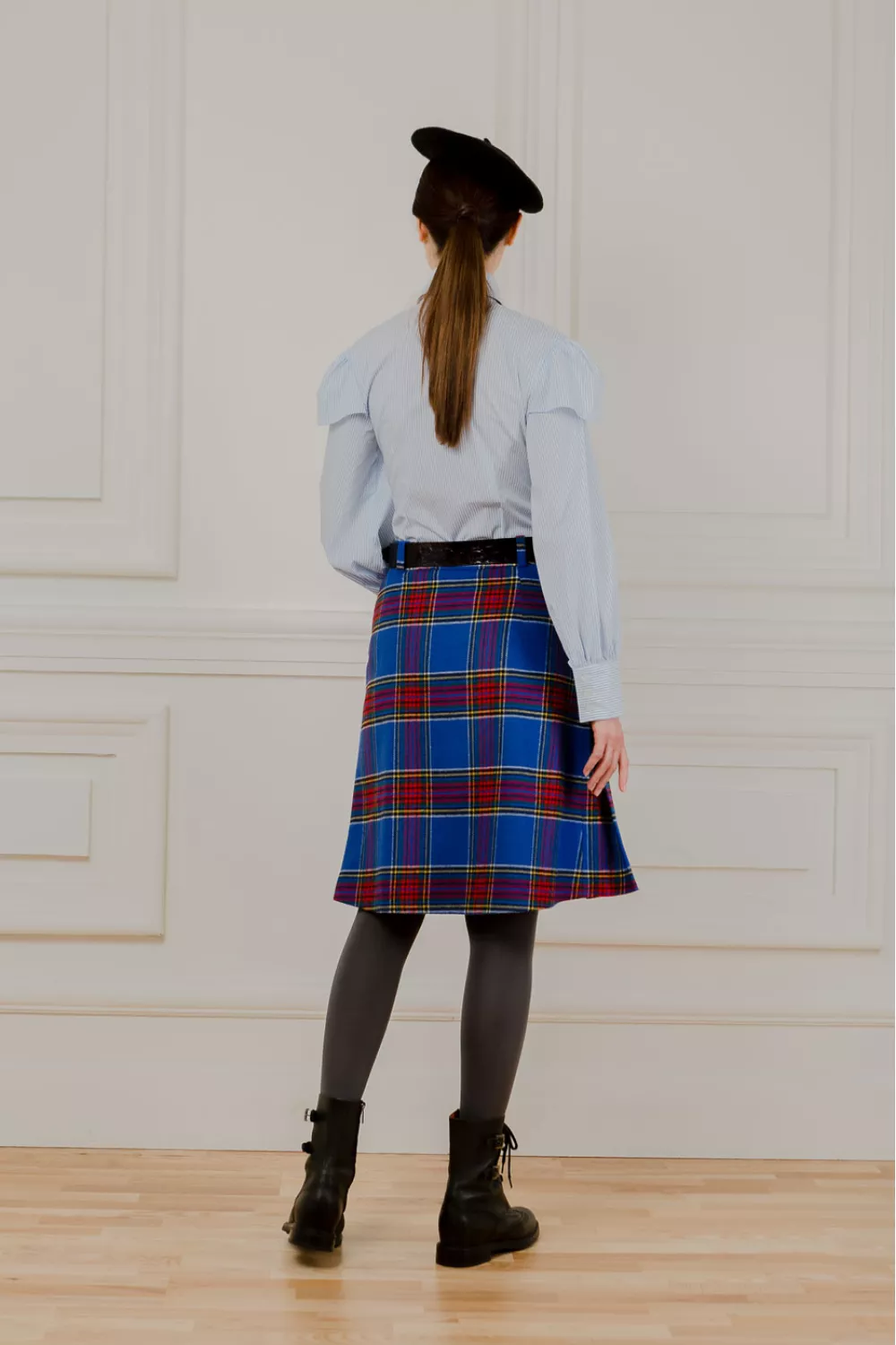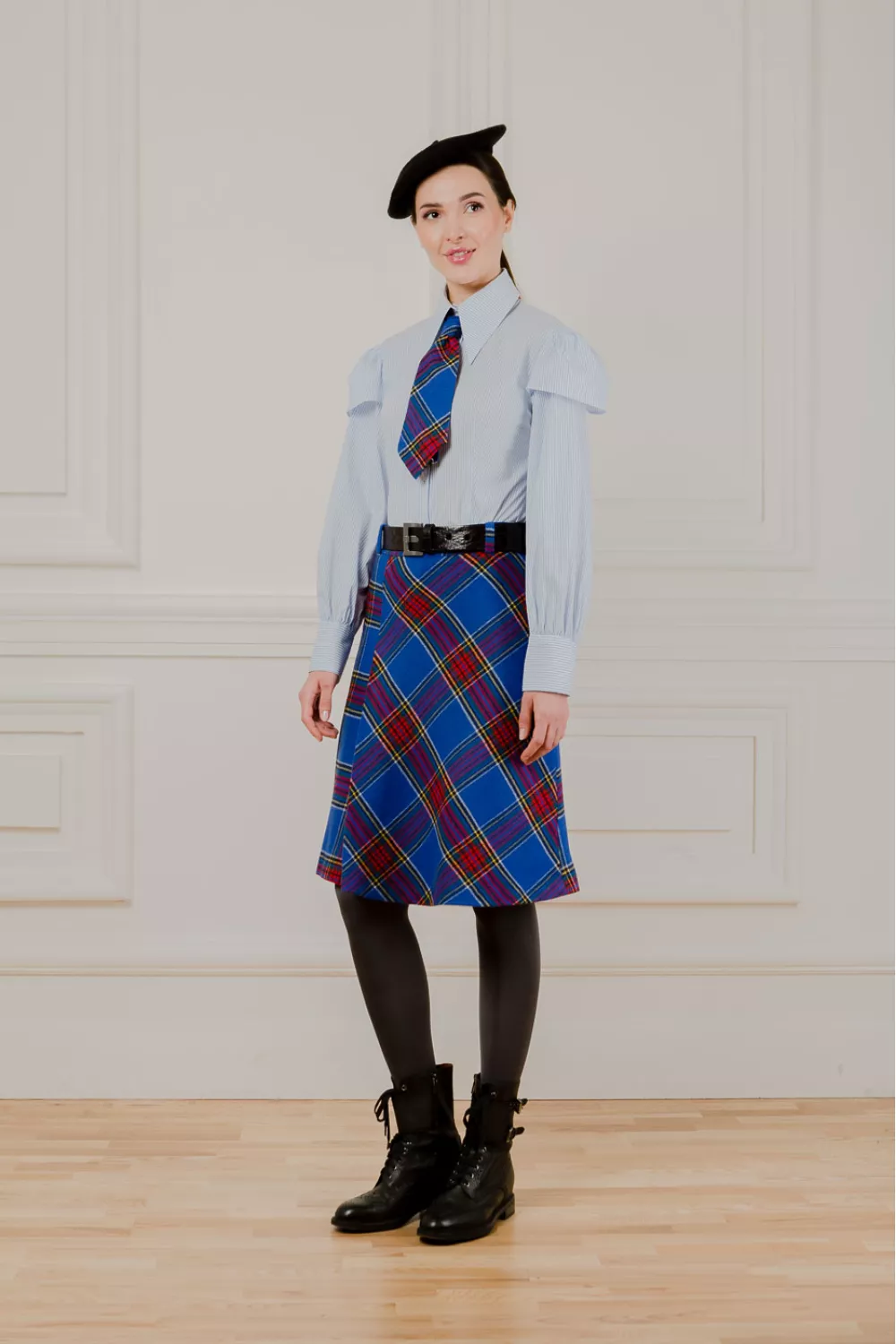 Юбка меди, в ячейку насыщенного цвета электрик, имеет прямую и собранную складками.