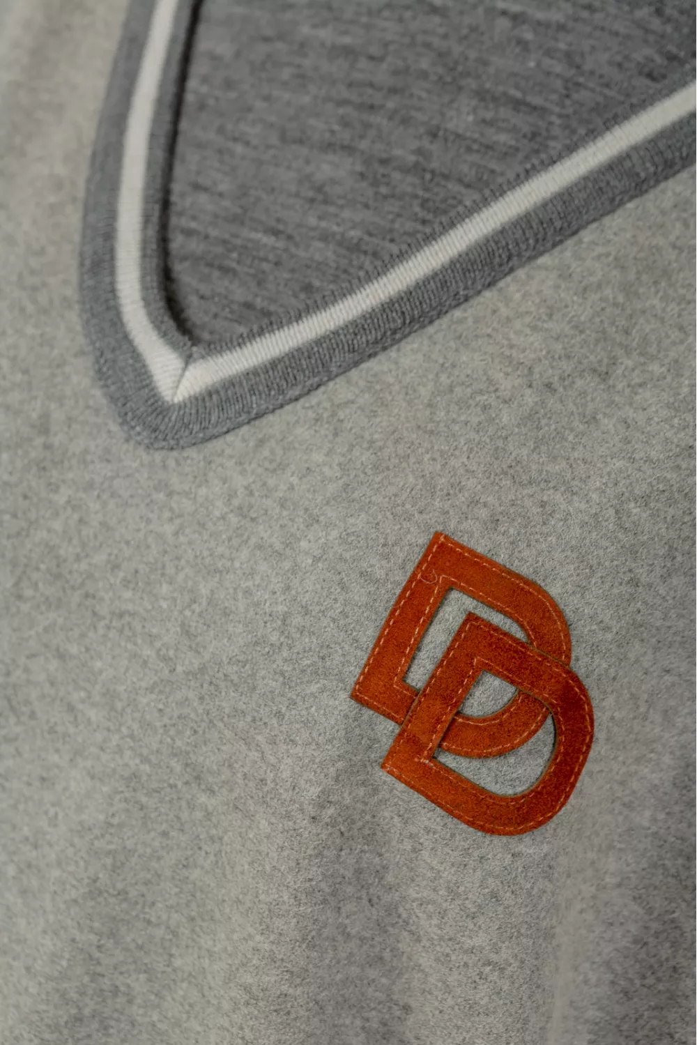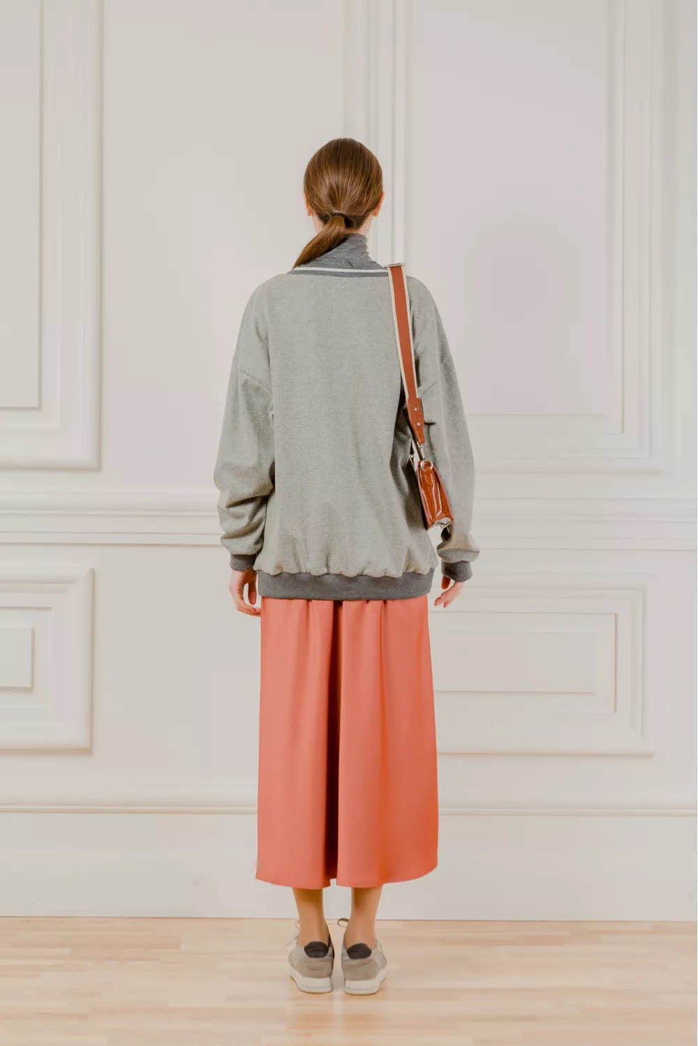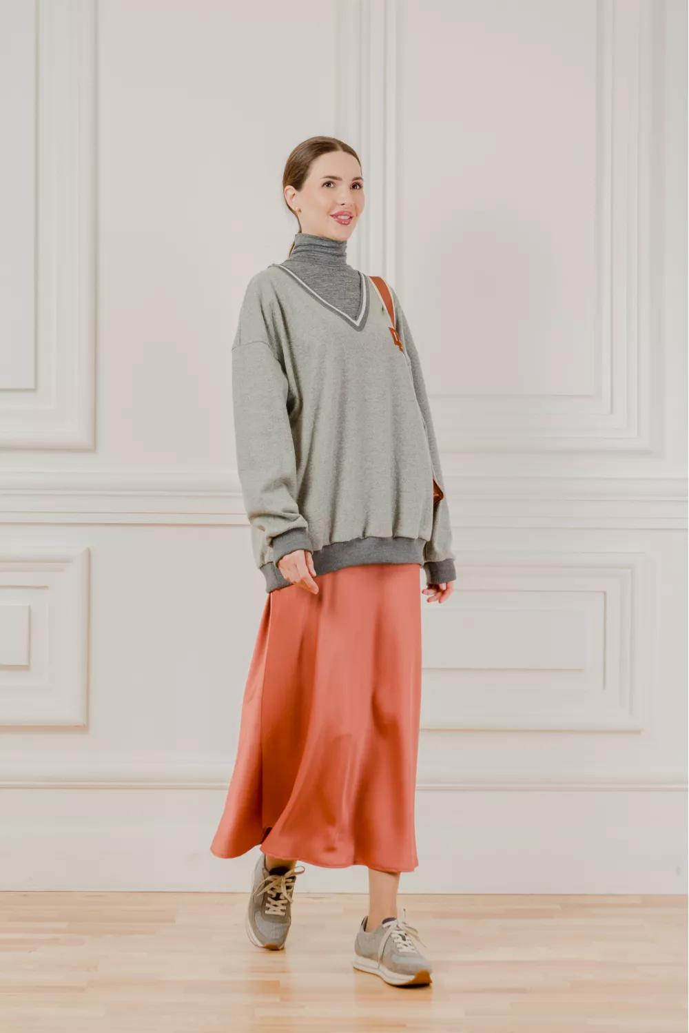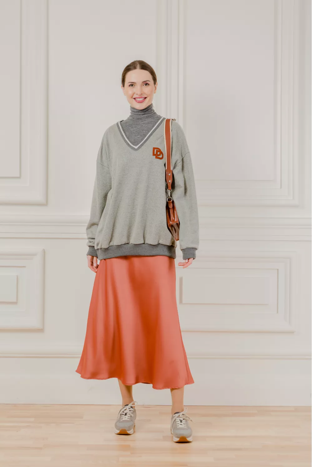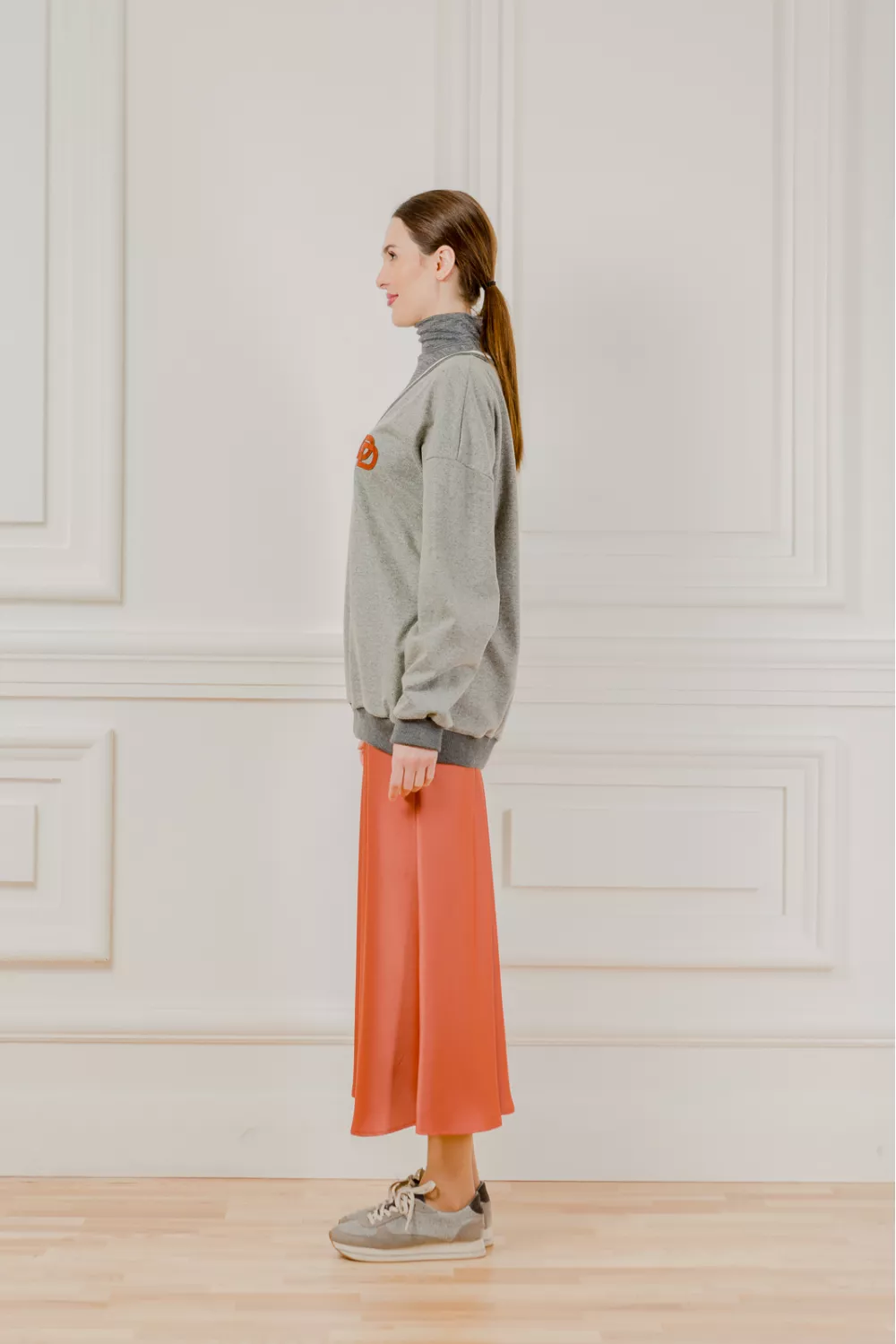 Серый оверсайз свитшот со спущенным рукавом позволяет одеть под низ тонкий гольф и стилизовать образ. Рукава и низ имеют широкие манжеты мелкой вязки, а сам свитшот декорирован фирменными инициалами.