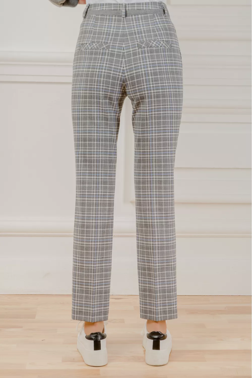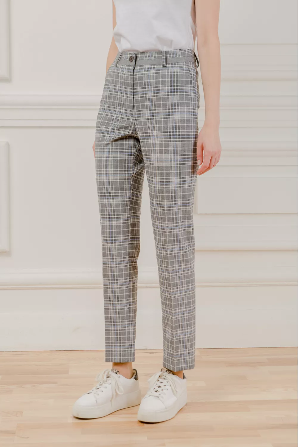 Клетчатые брюки класического выполнения прямого покроя со стрелкой. Сами брюки не длинные, что делает их более удобным и весенним вариантом
