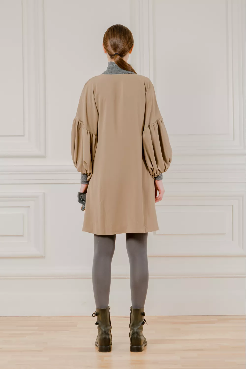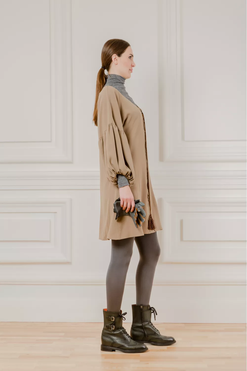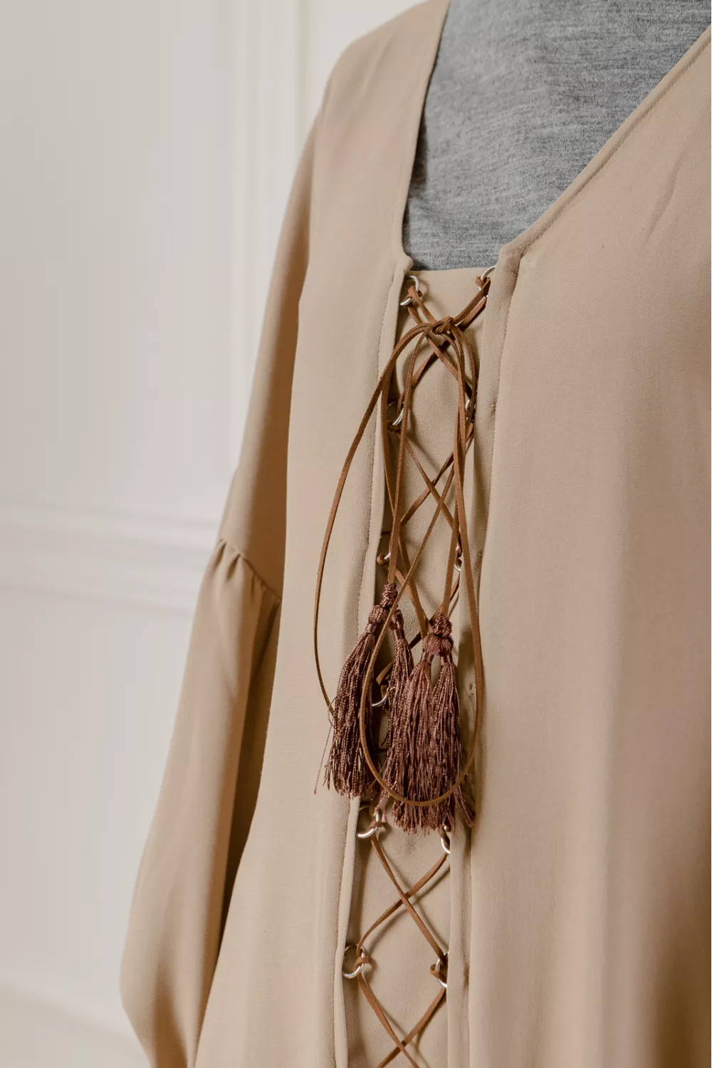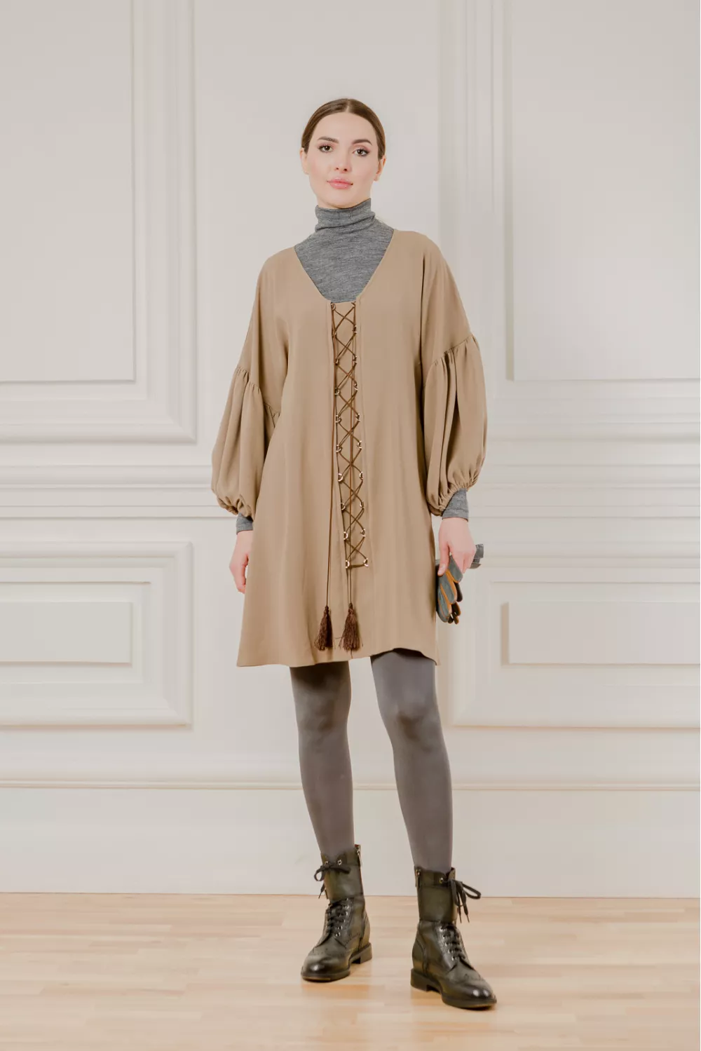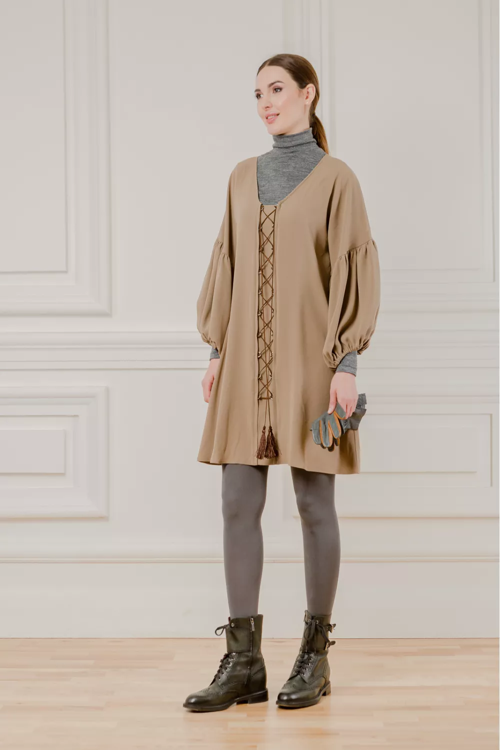 Легкое платье свободного кроя с широкими фактурными рукавами-фонариками. По всей длине декорирована петлями для завязок с кисточками