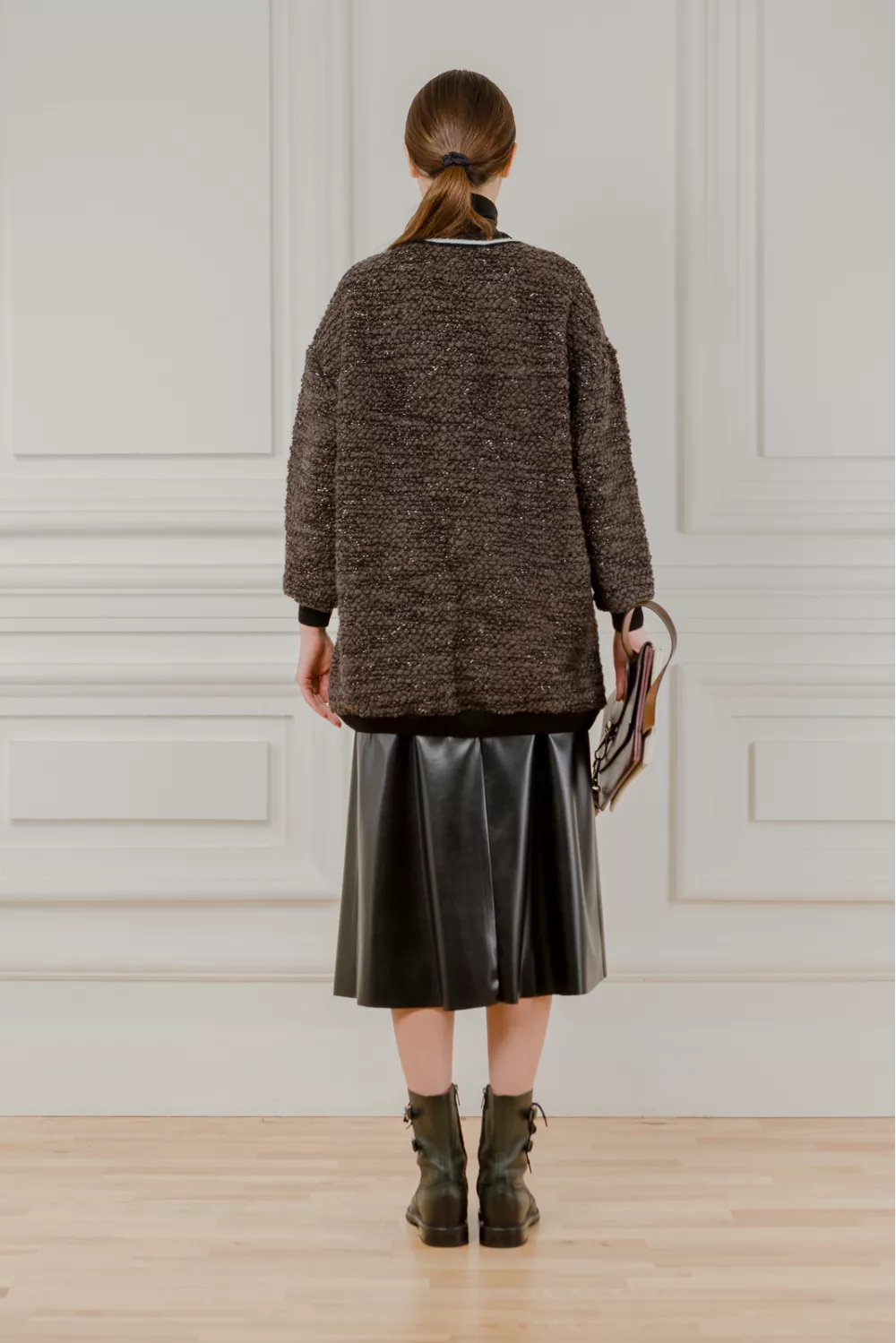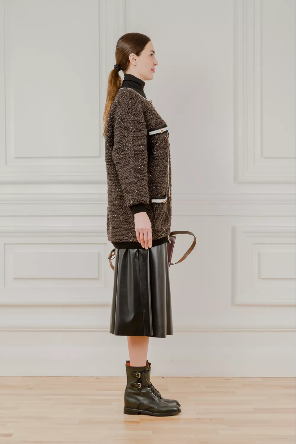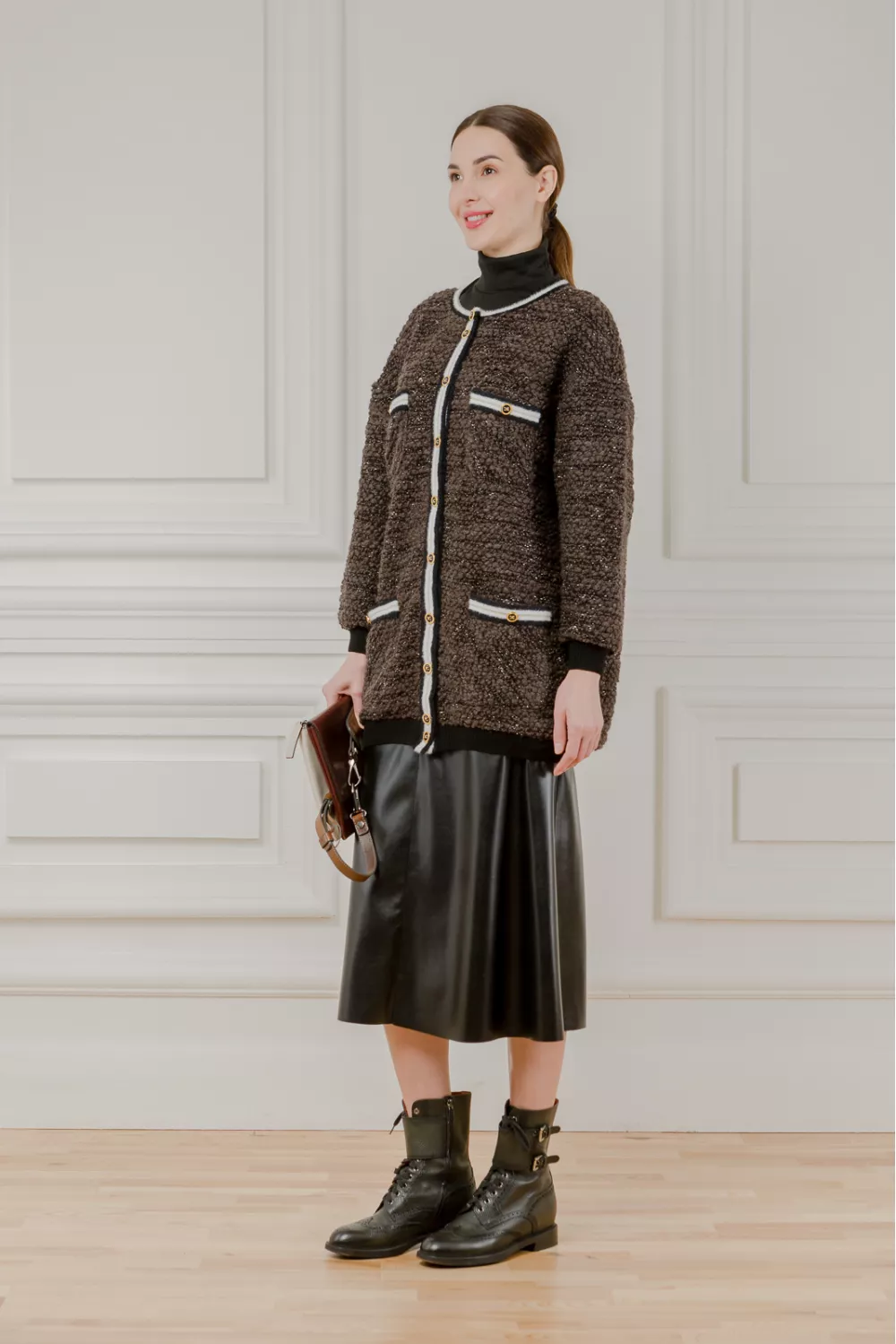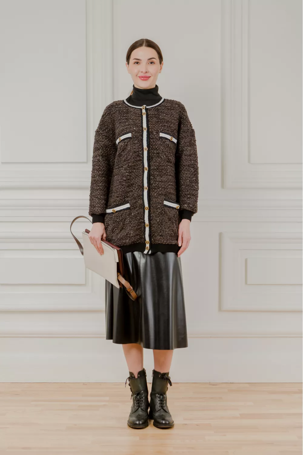 Длинный твидовый кардиган в стиле Шанель на пуговицах. Модель имеет укороченные рукава с манжетами, оверсайз покрой и две пары карманов. Кардиган хорошо сочетается с кожей, джинсом