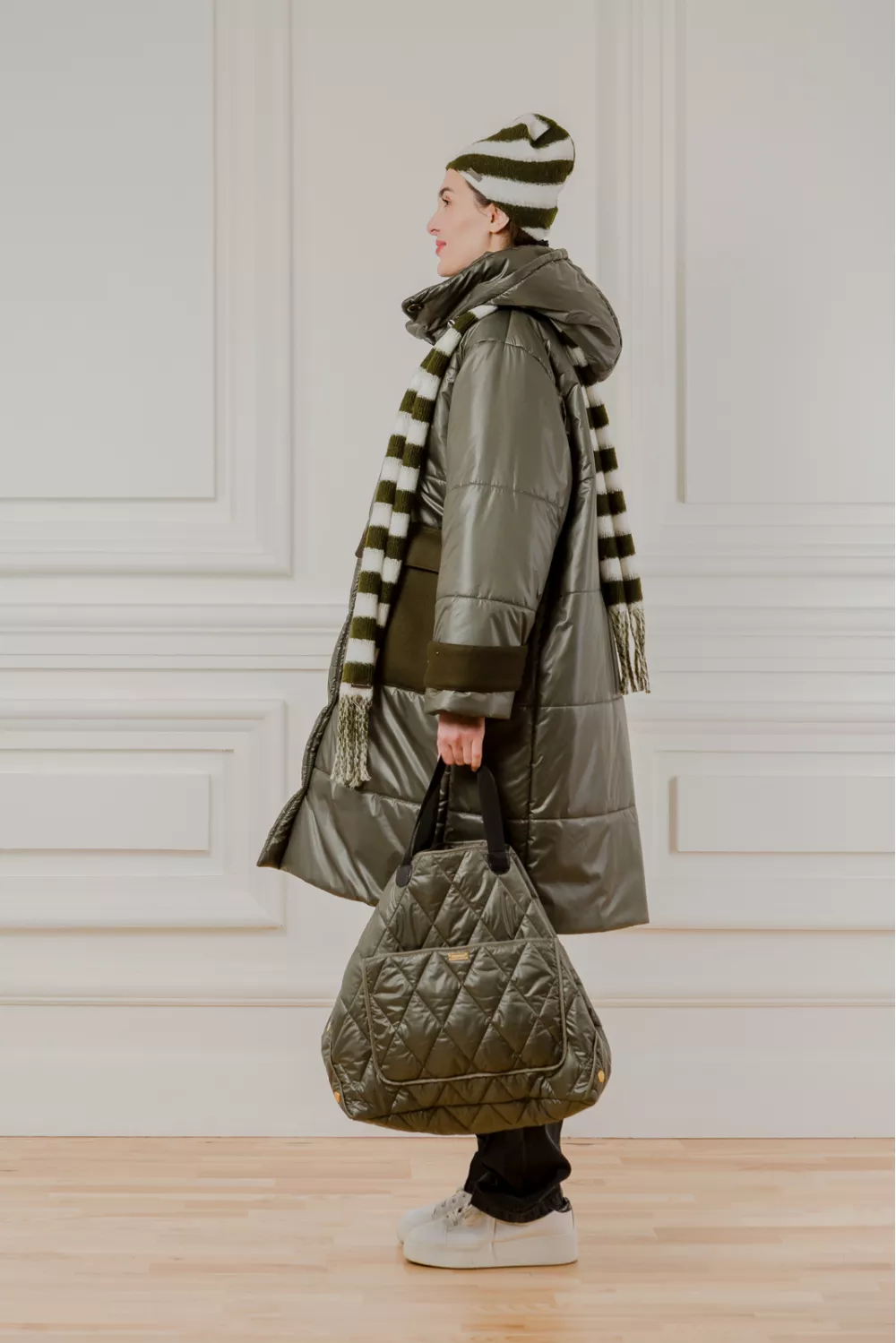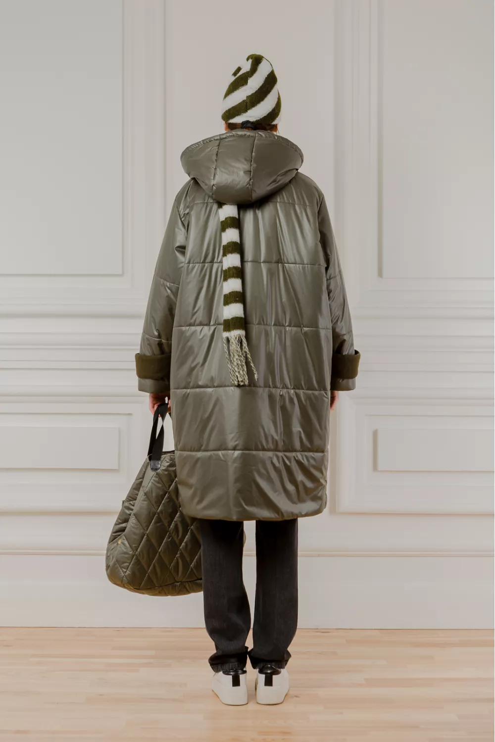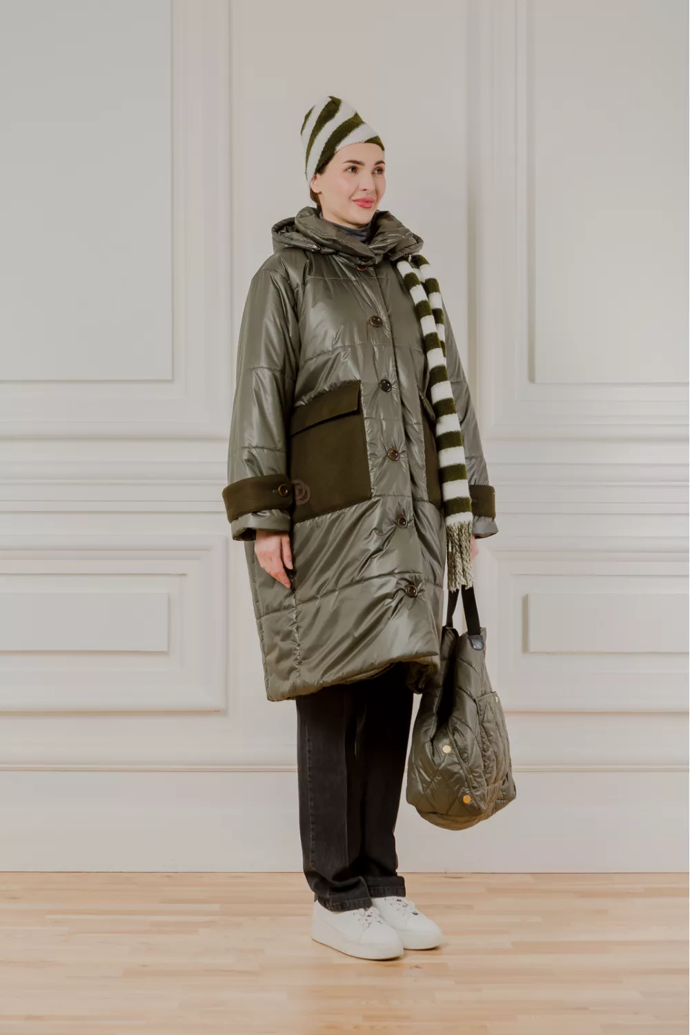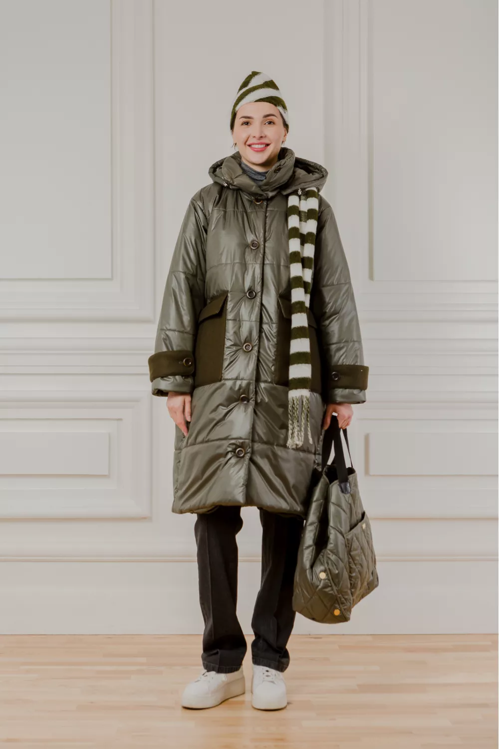 Теплая куртка миди на пуговицах по всей длине. Эта модель имеет характерную деталь – карманы из плотной ткани на которых вышитые фирменные инициалы бренда. Также у Брэдфорда есть высокий ворот и полноценный капюшон, что позволяет защитить себя от ветра и морозов, при этом даже не используя в образе шарфы