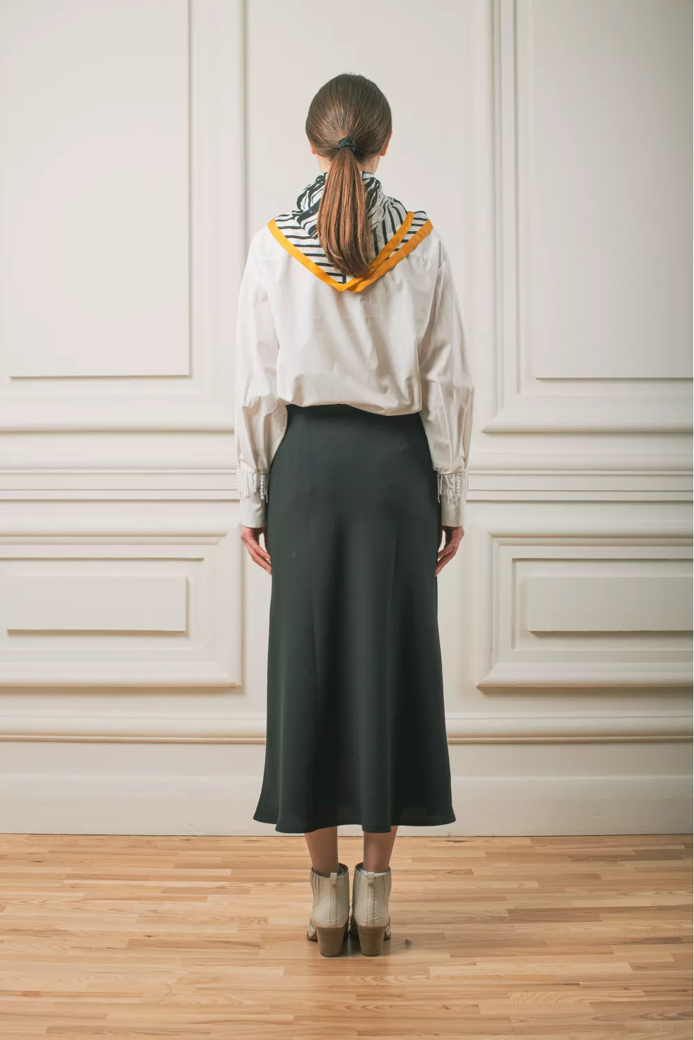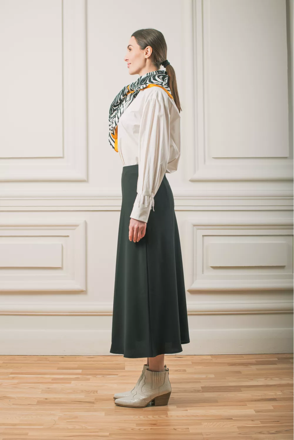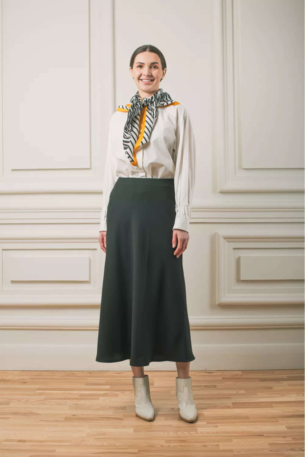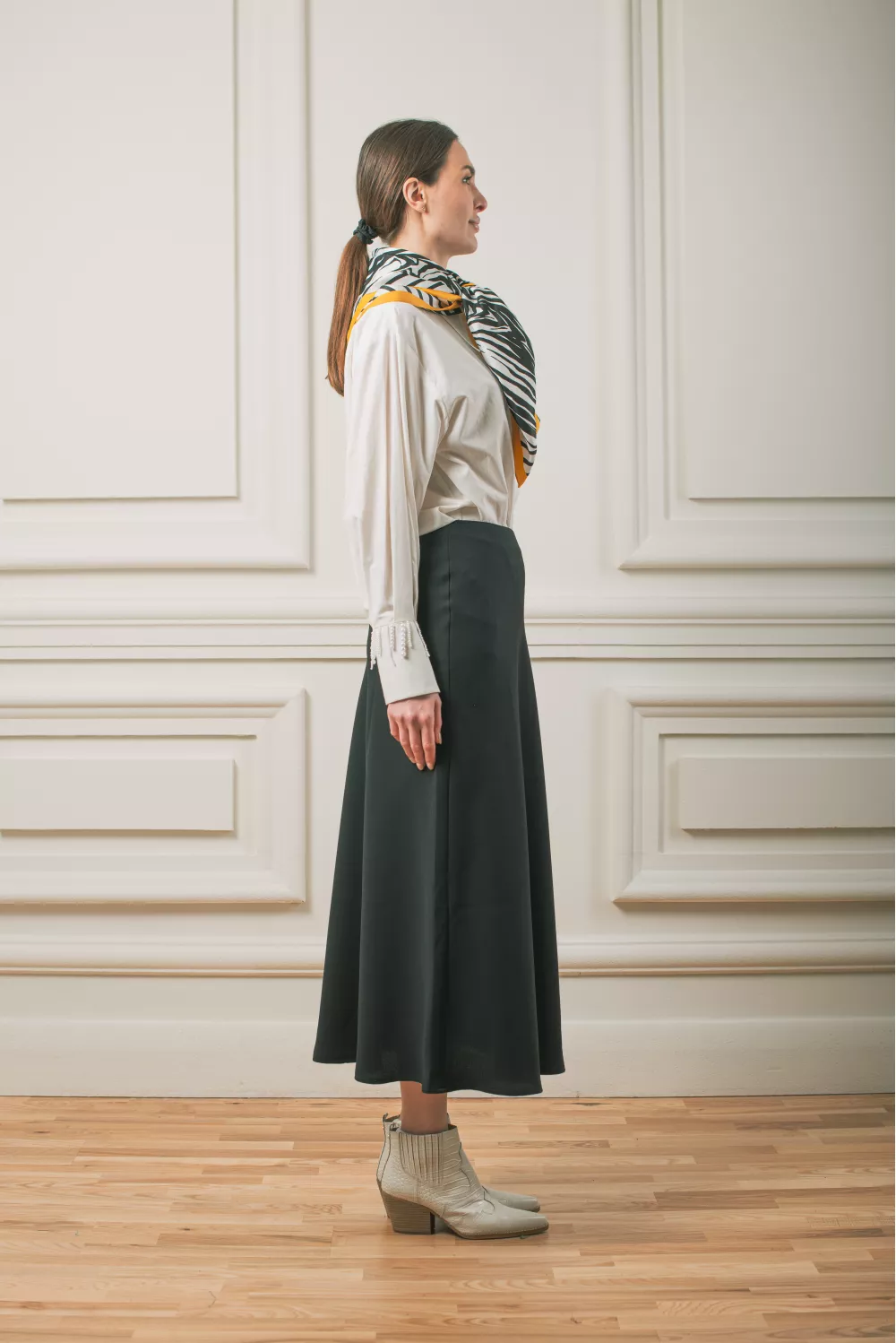 Матовая юбка меди длины свободного кроя. Можно сочетать с блузами, гольфами и даже свитшотами, поэтому однозначно станет базой