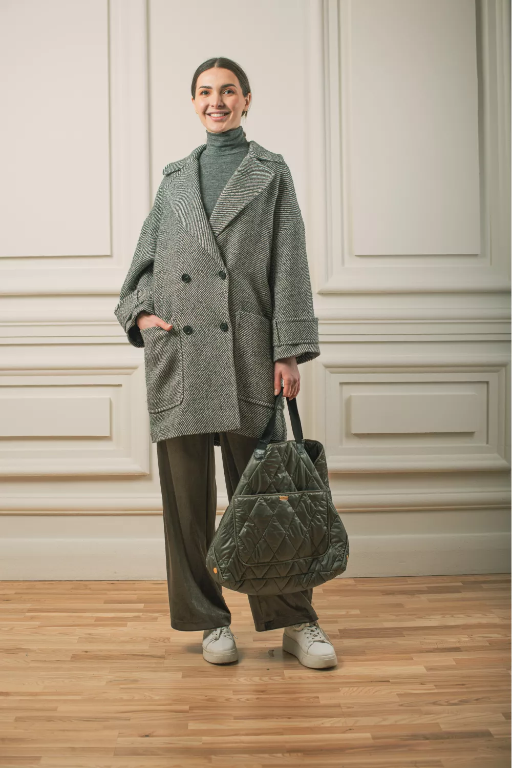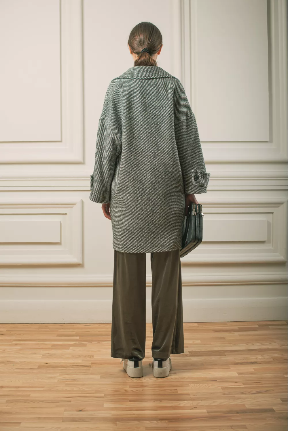 Оверсайз пальто с большими накладными карманами. Модель имеет крутую текстуру ткани и детализирована дополнительными регуляторами на рукавах