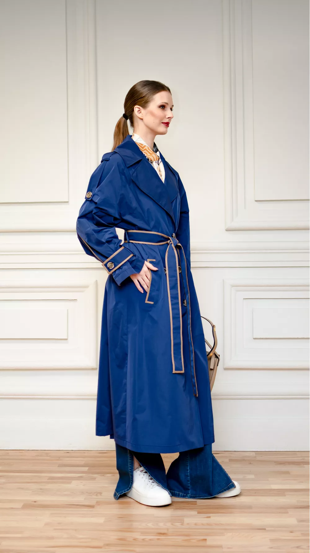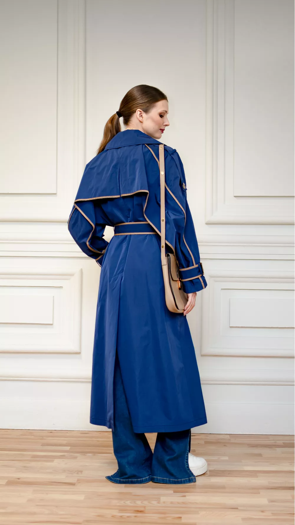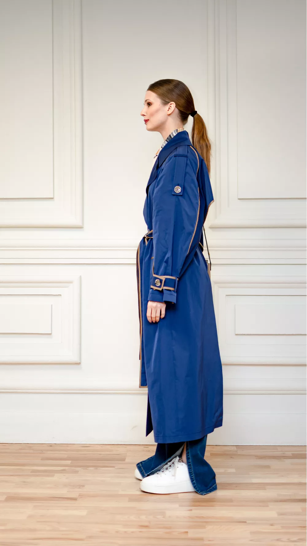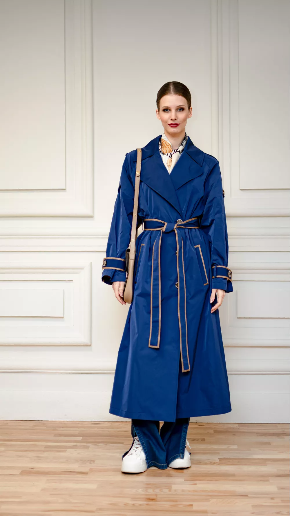 Легкий весенний плащ украшен цветными кантами. Эта модель станет стильным решением для вас и будет актуальна даже в прохладные дождливые летние дни, поэтому является незаменимой частью гардероба