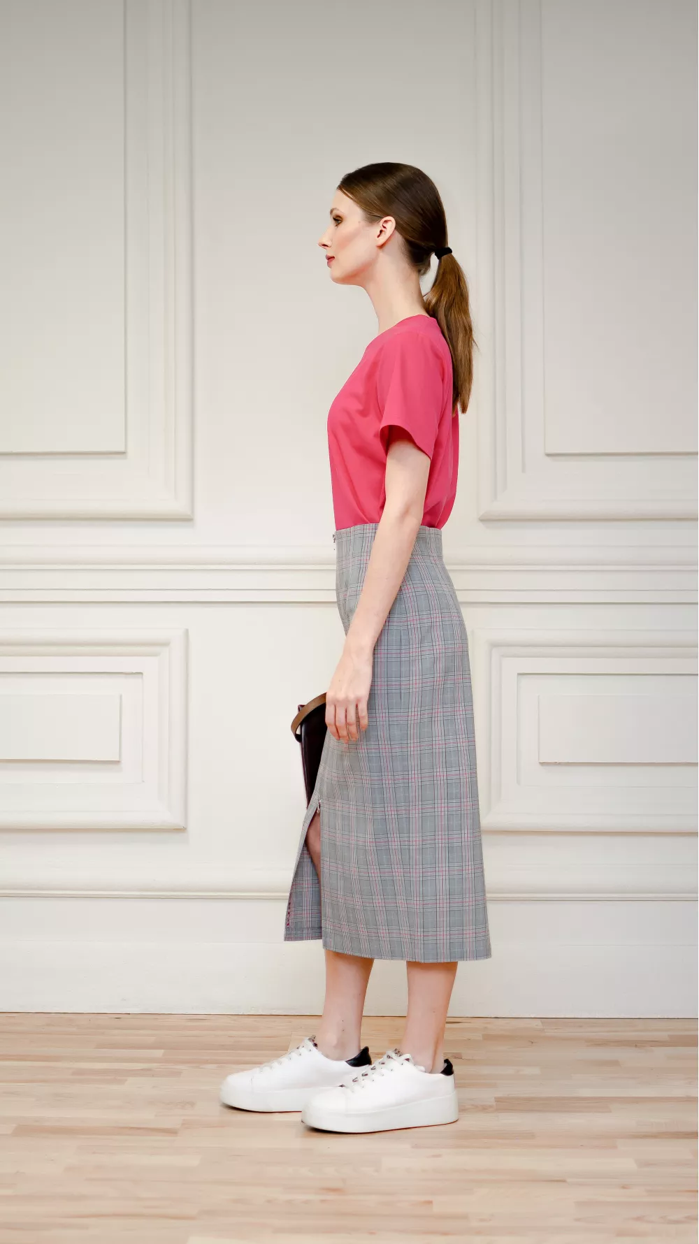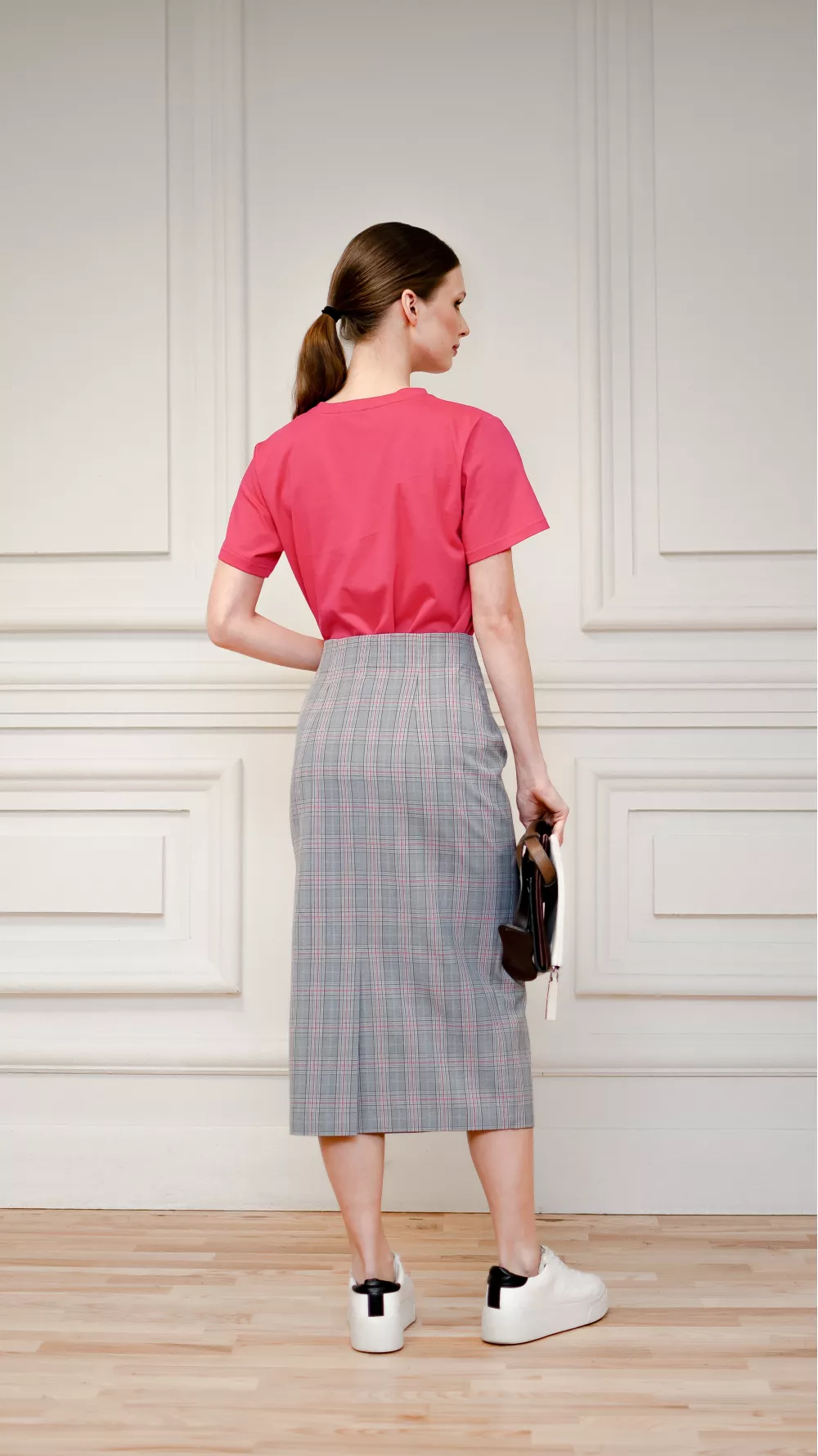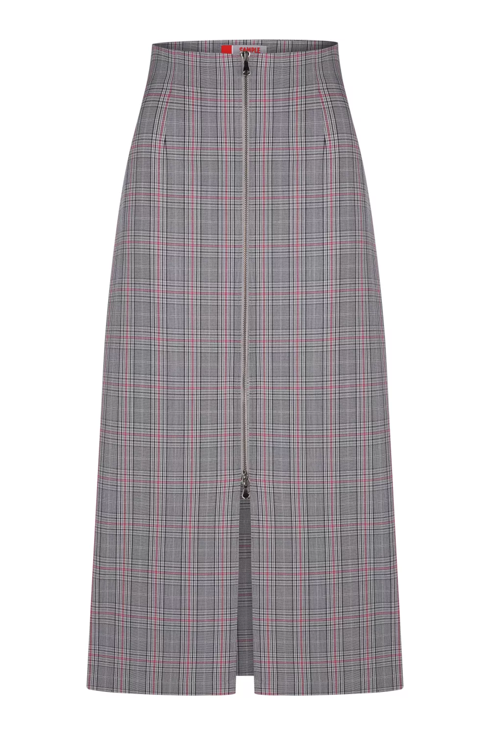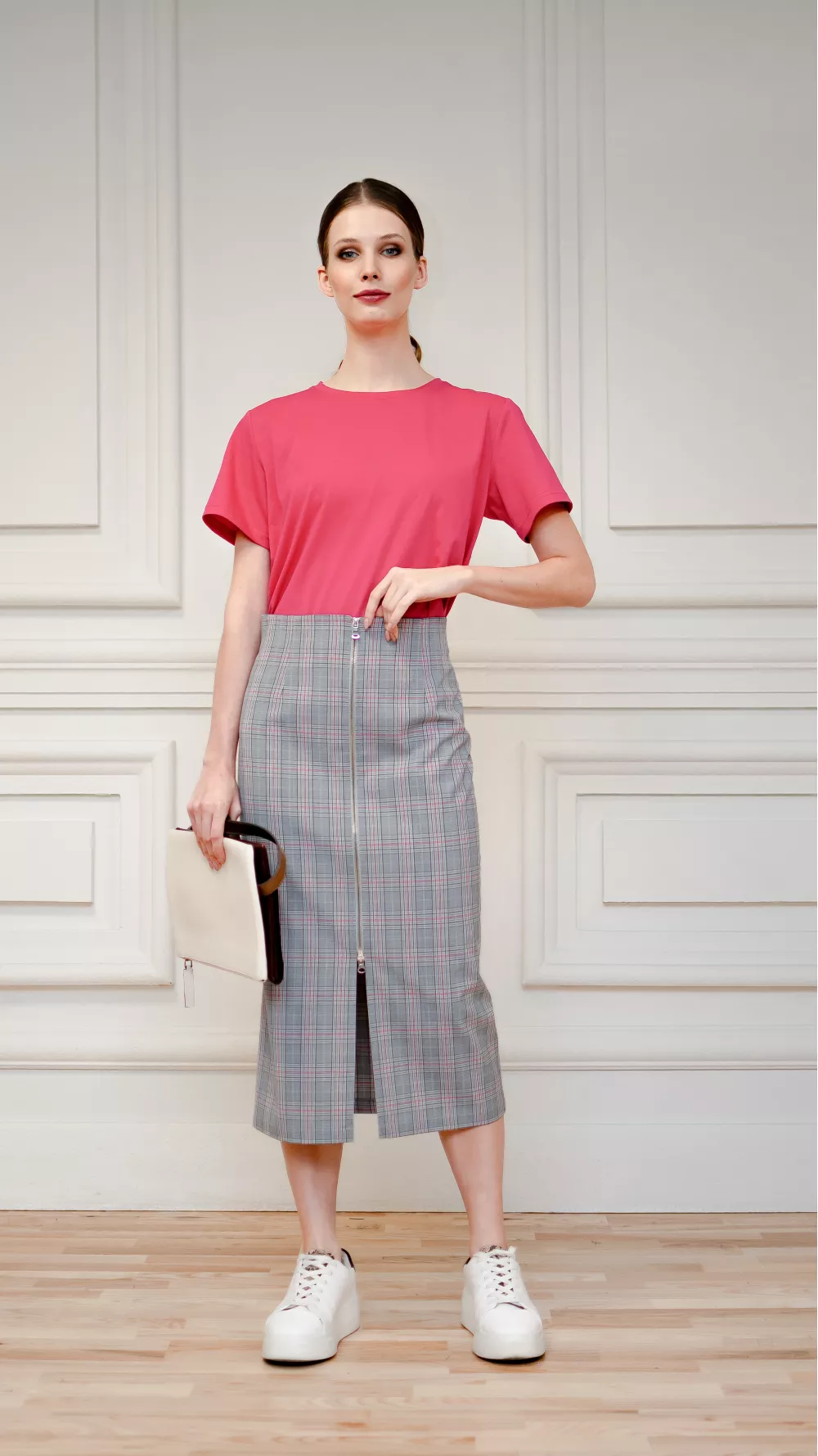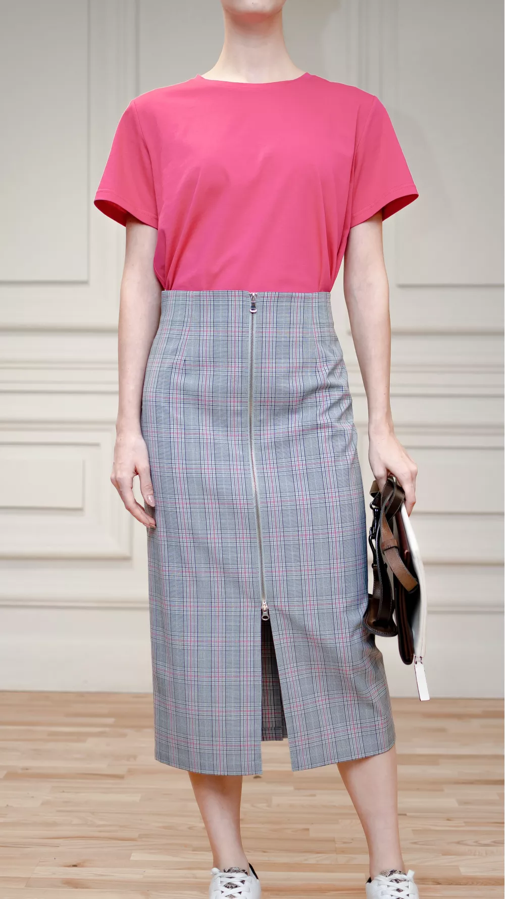 Модель имеет нестандартное расположение молнии спереди по всей длине юбки, разбавляет ее деловой стиль