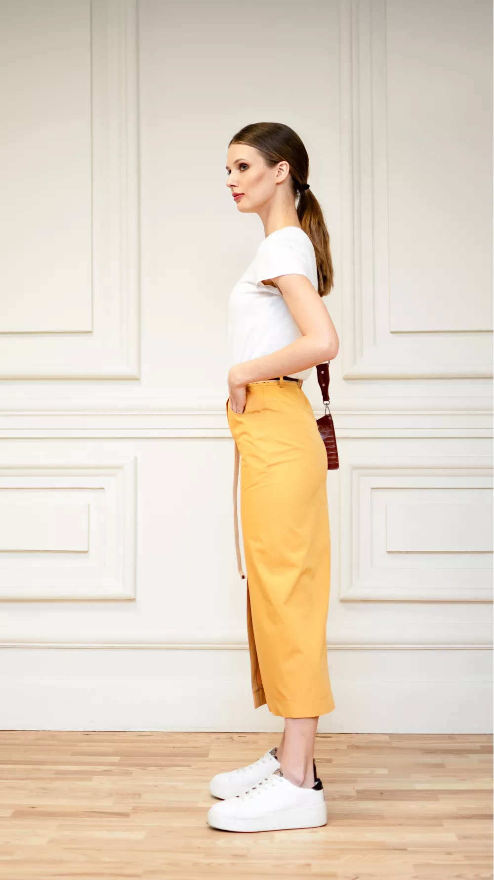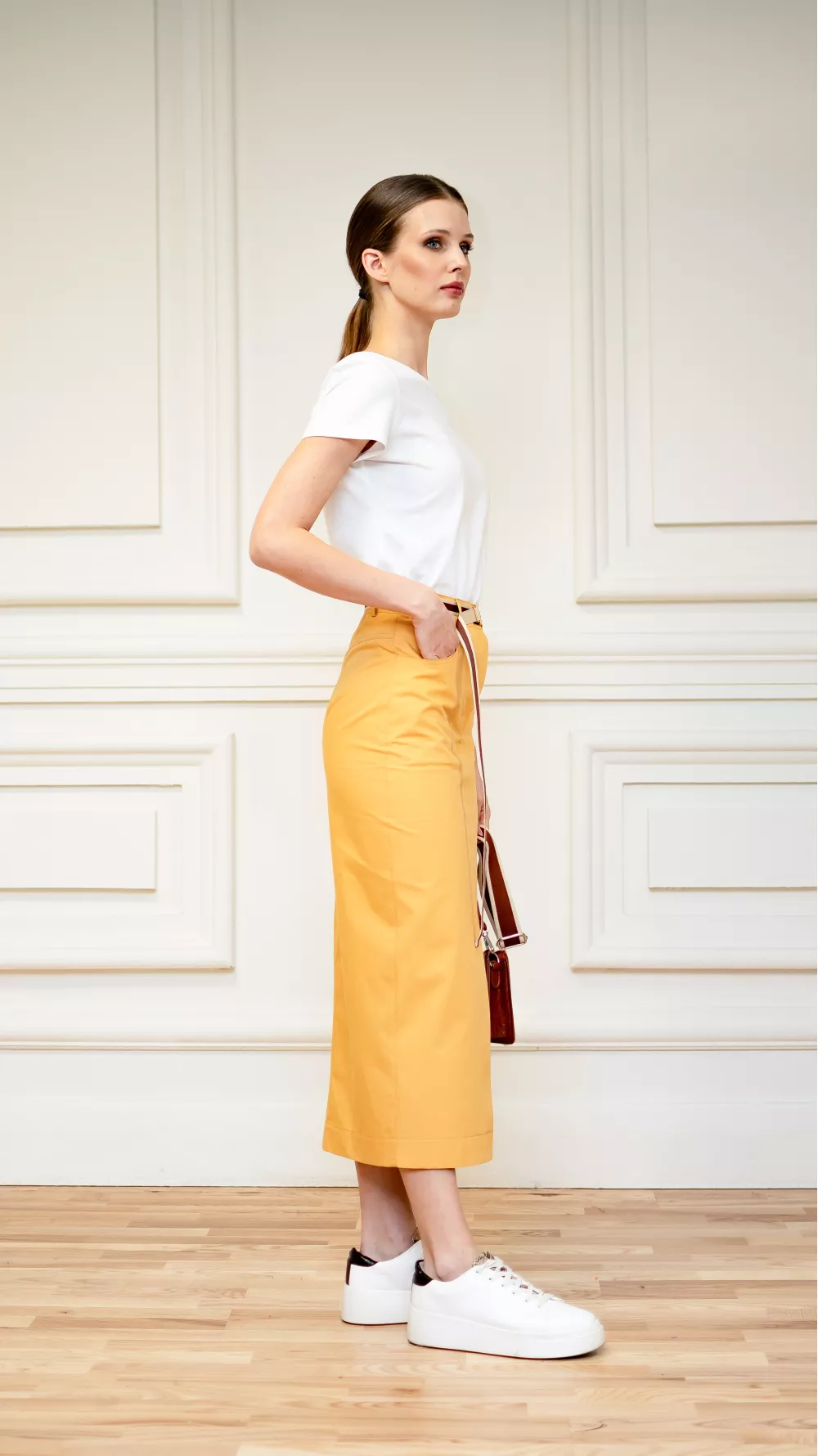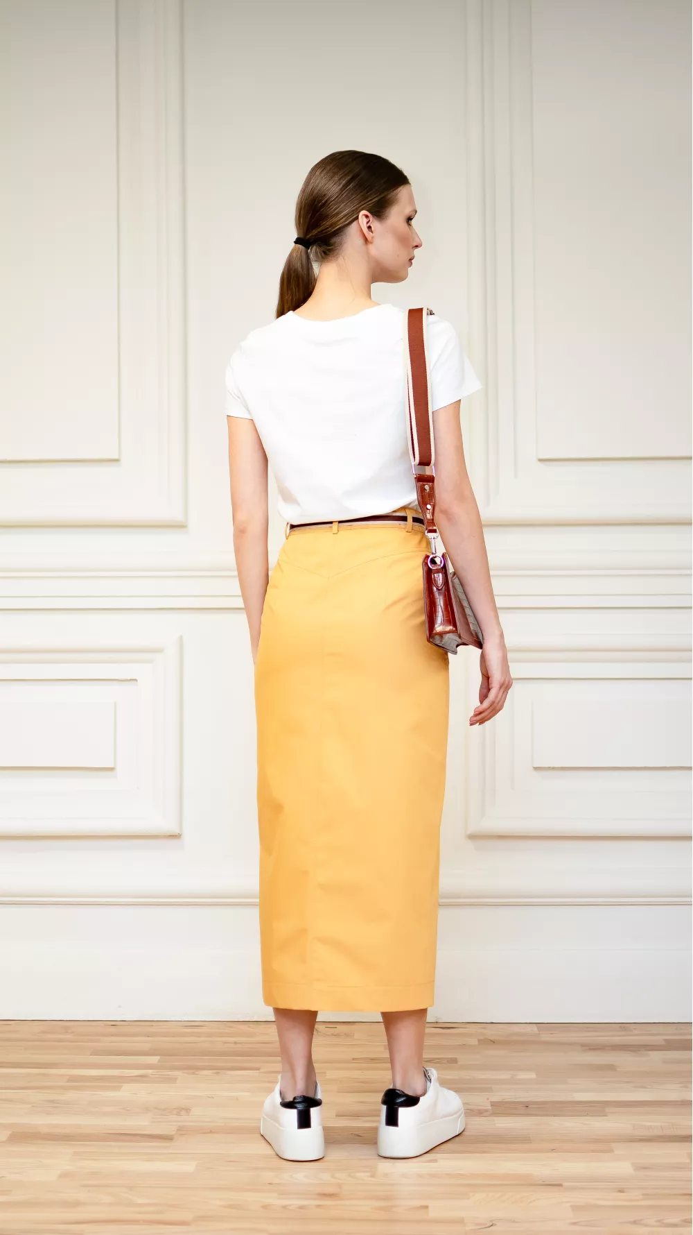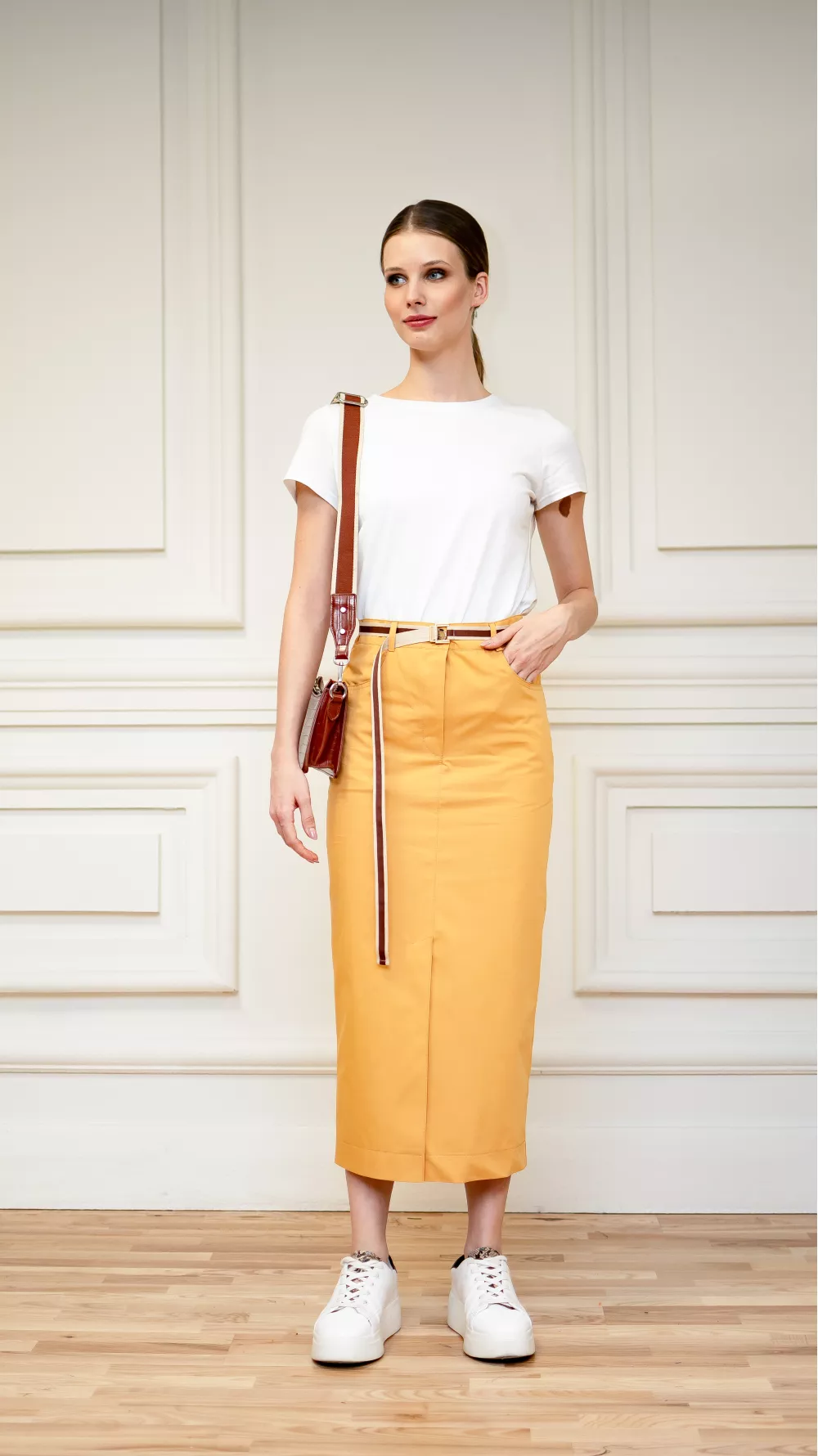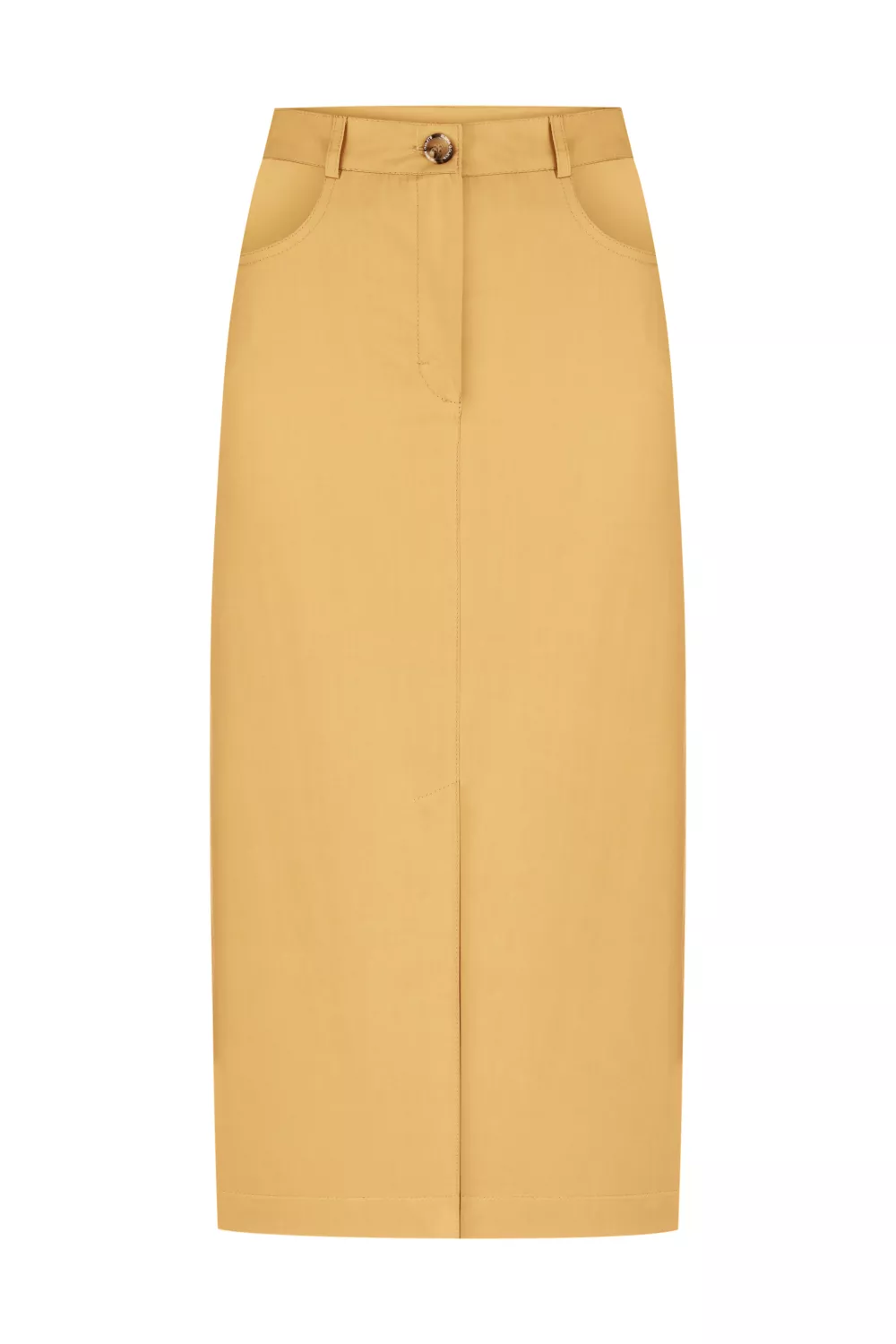 Прямая юбка-карандаш меди длины с разрезом до колен. Однотонный цвет и качественный плотный хлопок делают модель универсальной для повседневной носки