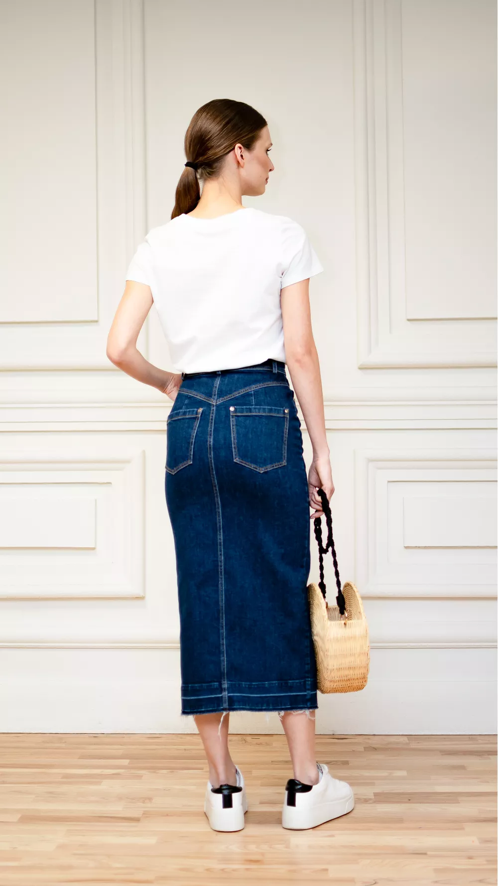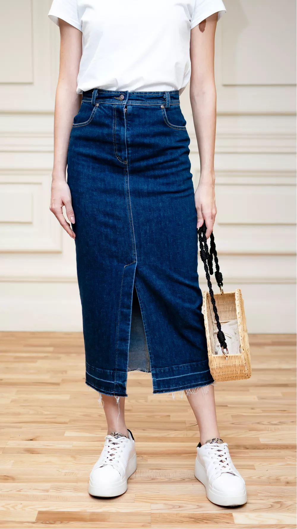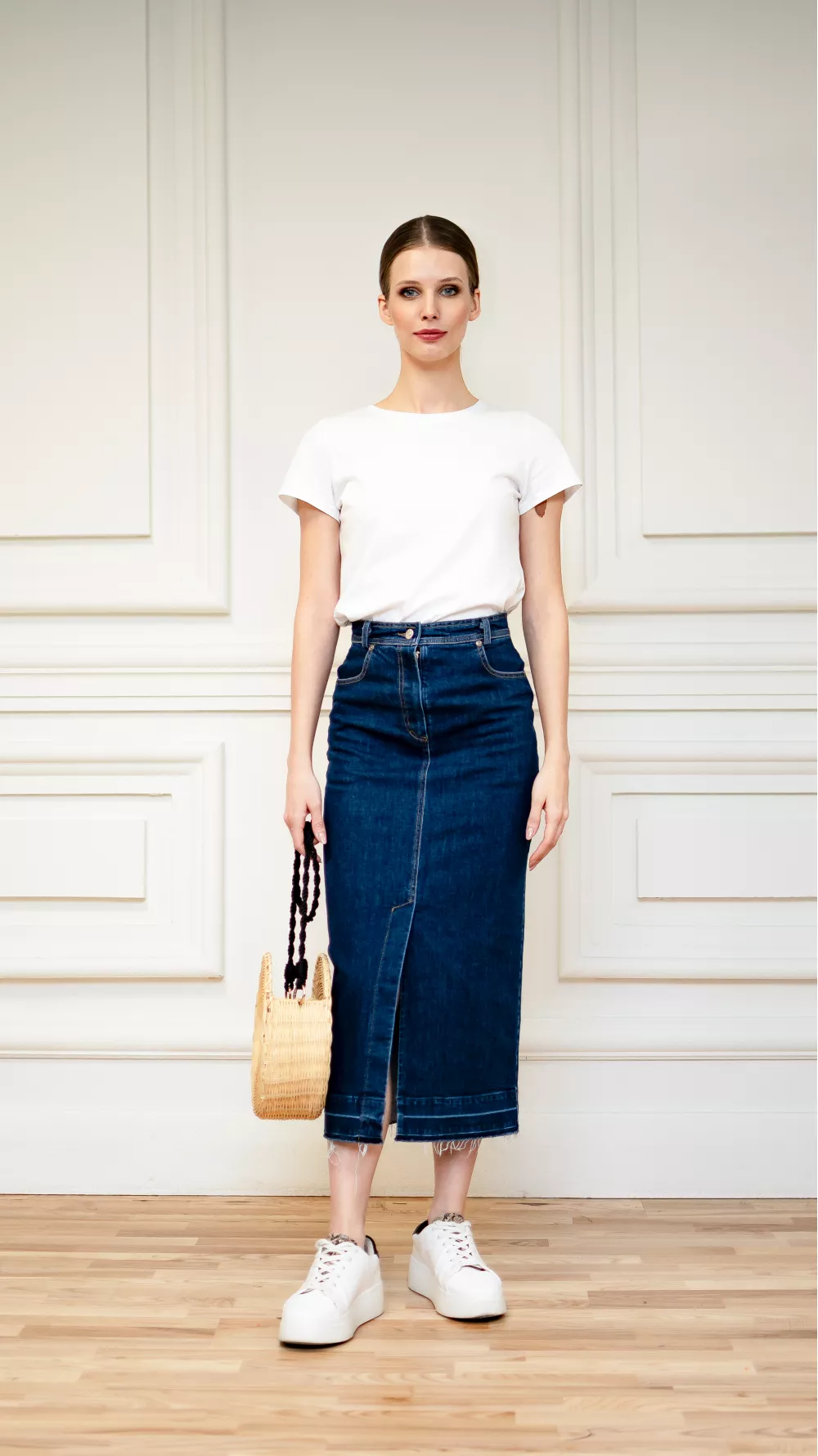 Прямая юбка-карандаш меди длины с разрезом до колен. Однотонный цвет и качественный плотный хлопок делают модель универсальной для повседневной носки
