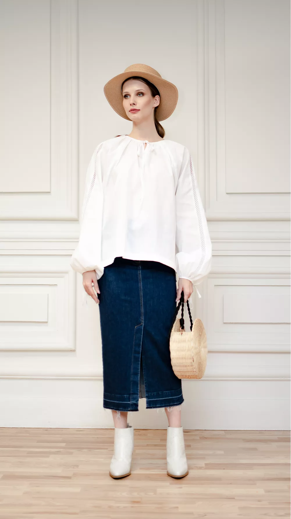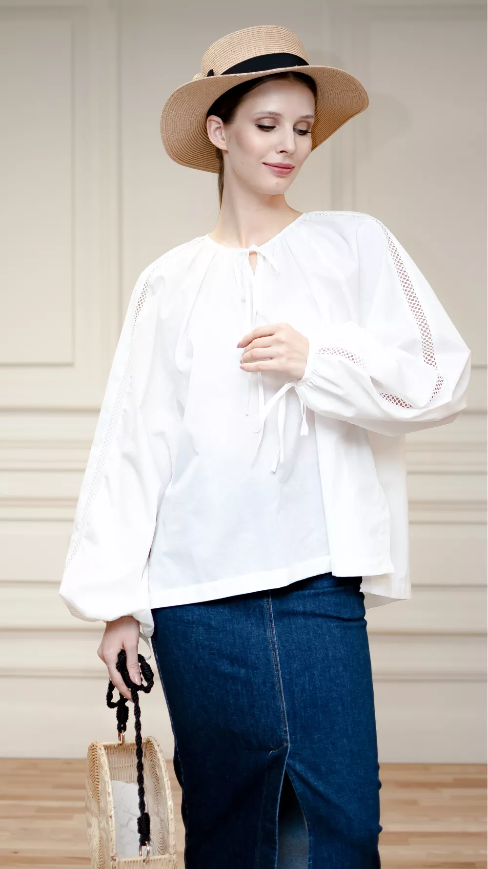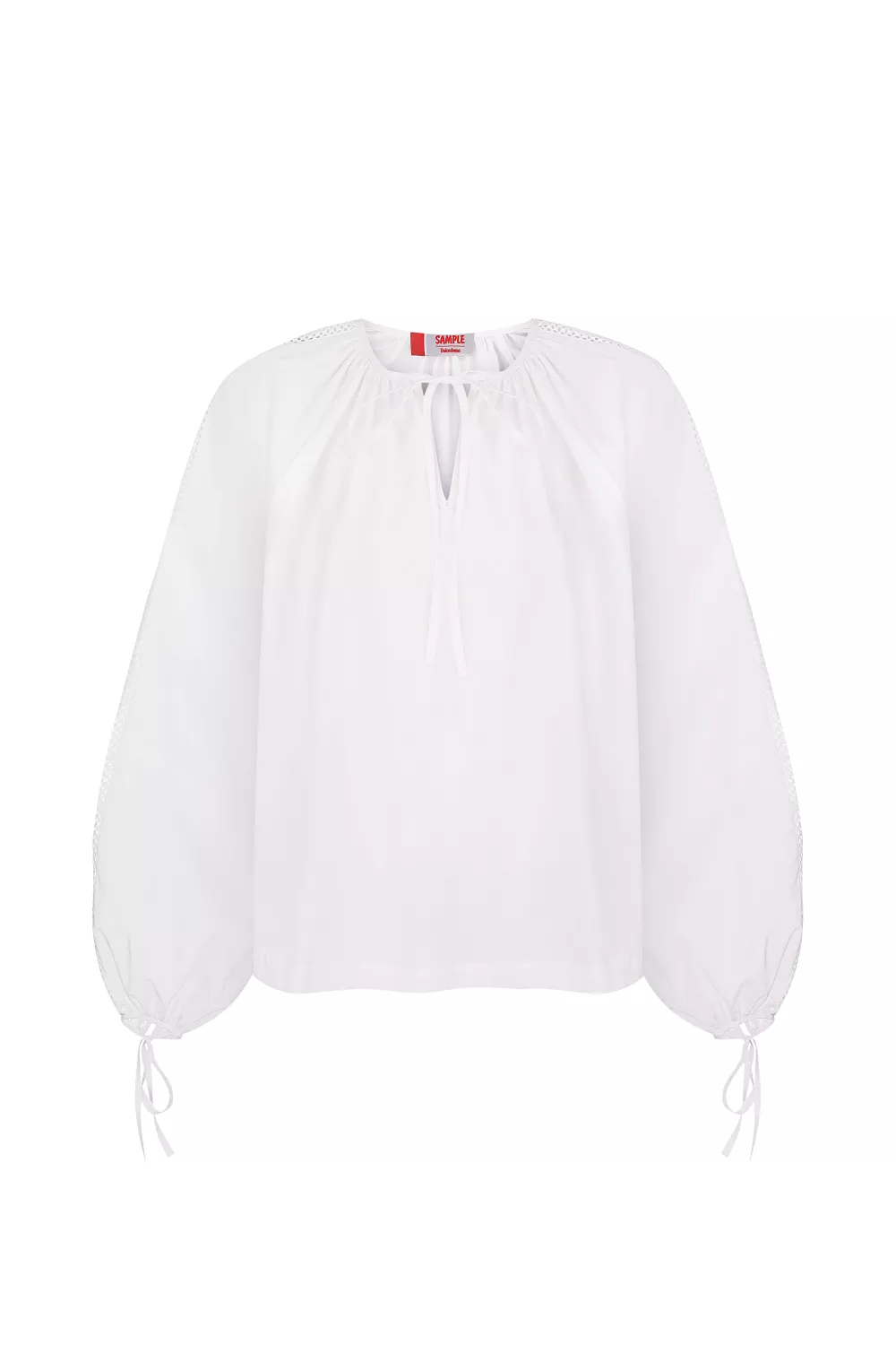 Просторная легкая блузка прямого кроя с пышными рукавами на завязках. Модель имеет также изящные вырезы по длине рукава