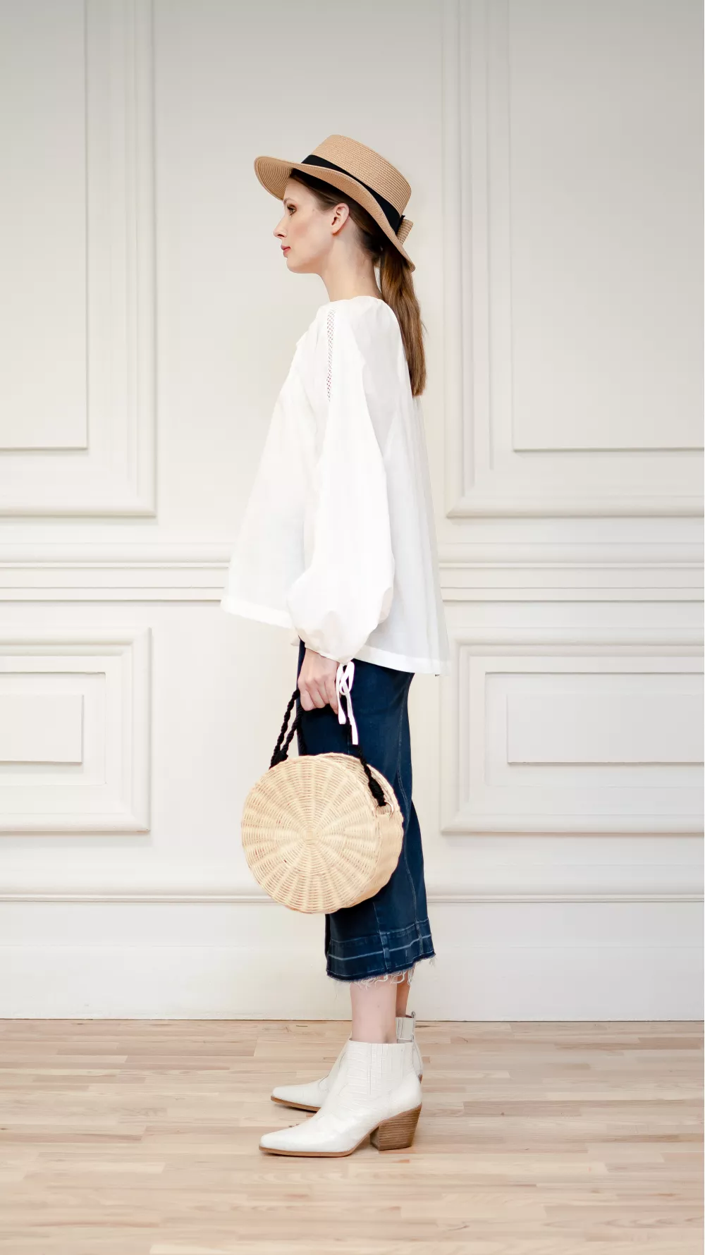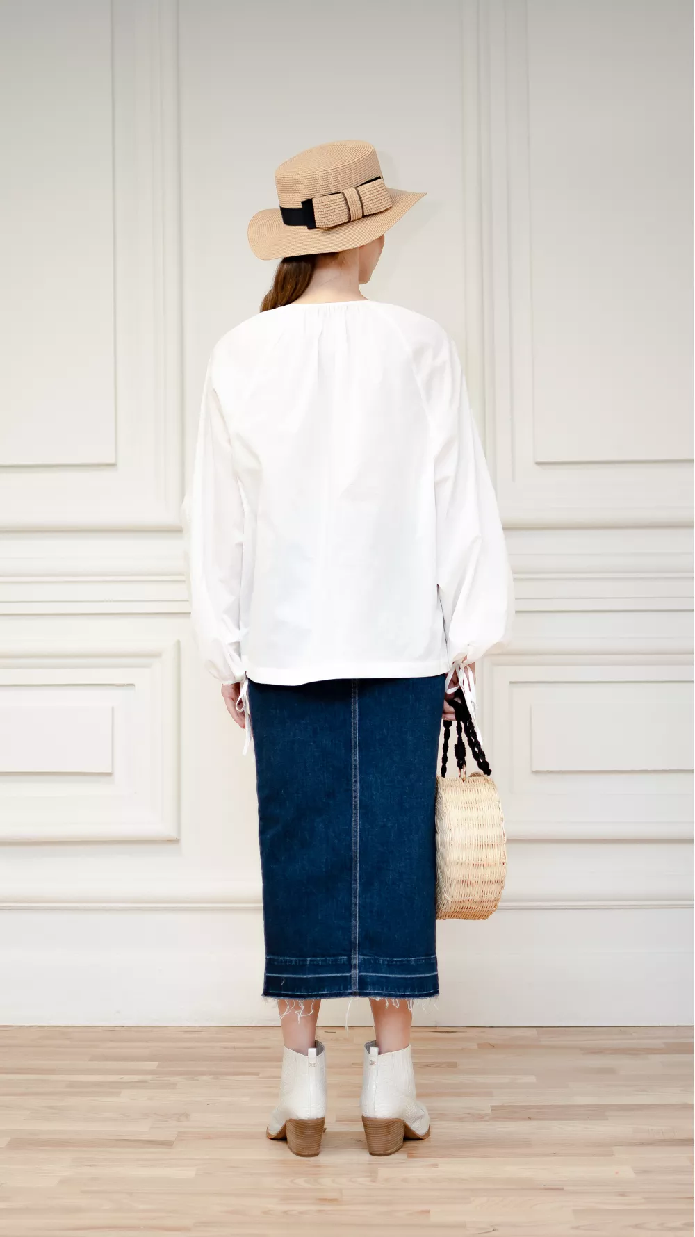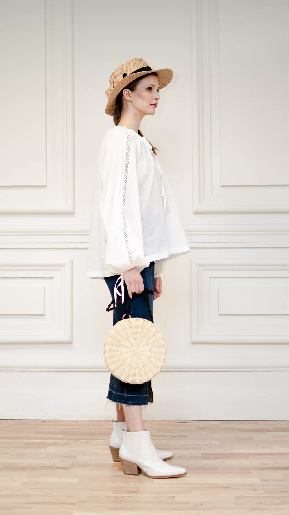 Просторная легкая блузка прямого кроя с пышными рукавами на завязках. Модель имеет также изящные вырезы по длине рукава