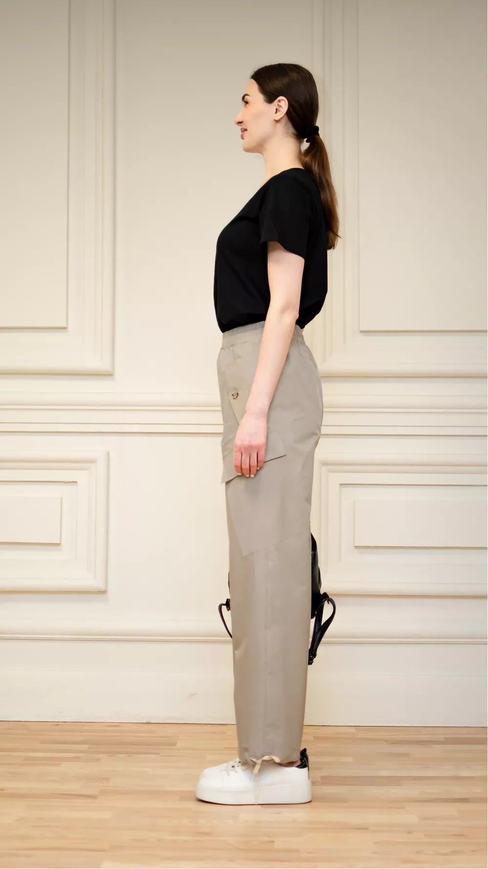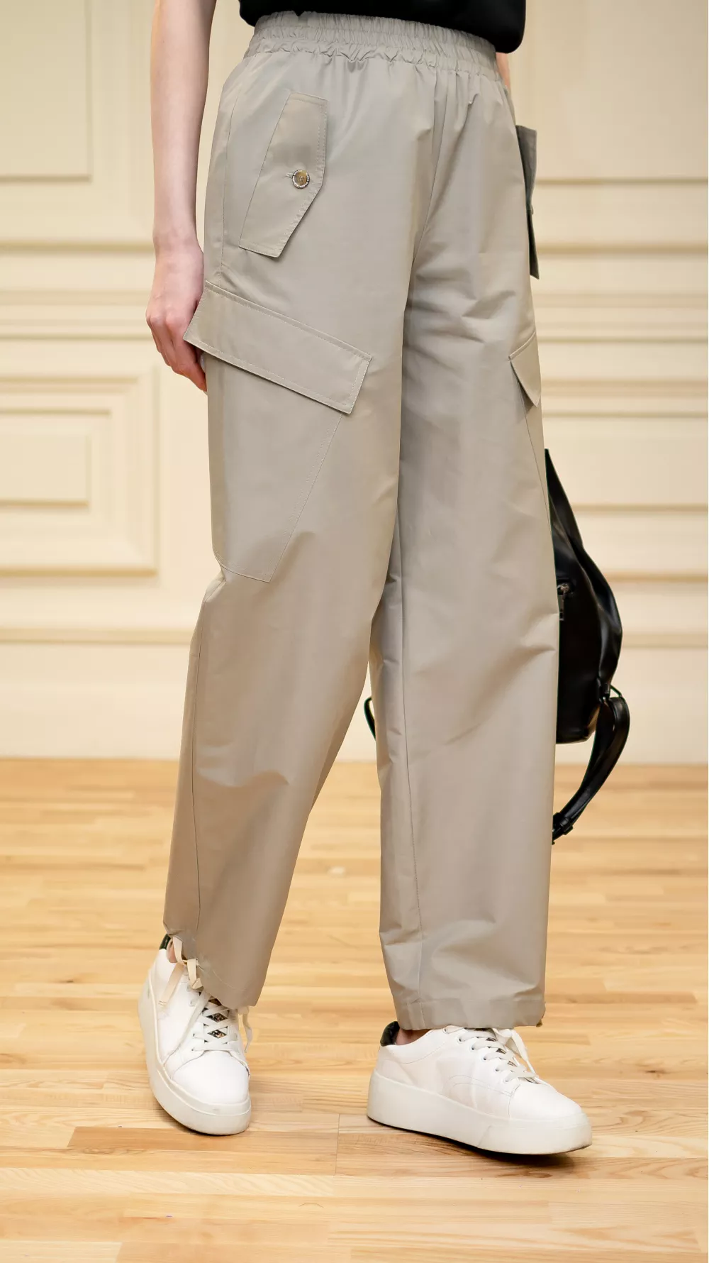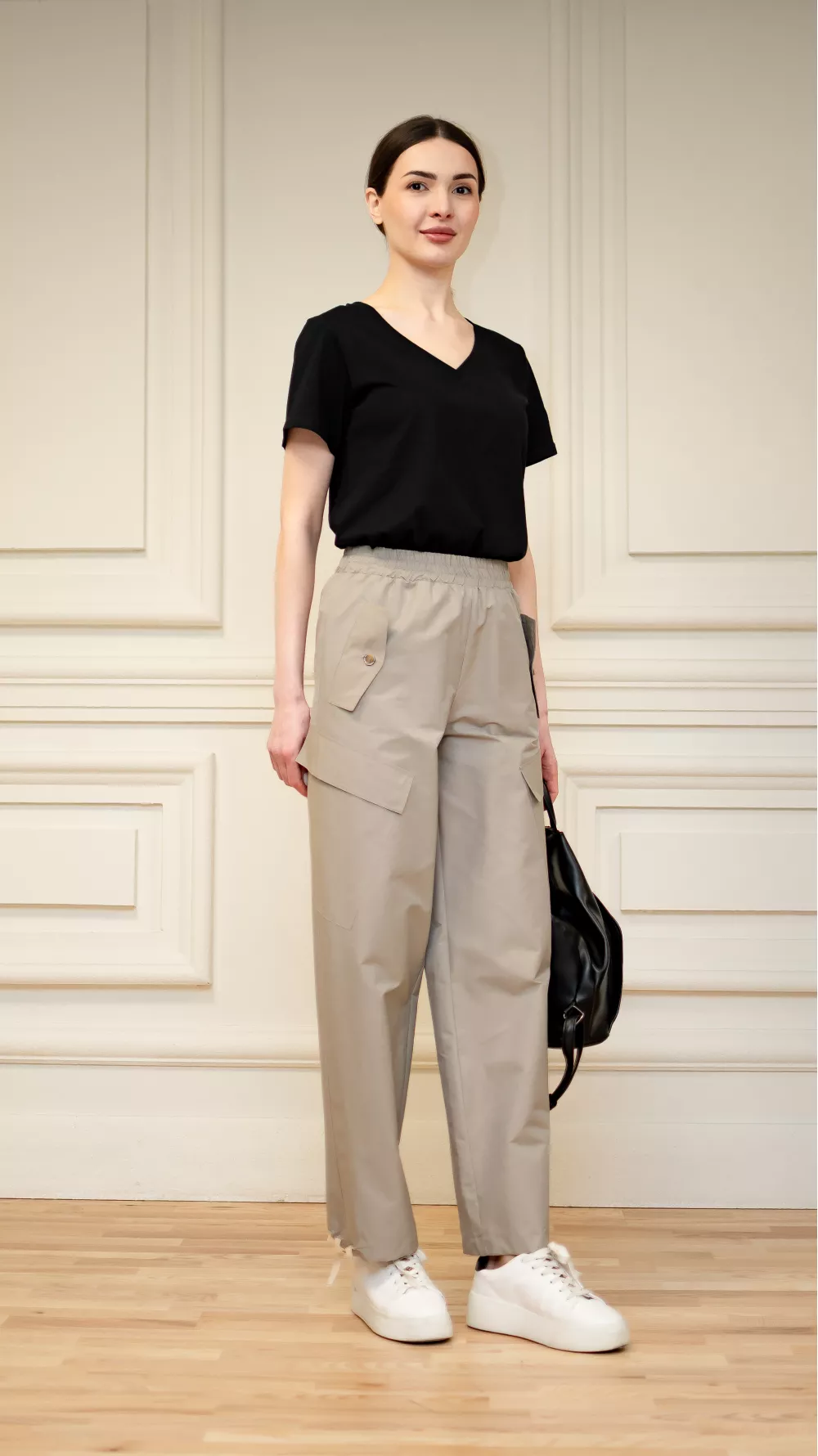 Трендовые брюки в спортивном стиле с накладными карманами и дополнительными завязками, регулируемыми снизу