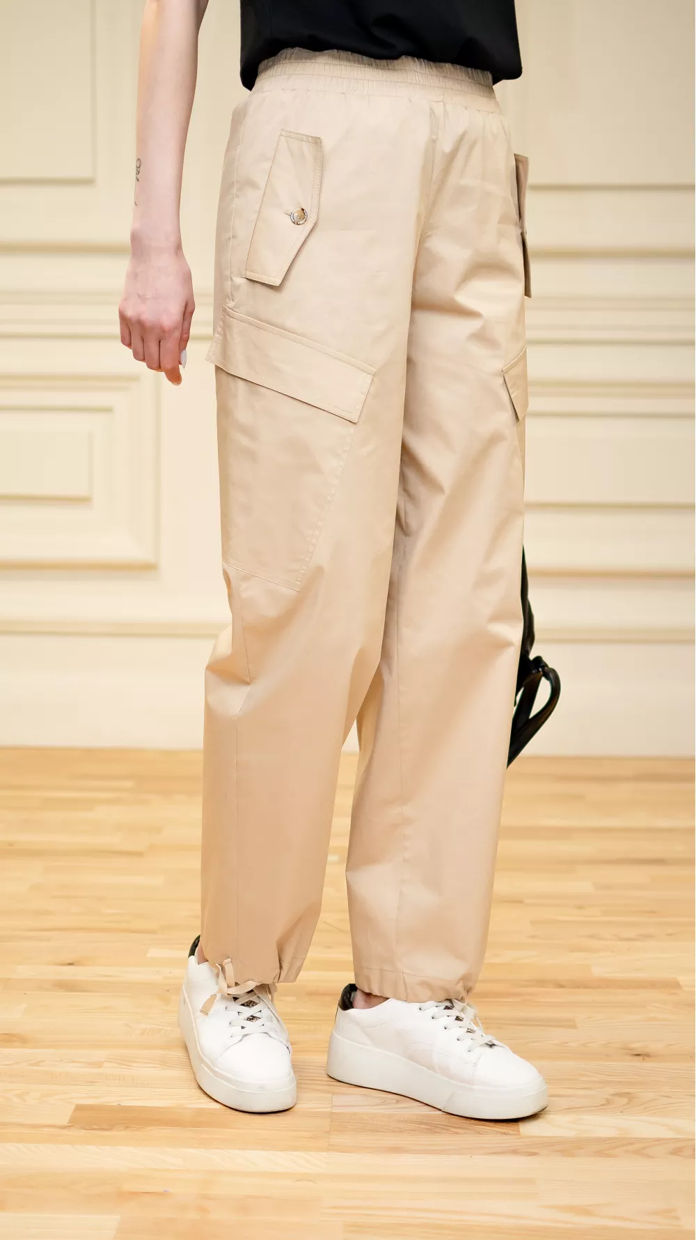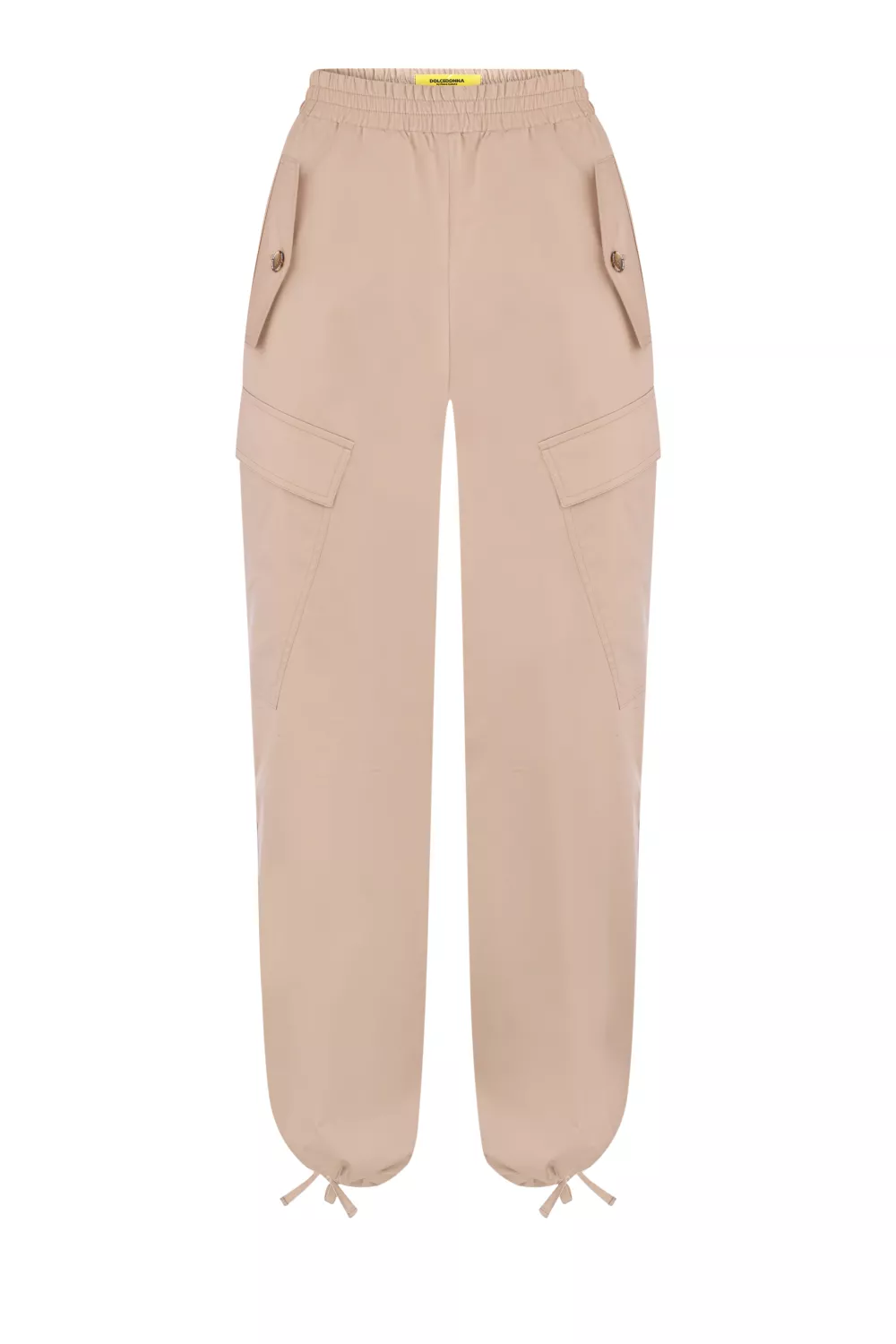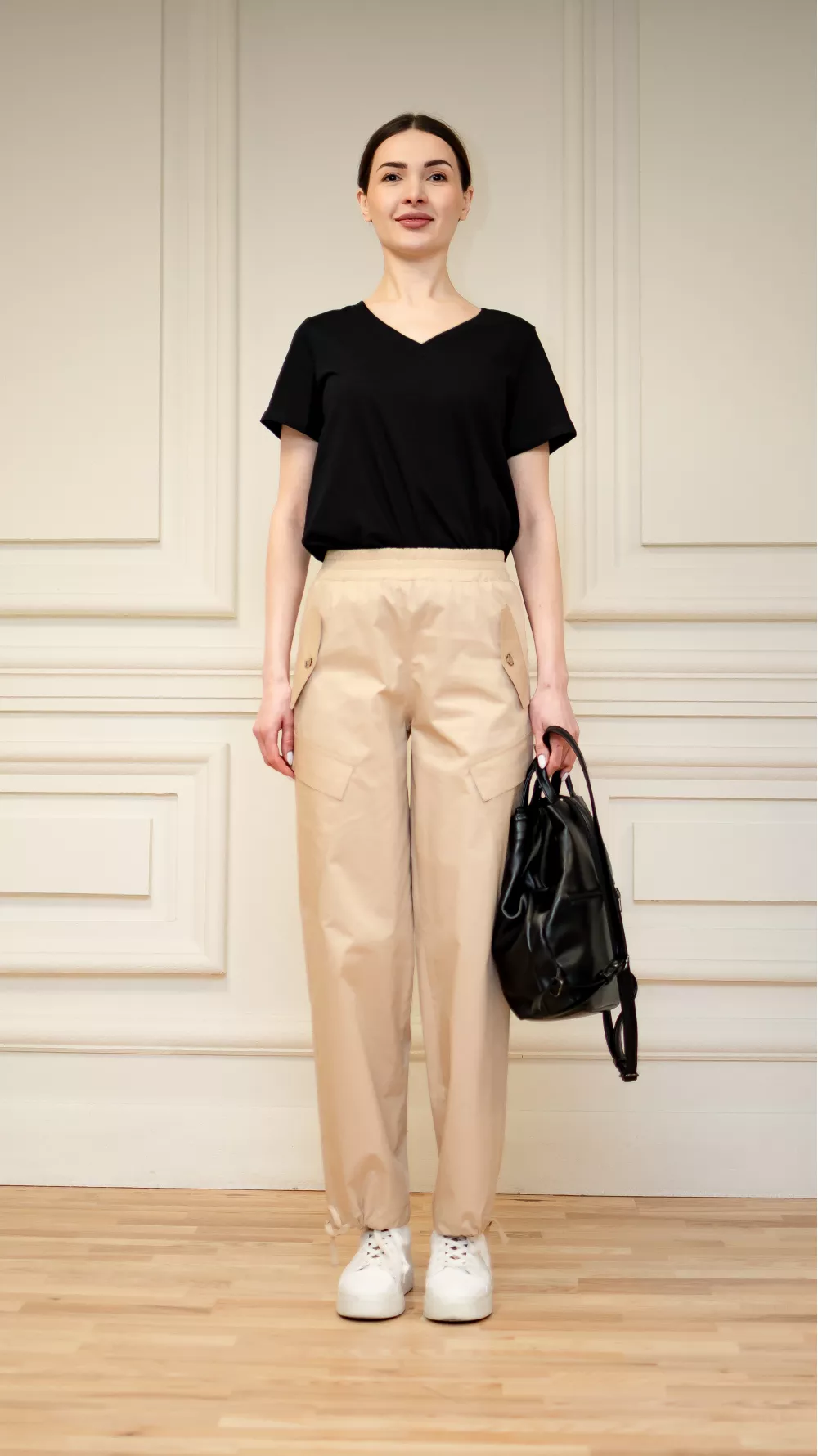 Трендовые брюки в спортивном стиле с накладными карманами и дополнительными завязками, регулируемыми снизу