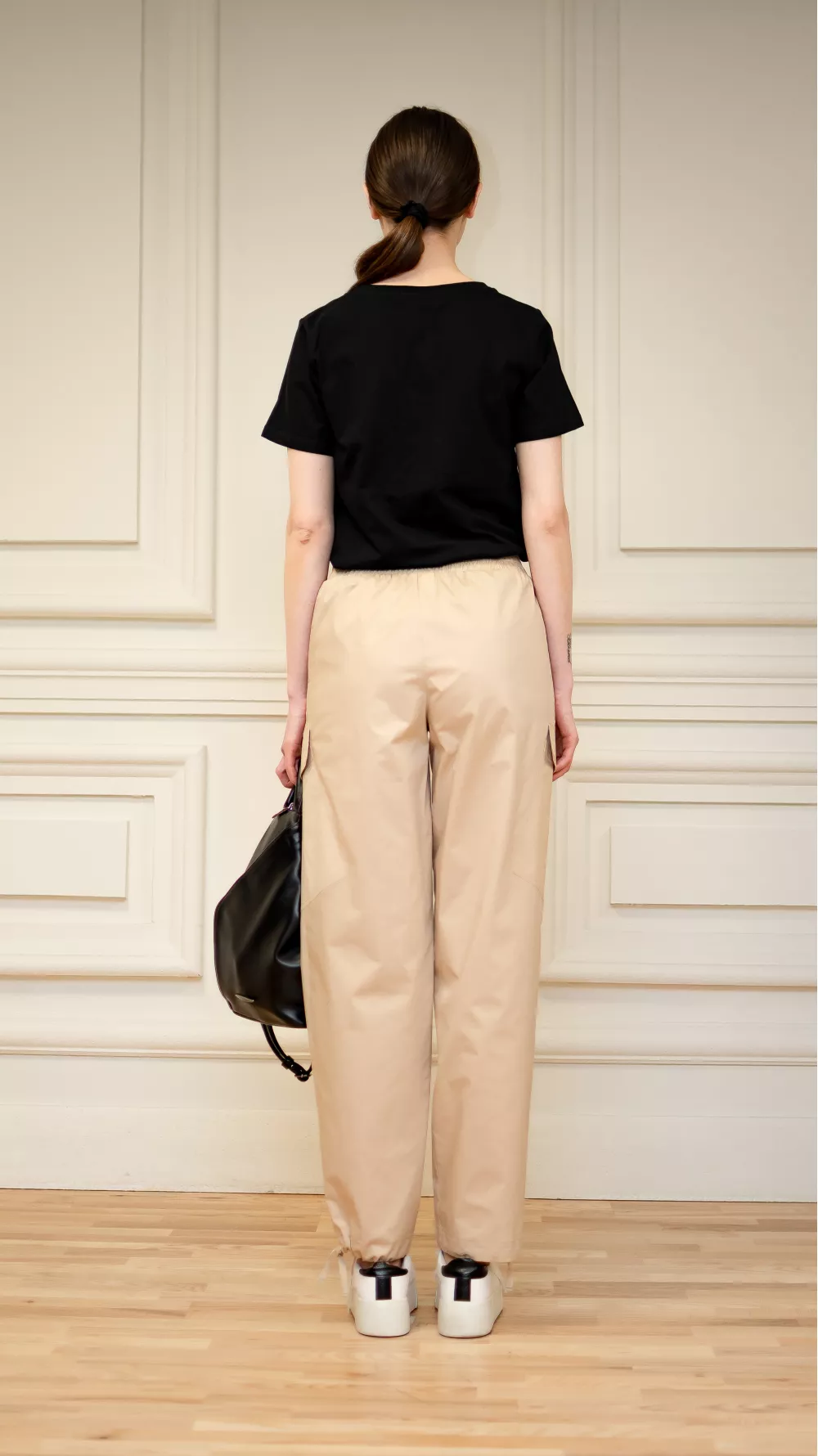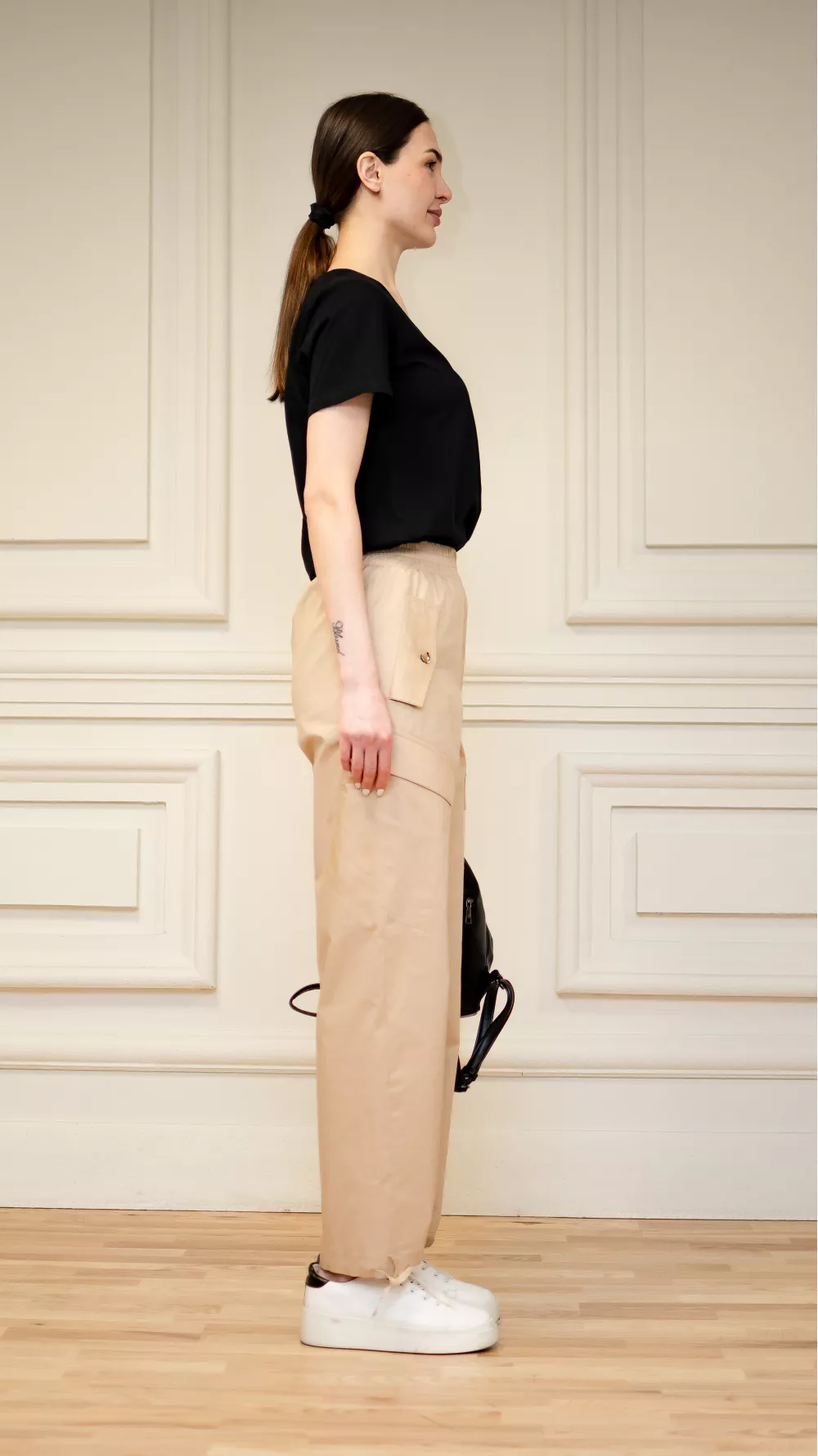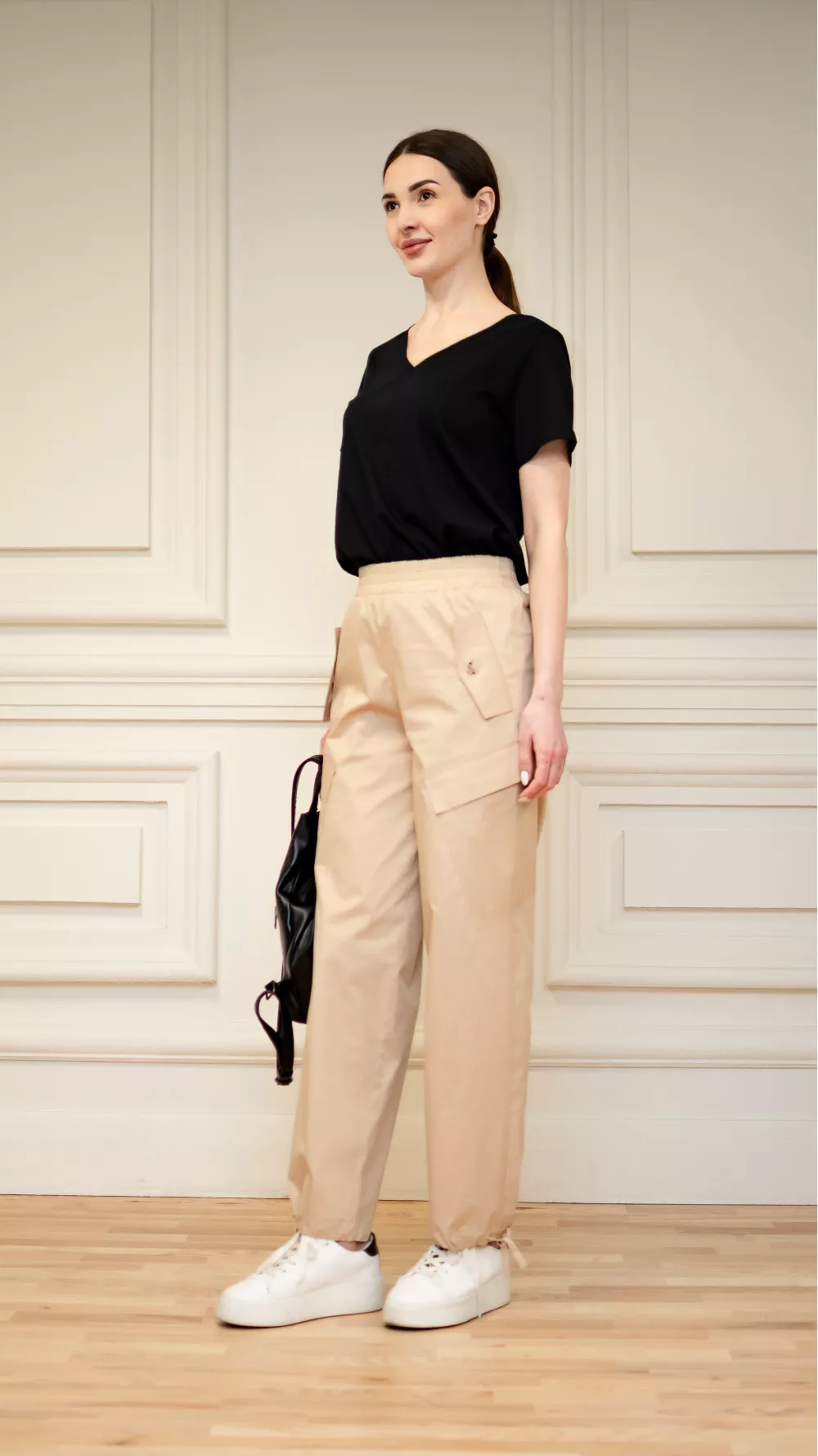 Трендовые брюки в спортивном стиле с накладными карманами и дополнительными завязками, регулируемыми снизу