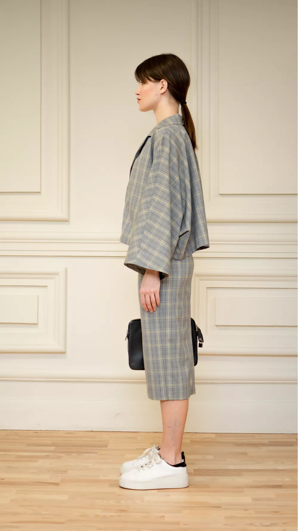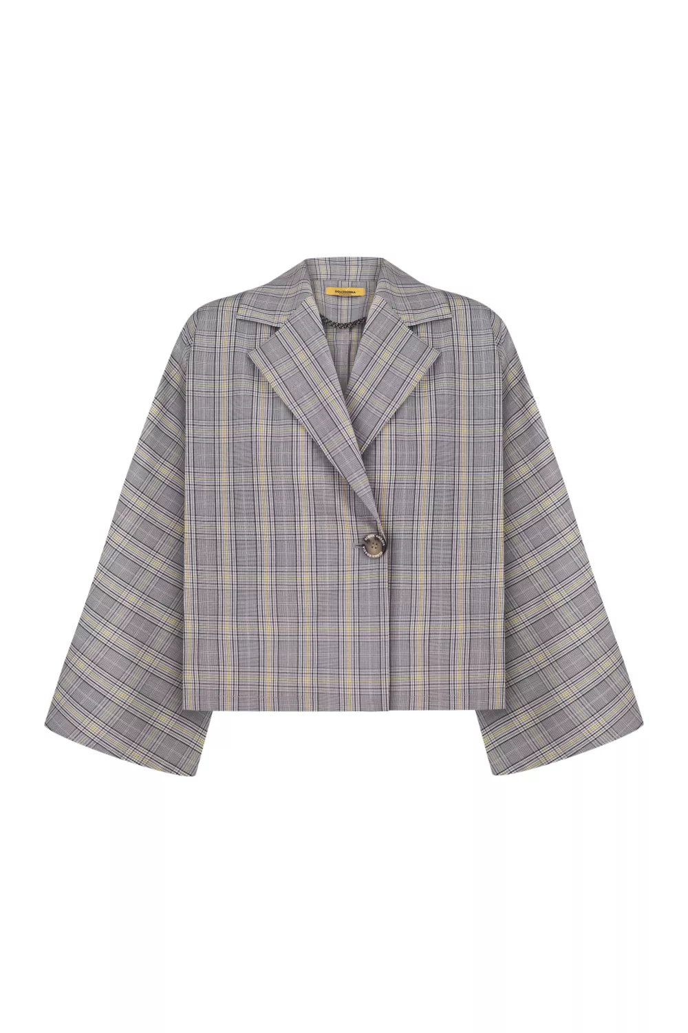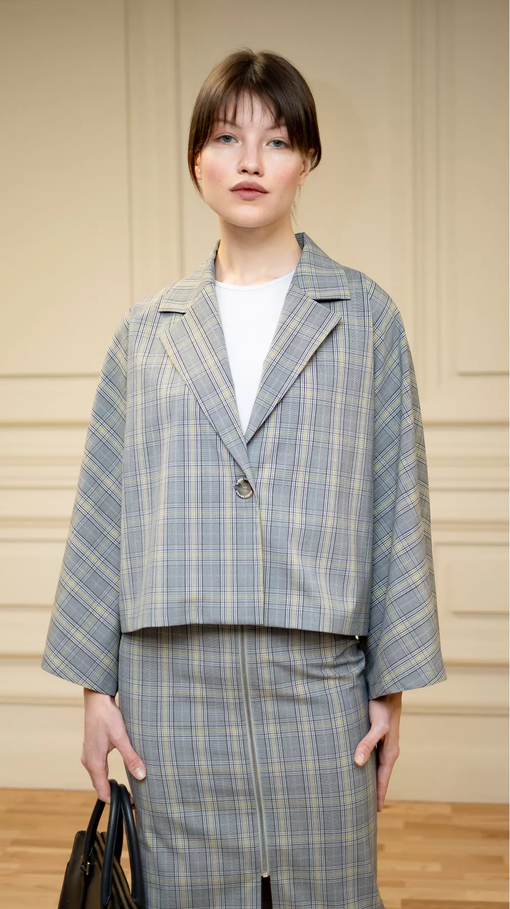Короткий клетчатый жакет с расширенным рукавом в стиле кимоно, имеет прямой покрой и хорошо контрастирует с зауженным низом