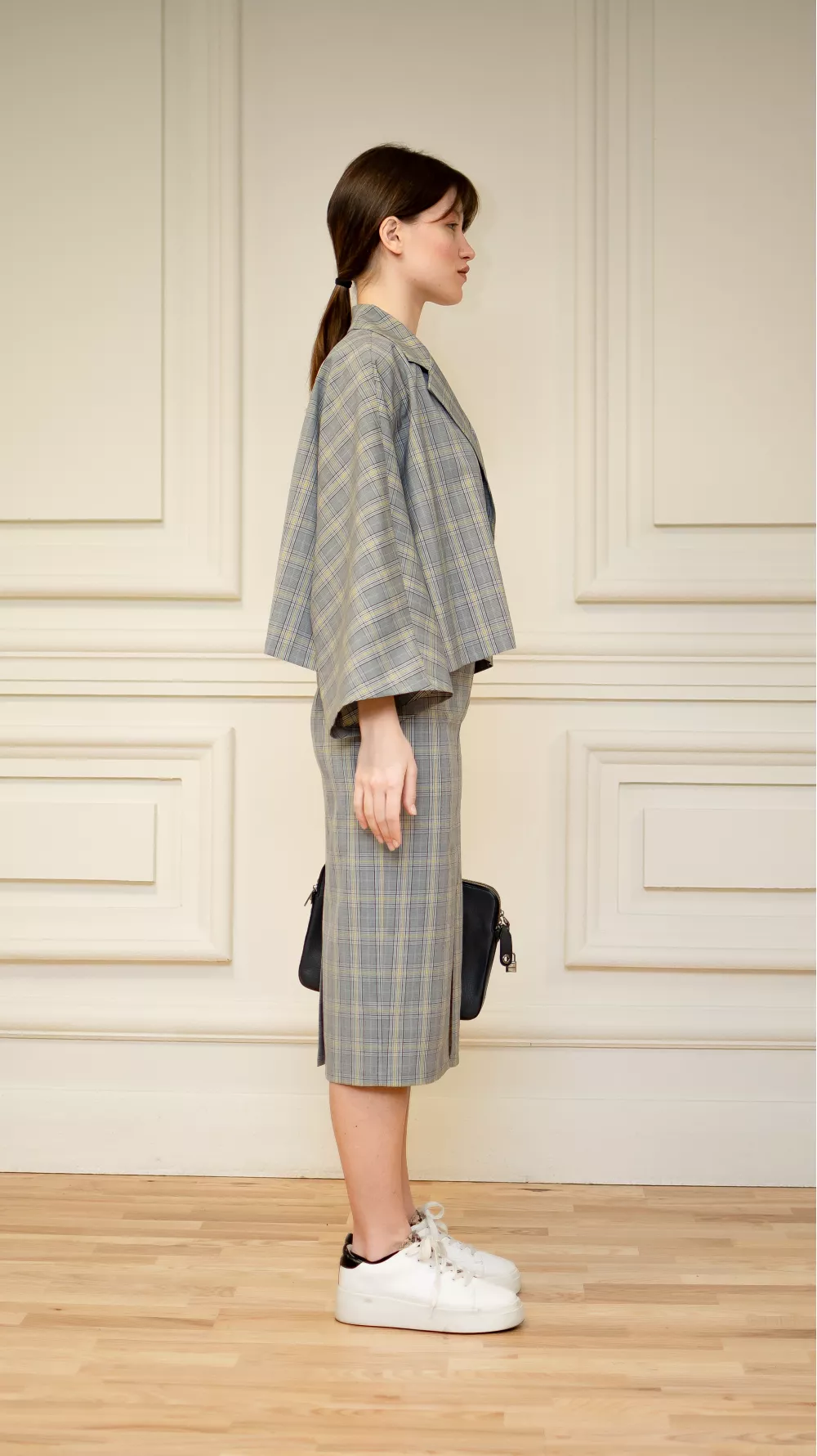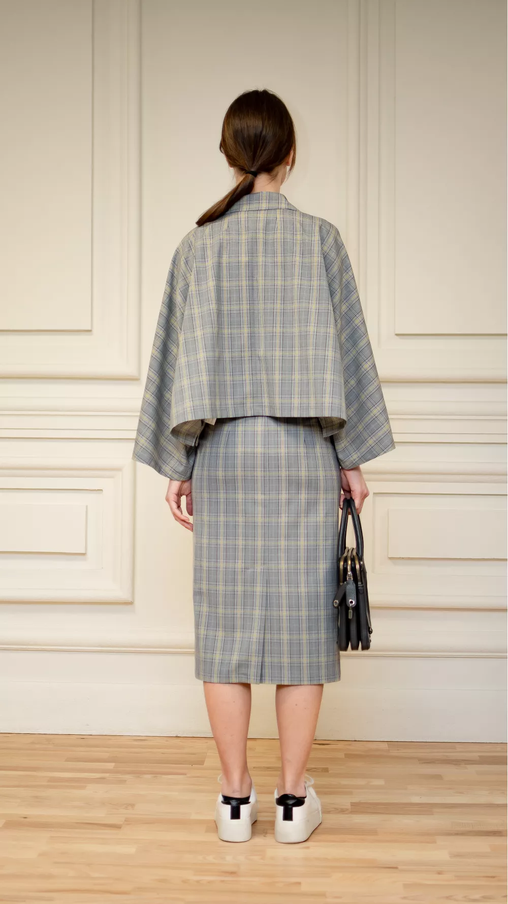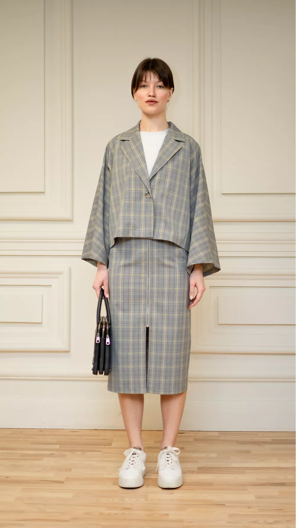 Короткий клетчатый жакет с расширенным рукавом в стиле кимоно, имеет прямой покрой и хорошо контрастирует с зауженным низом