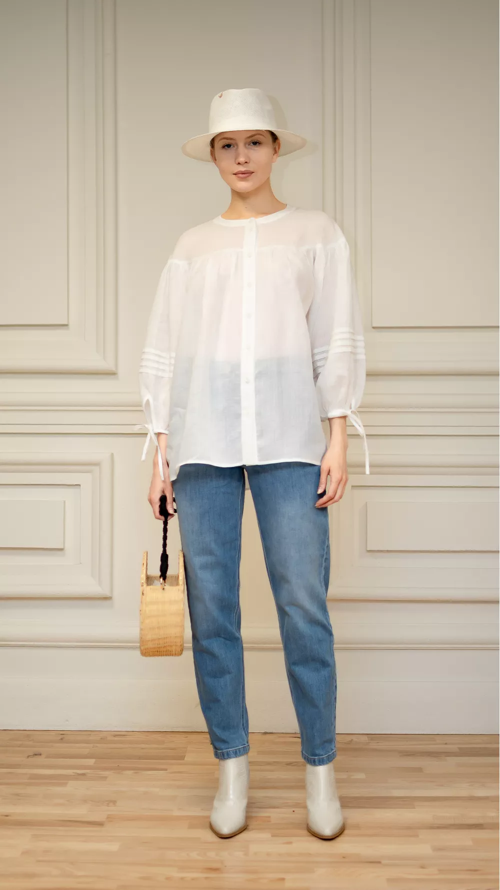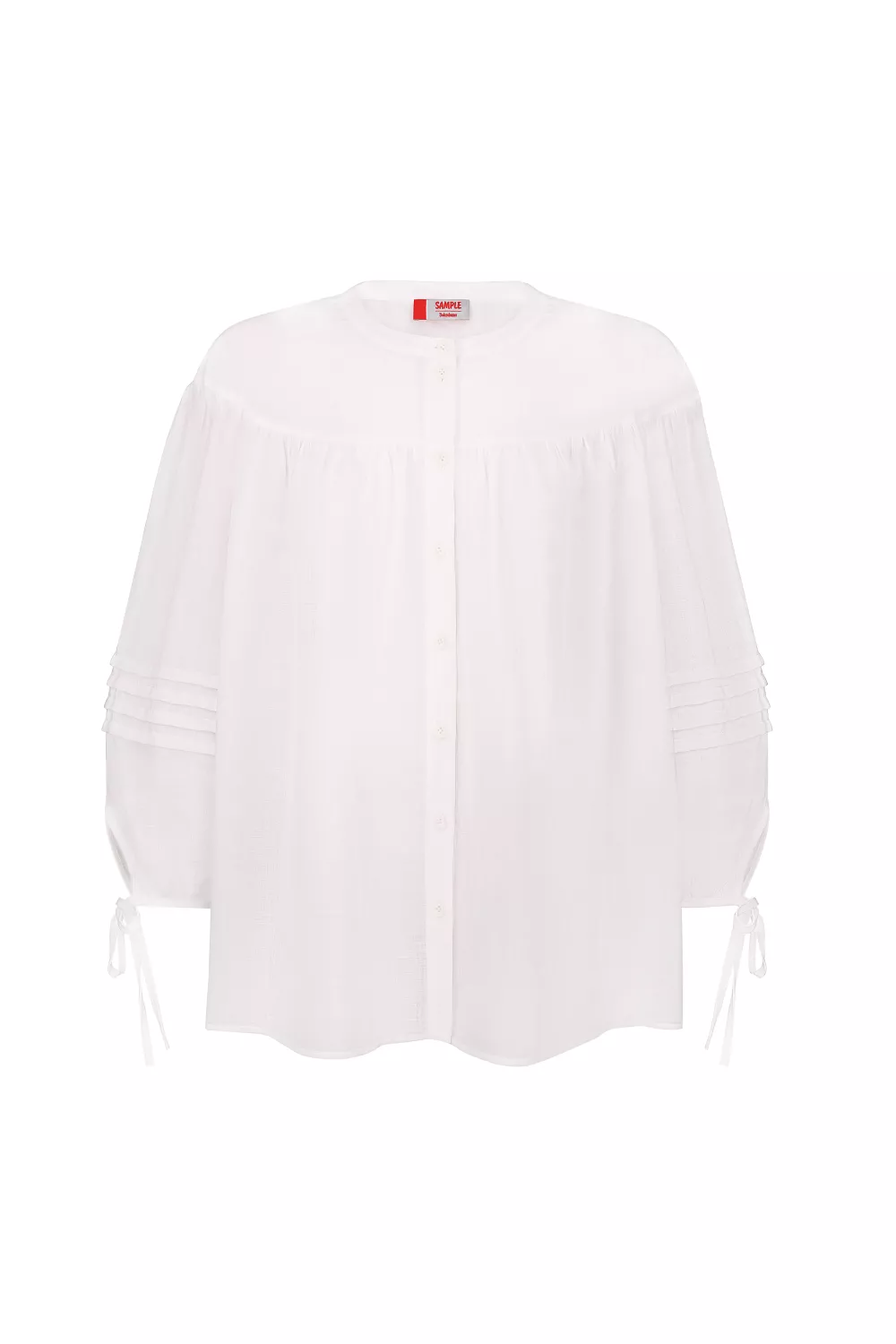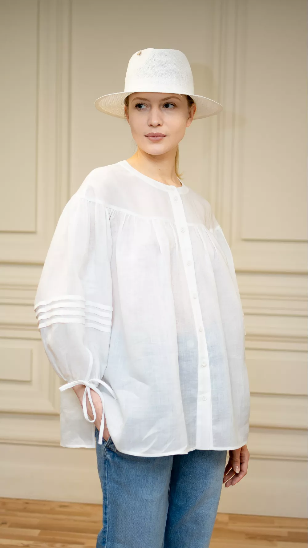 Натуральная блуза свободного кроя с пышными рукавами на завязках станет идеальным вариантом в жаркую погоду