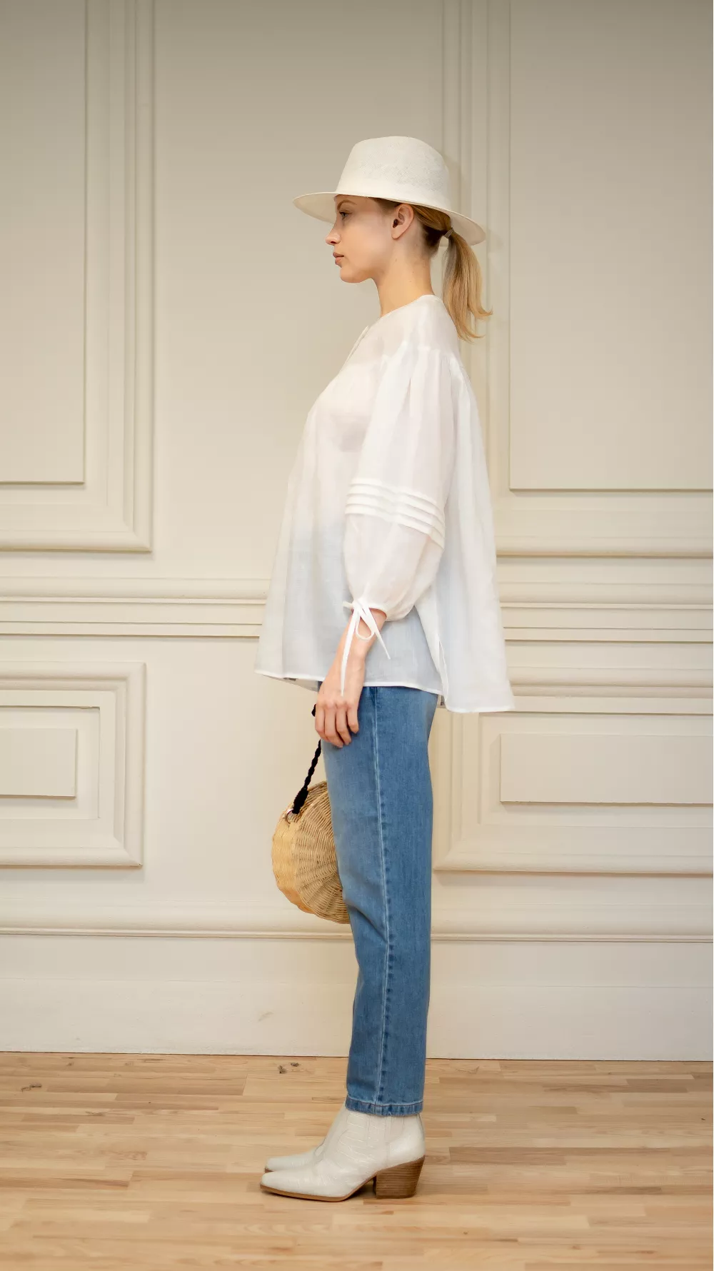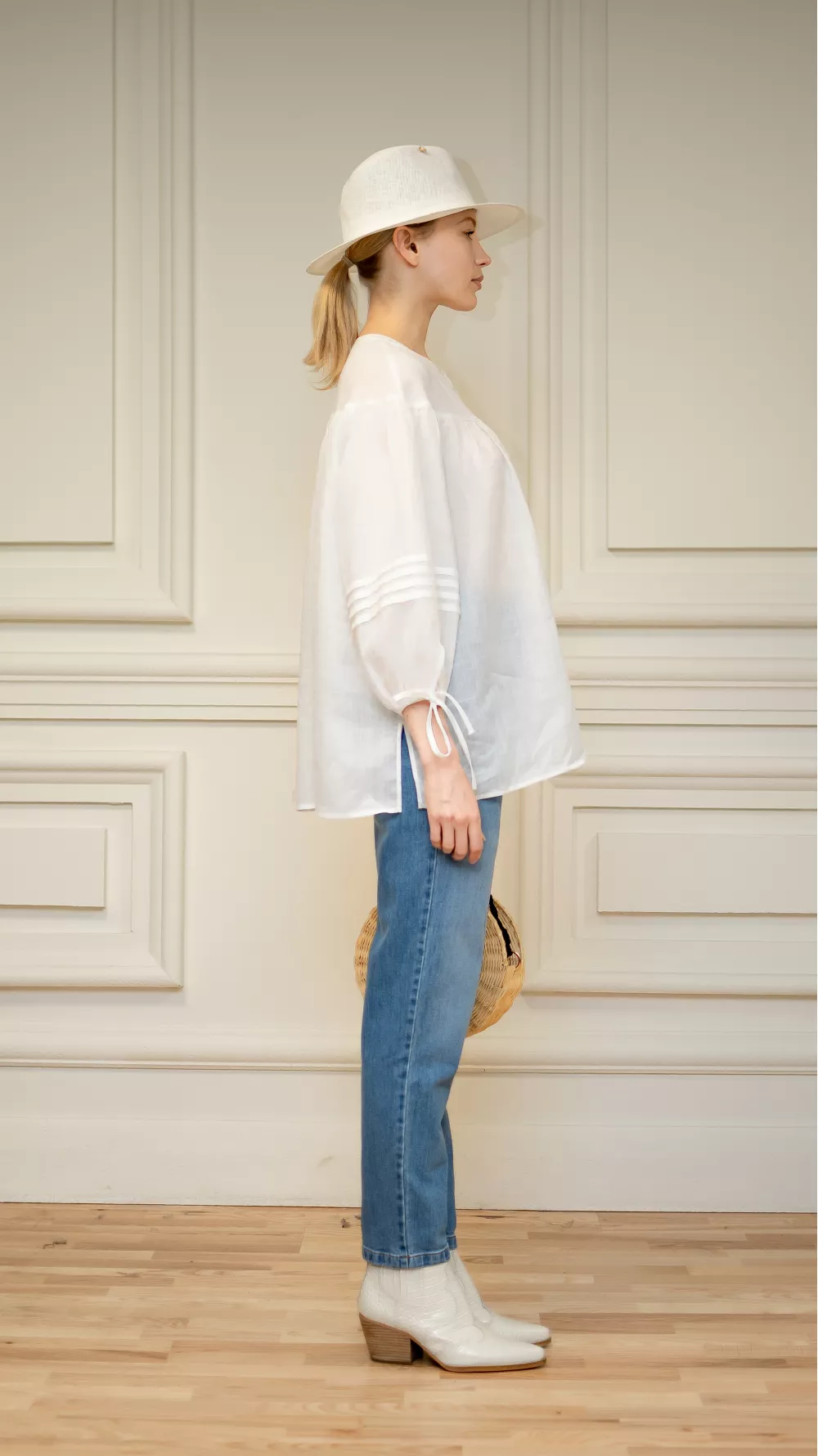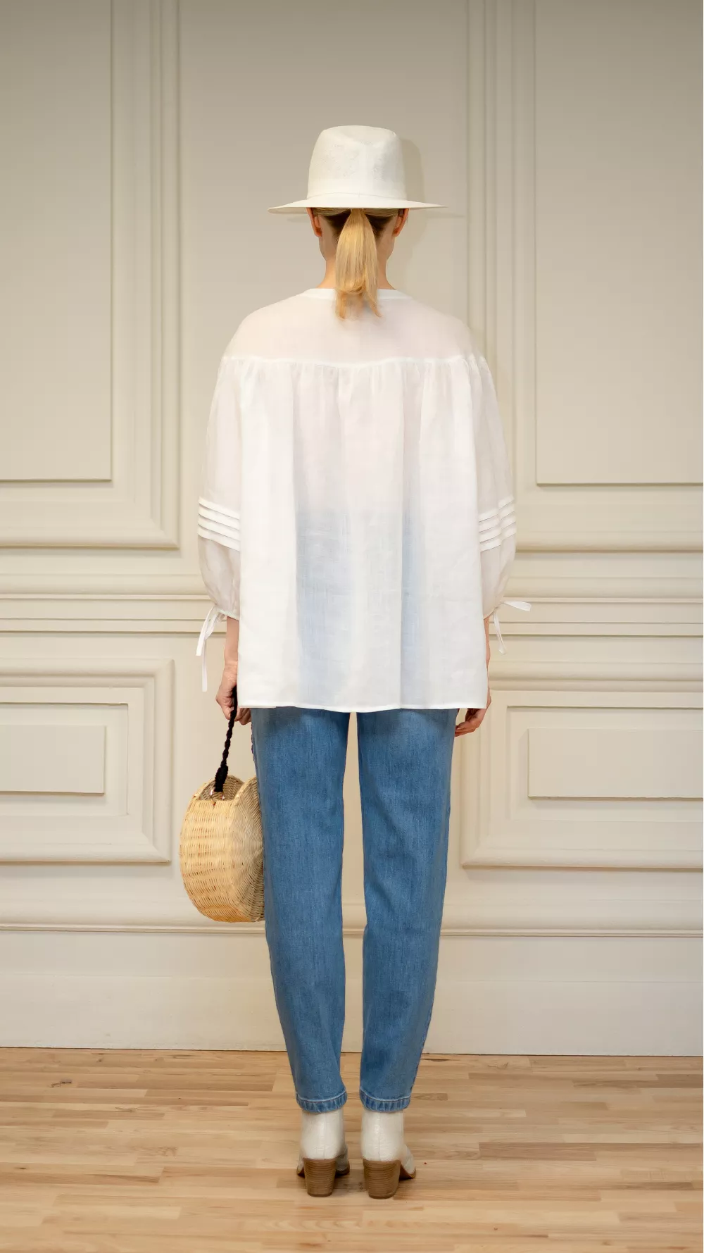 Натуральная блуза свободного кроя с пышными рукавами на завязках станет идеальным вариантом в жаркую погоду
