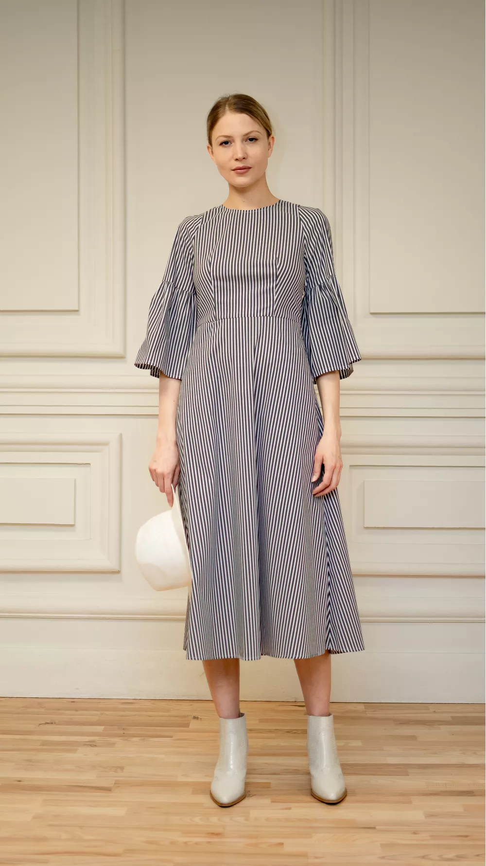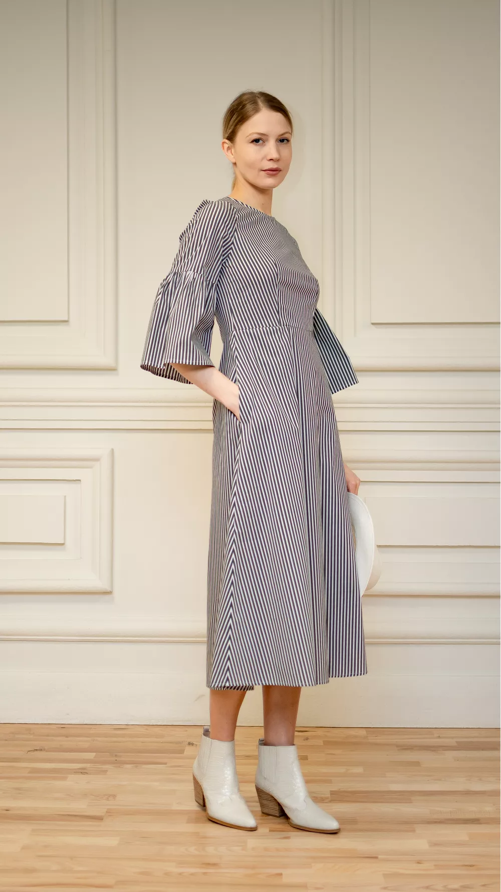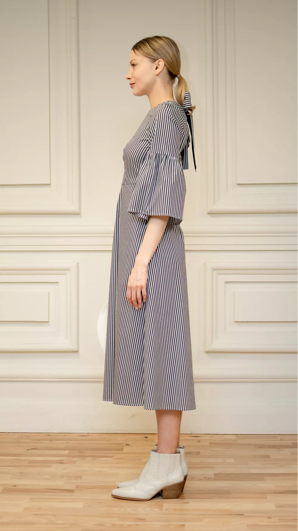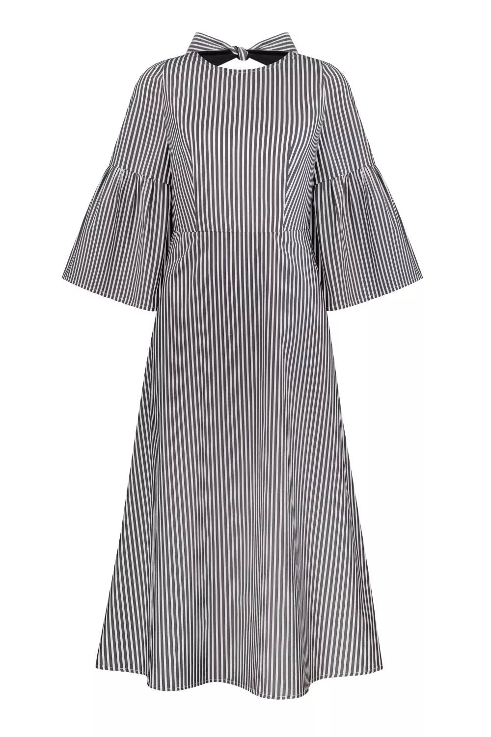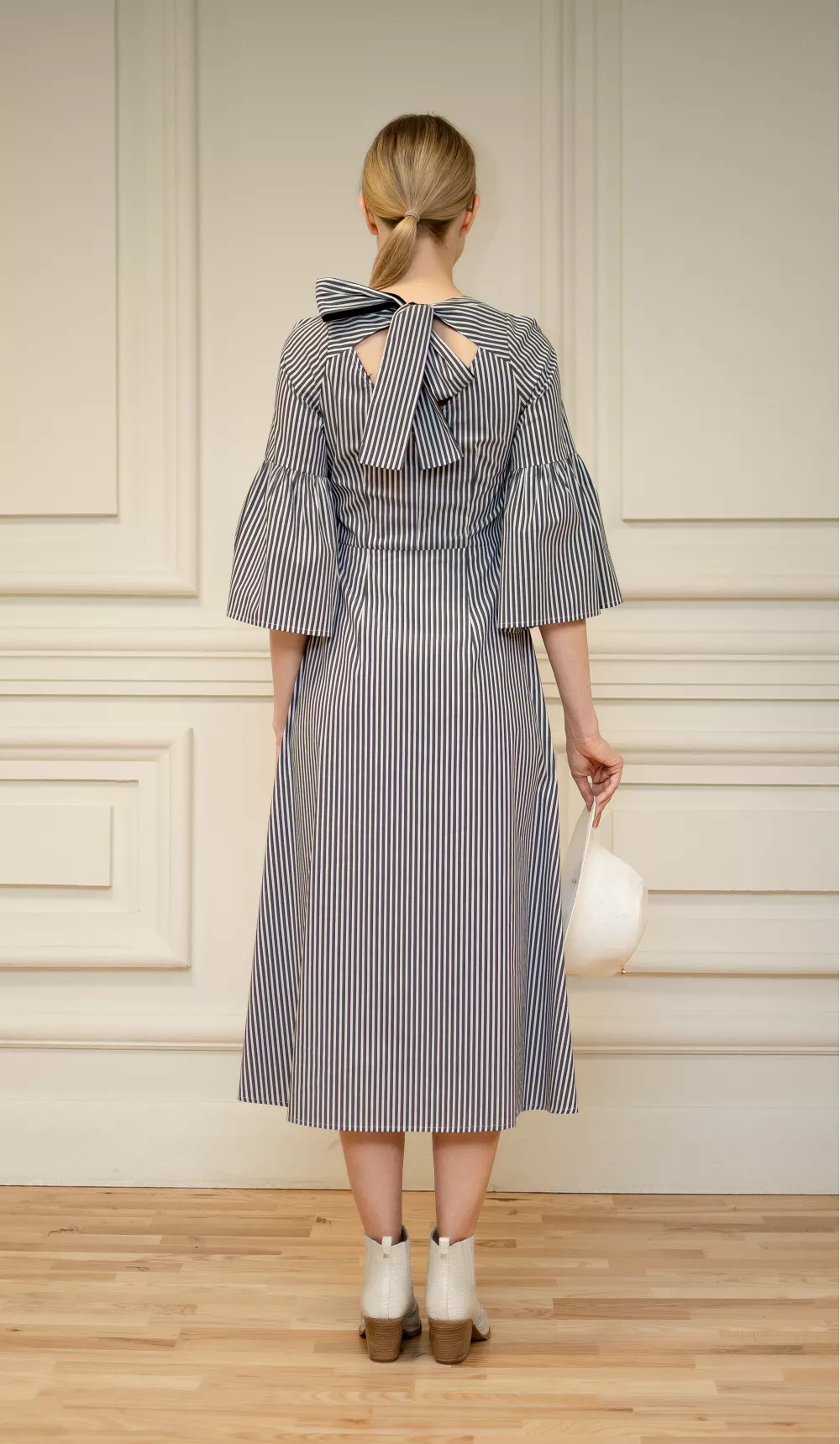 Полосатое платье, подчеркивающее все прелести женской фигуры. Фантастический вид со спины придает бант