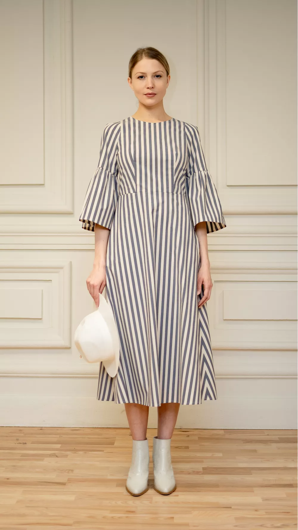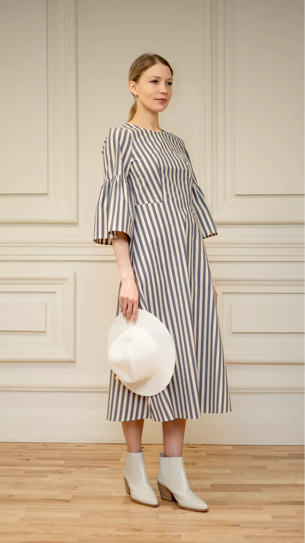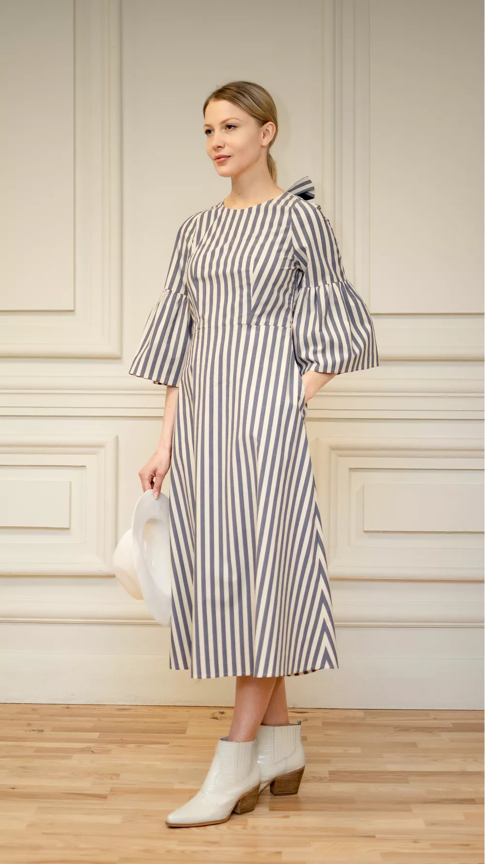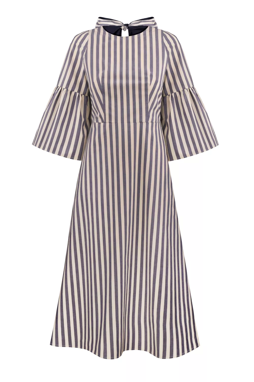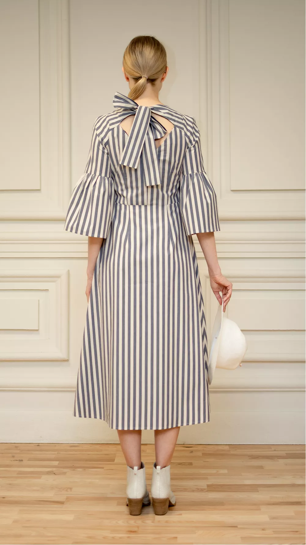 Полосатое платье, подчеркивающее все прелести женской фигуры. Фантастический вид со спины придает бант