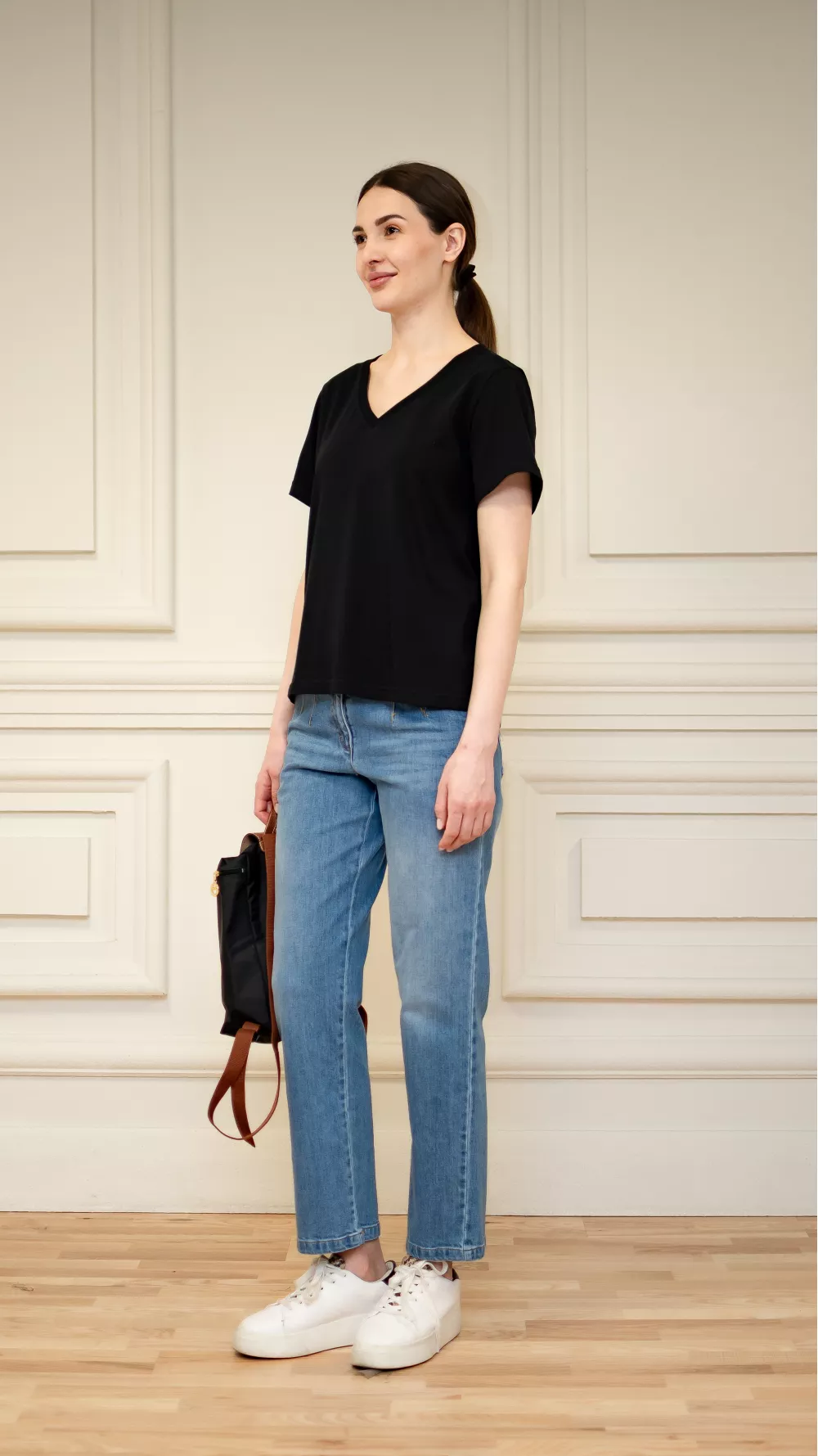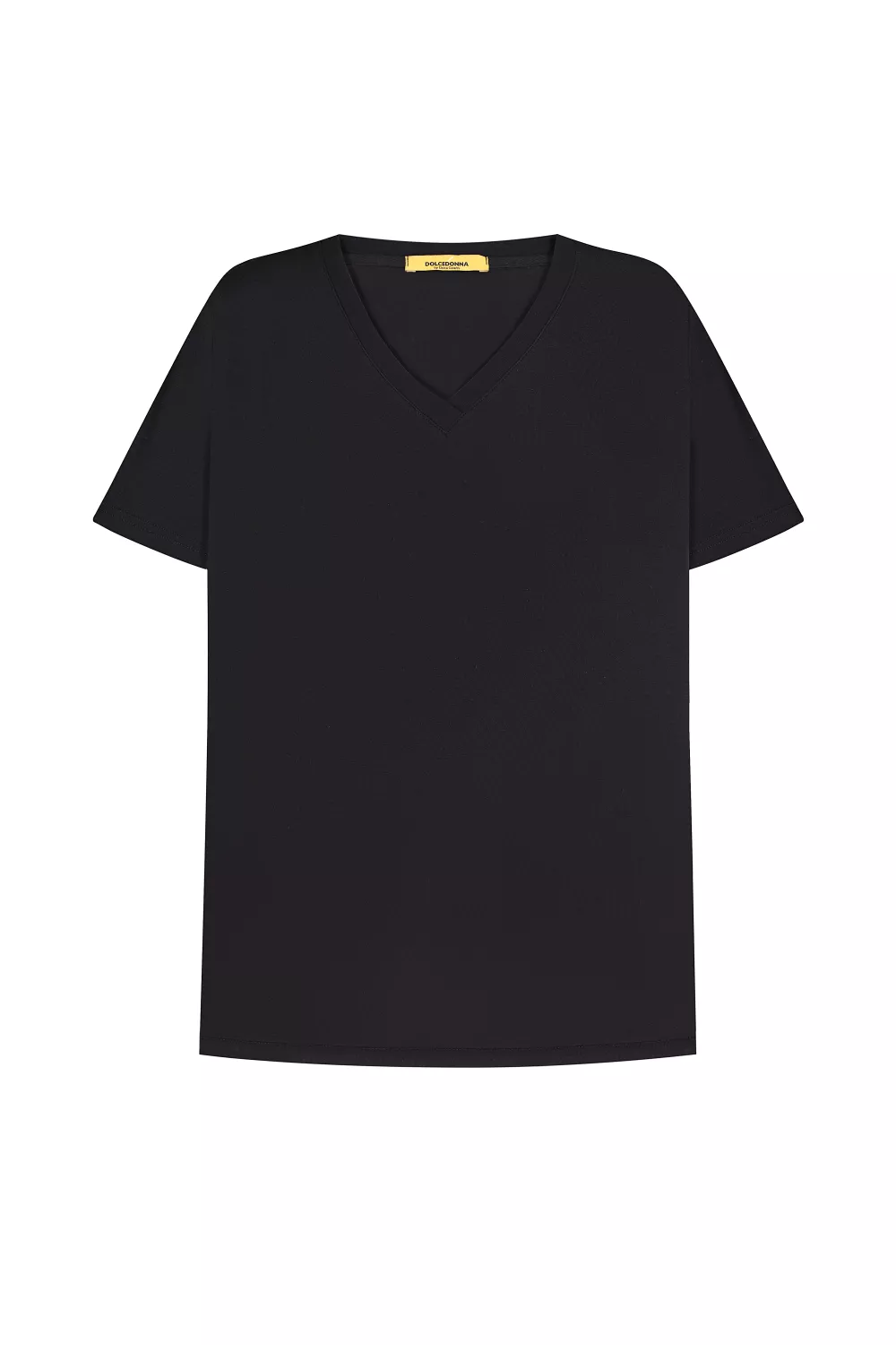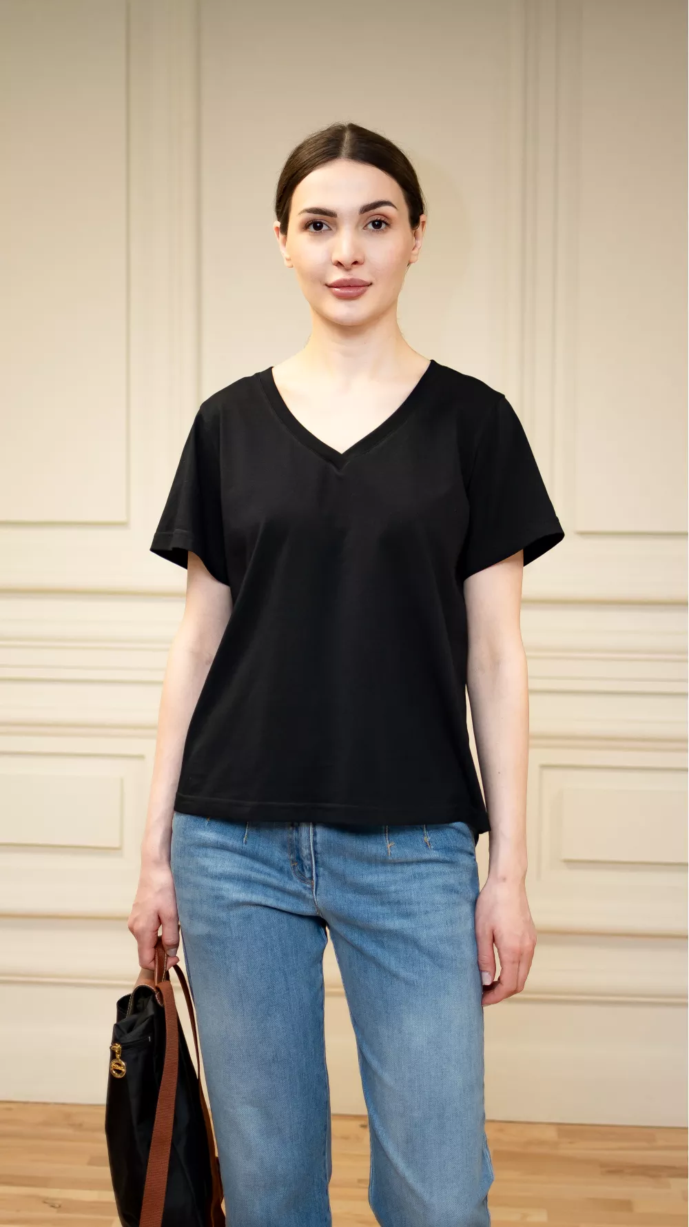 Базовая футболка прямого кроя с V-образным вырезом, визуально удлиняет шею, придавая внешнести изящества