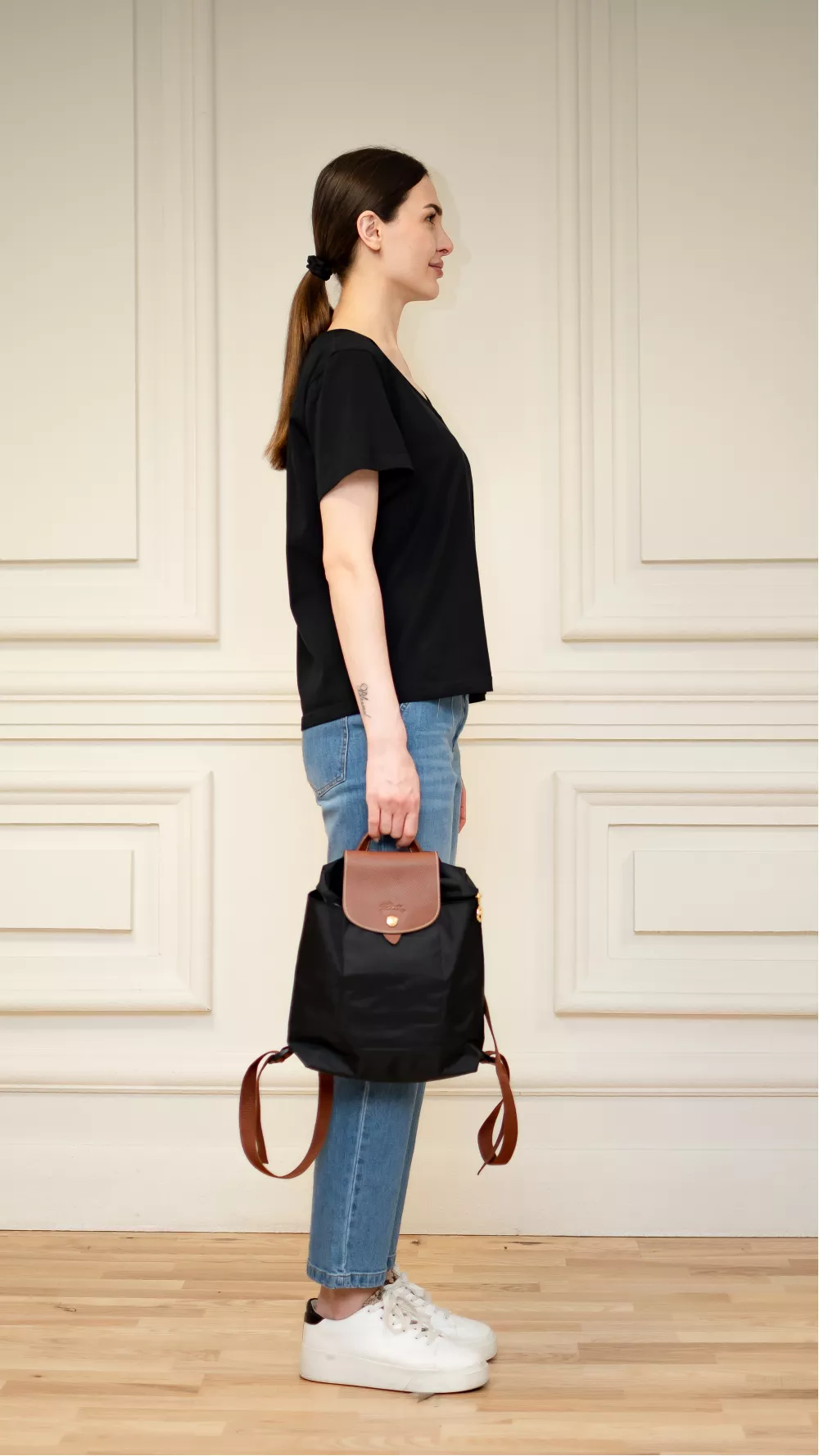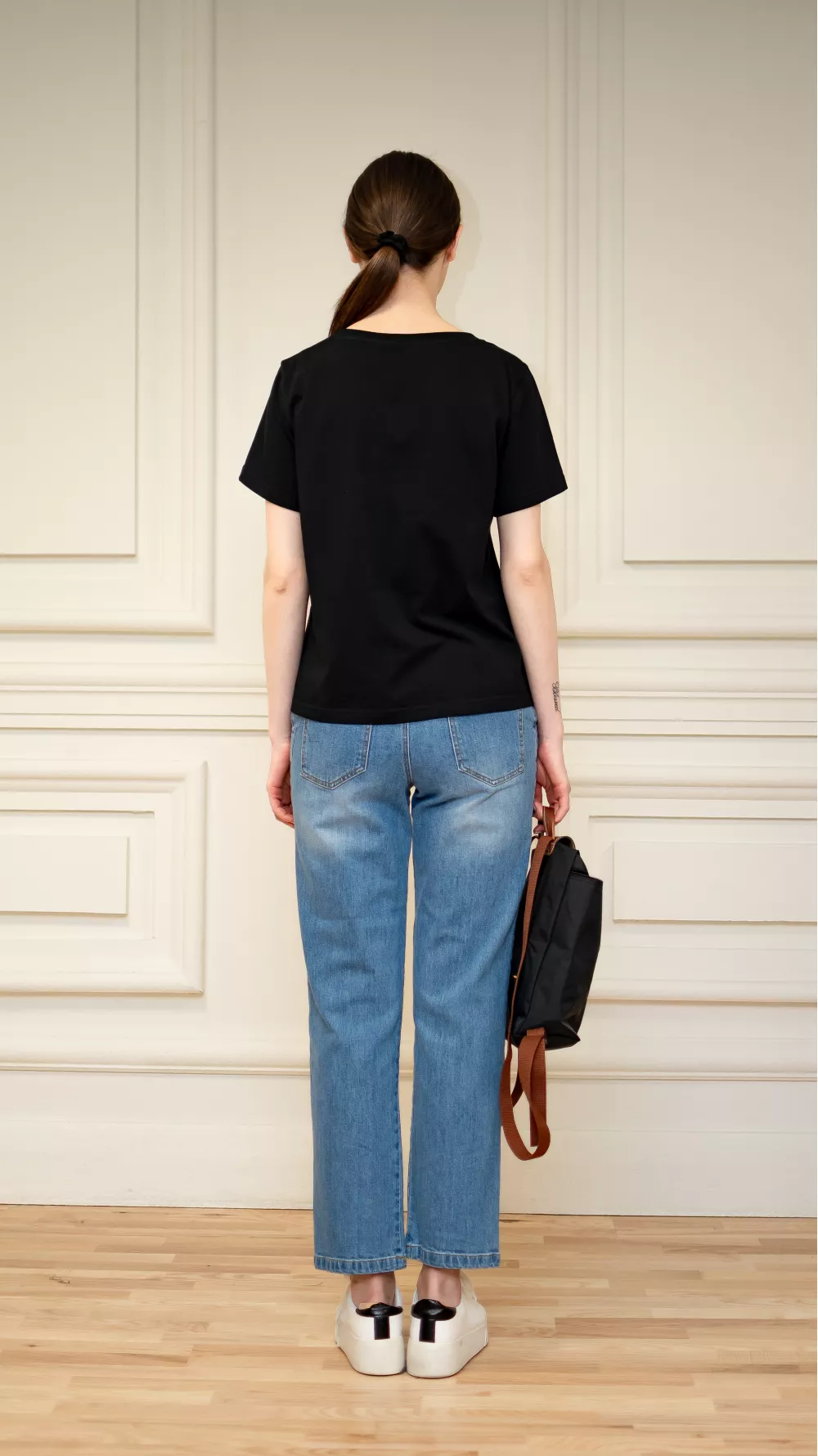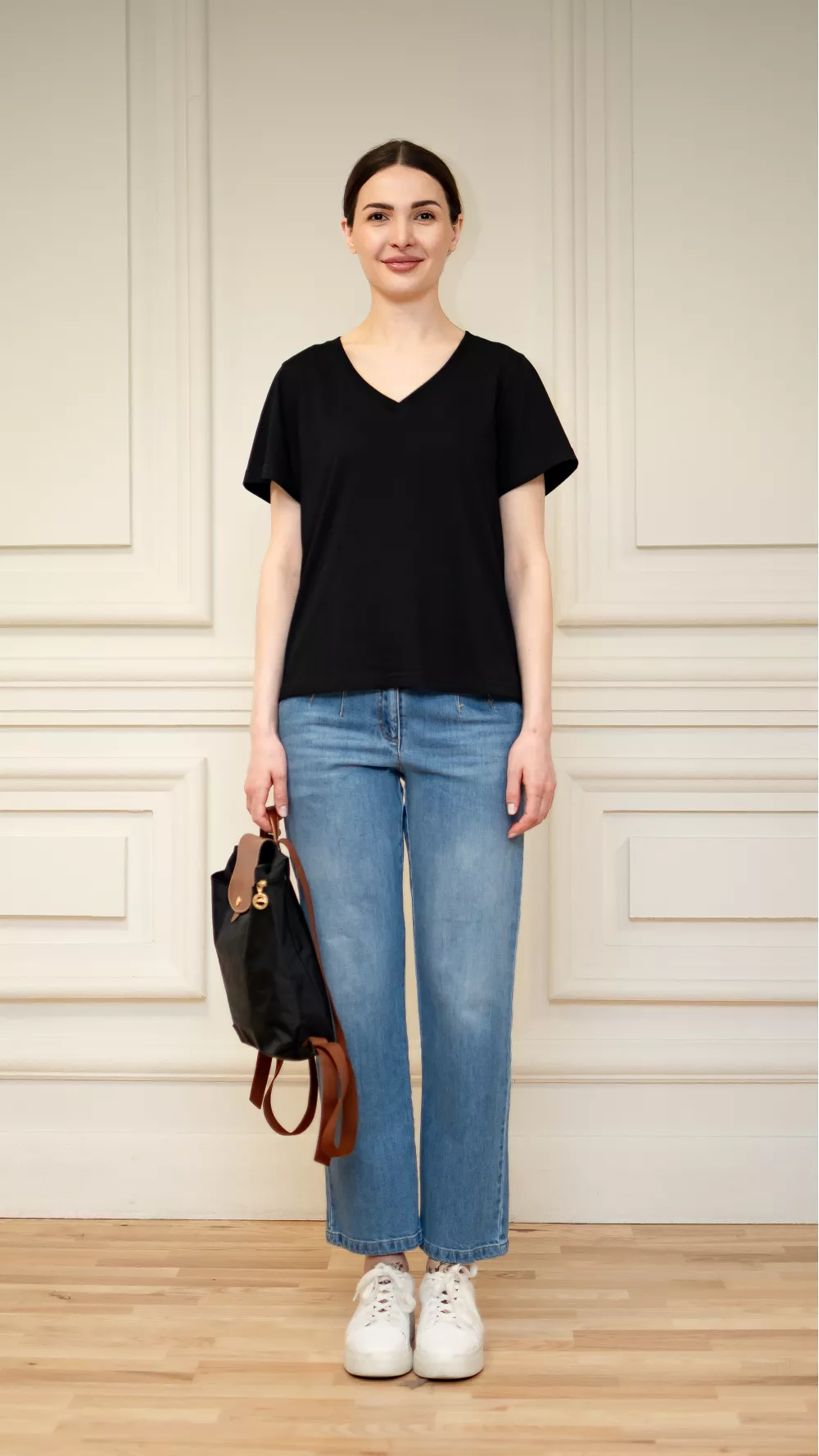 Базовая футболка прямого кроя с V-образным вырезом, визуально удлиняет шею, придавая внешнести изящества