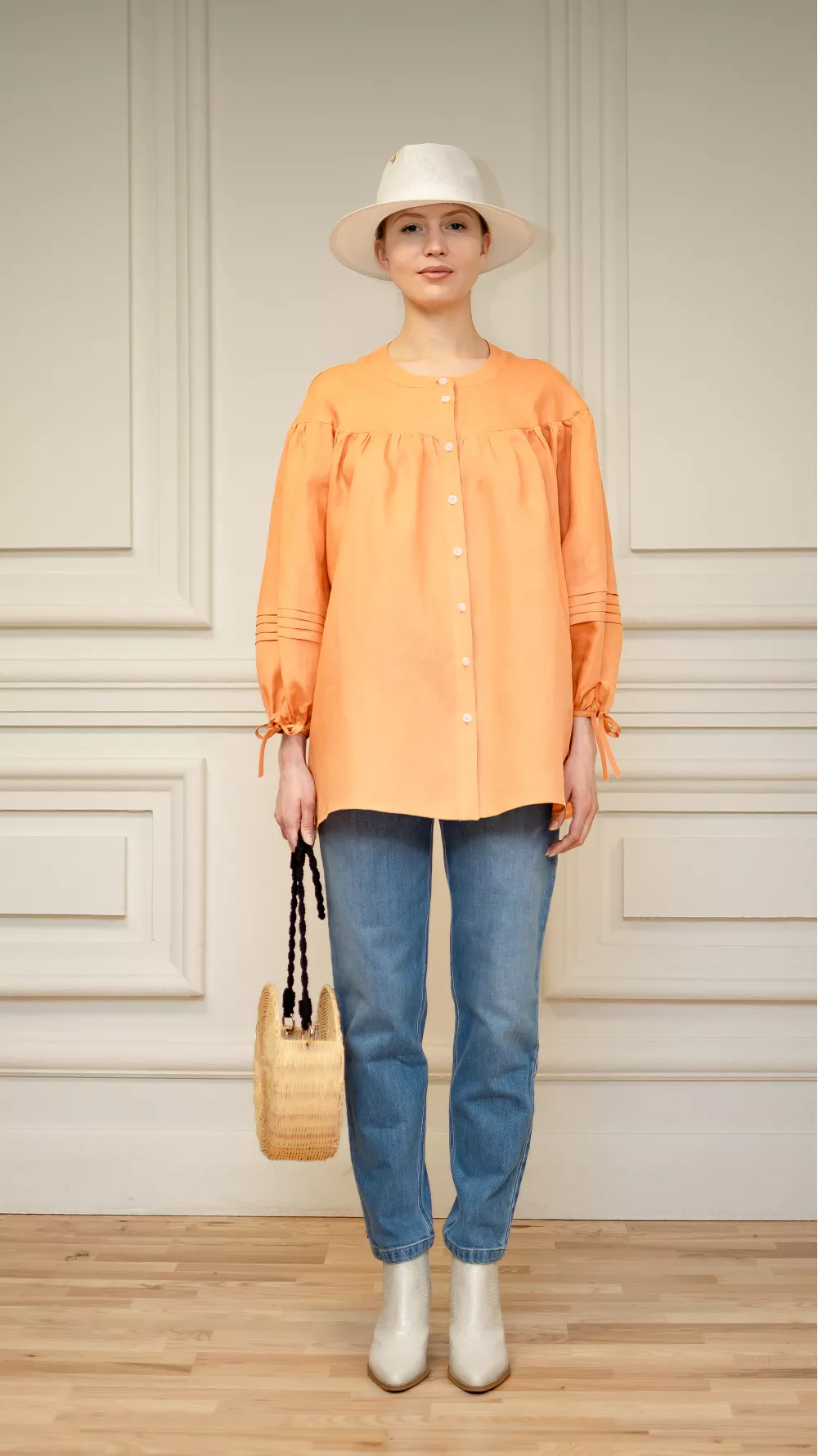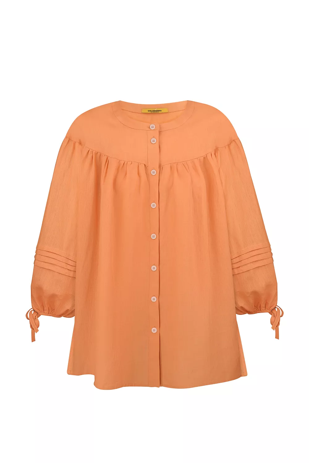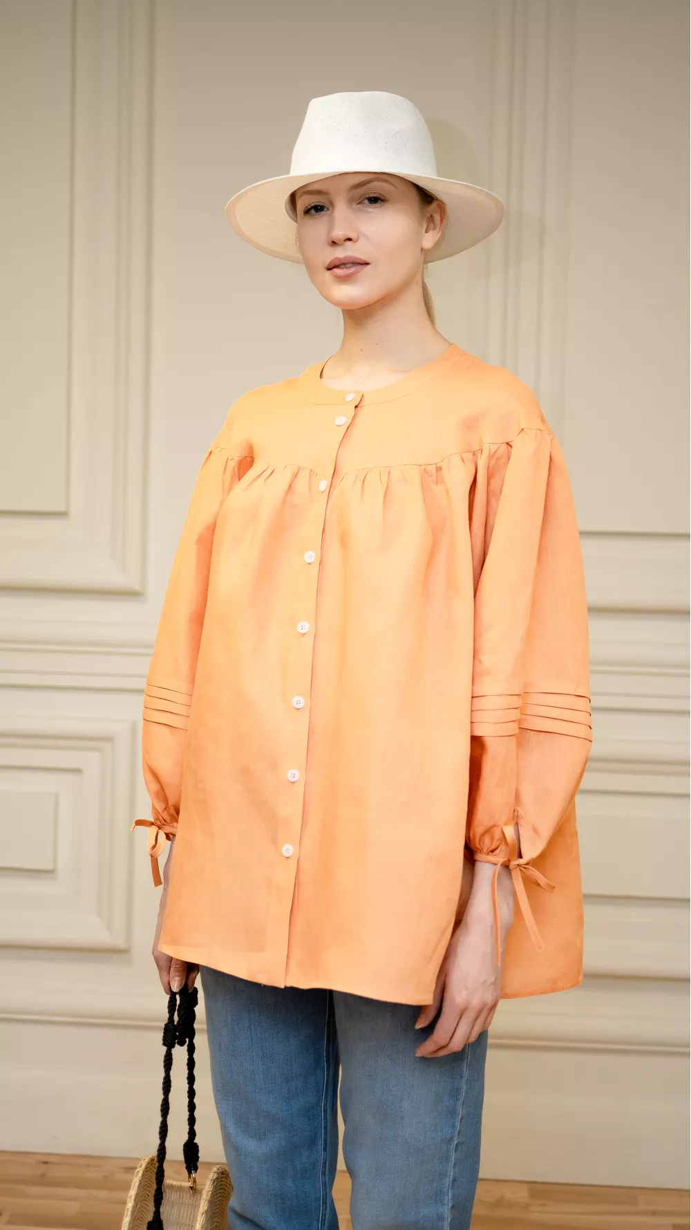 Натуральная блуза свободного кроя с пышными рукавами на завязках станет идеальным вариантом в жаркую погоду