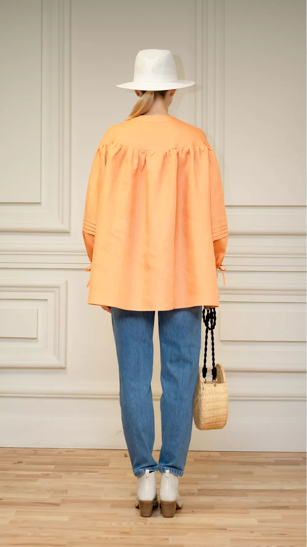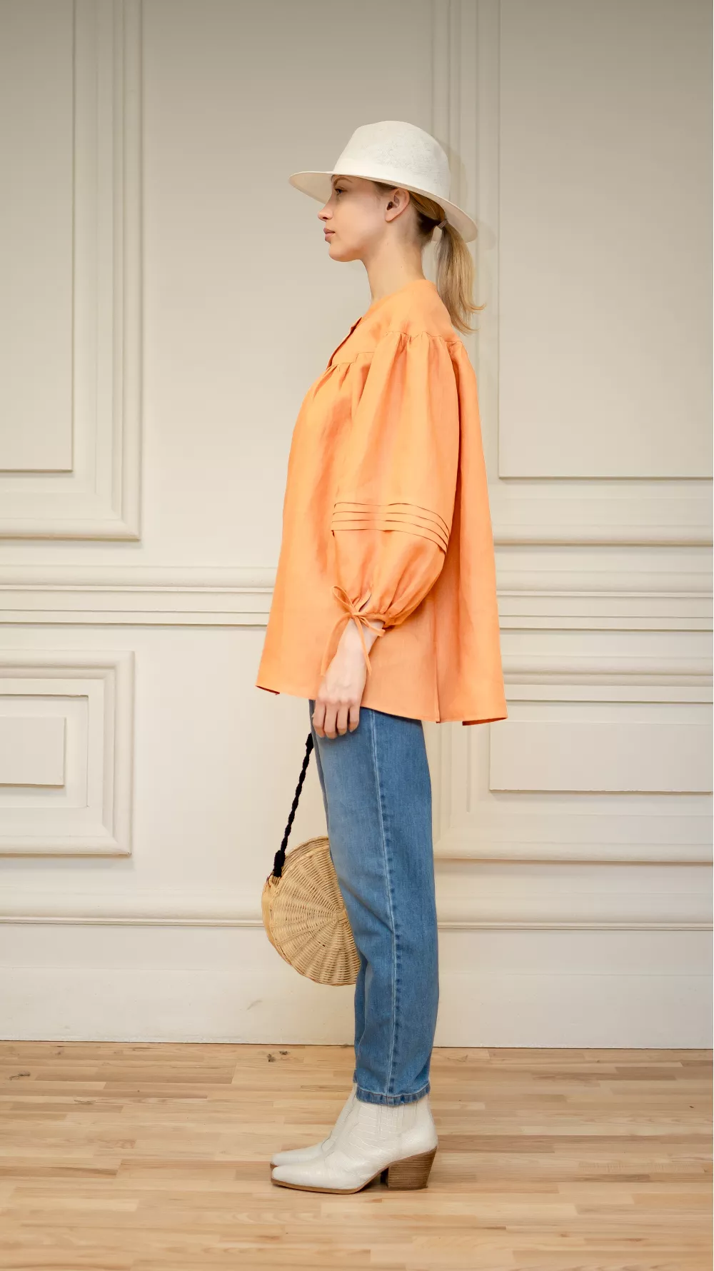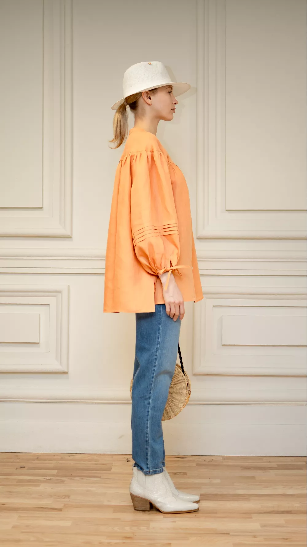 Натуральная блуза свободного кроя с пышными рукавами на завязках станет идеальным вариантом в жаркую погоду