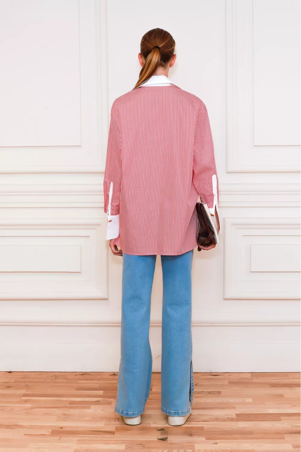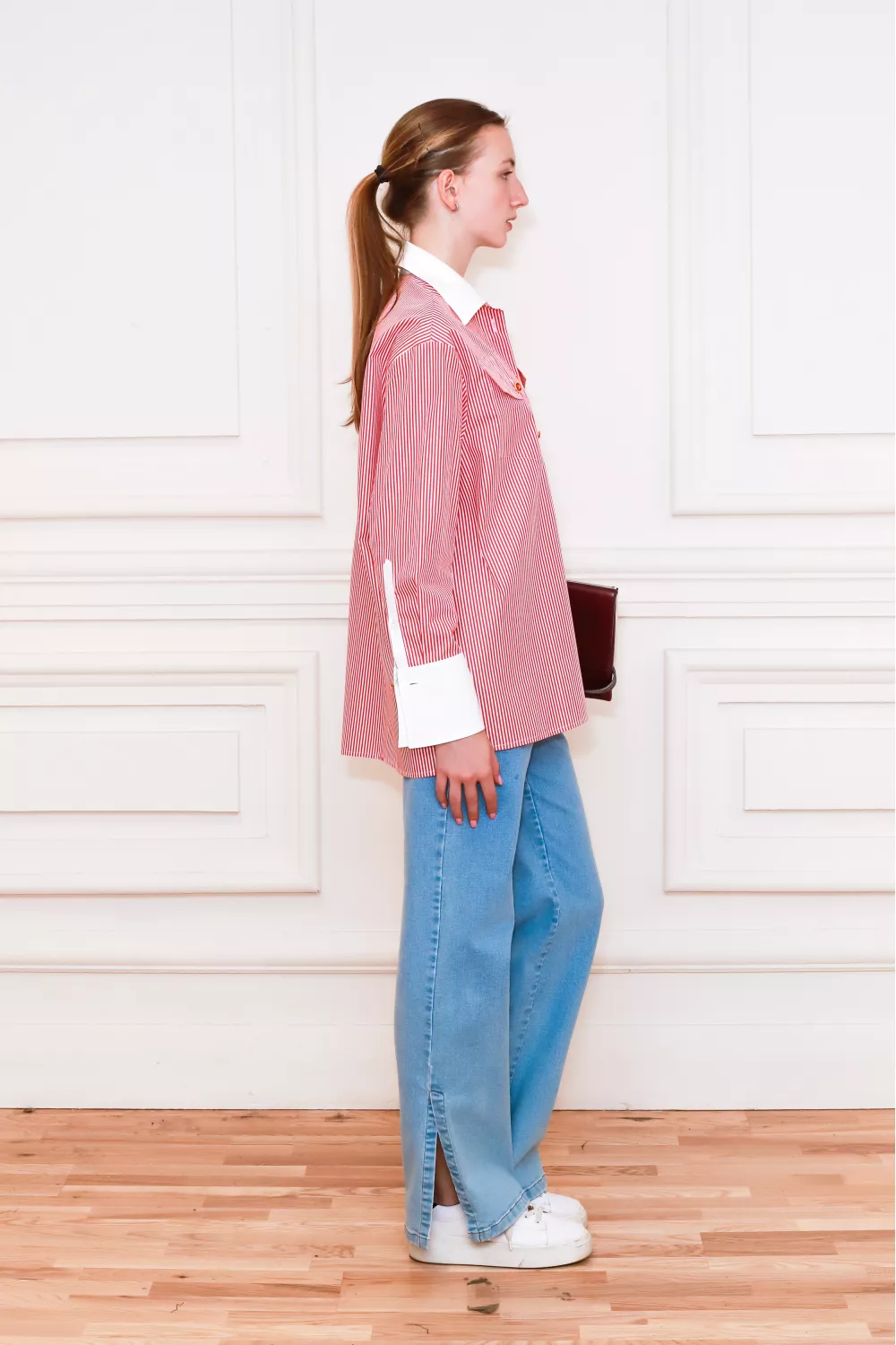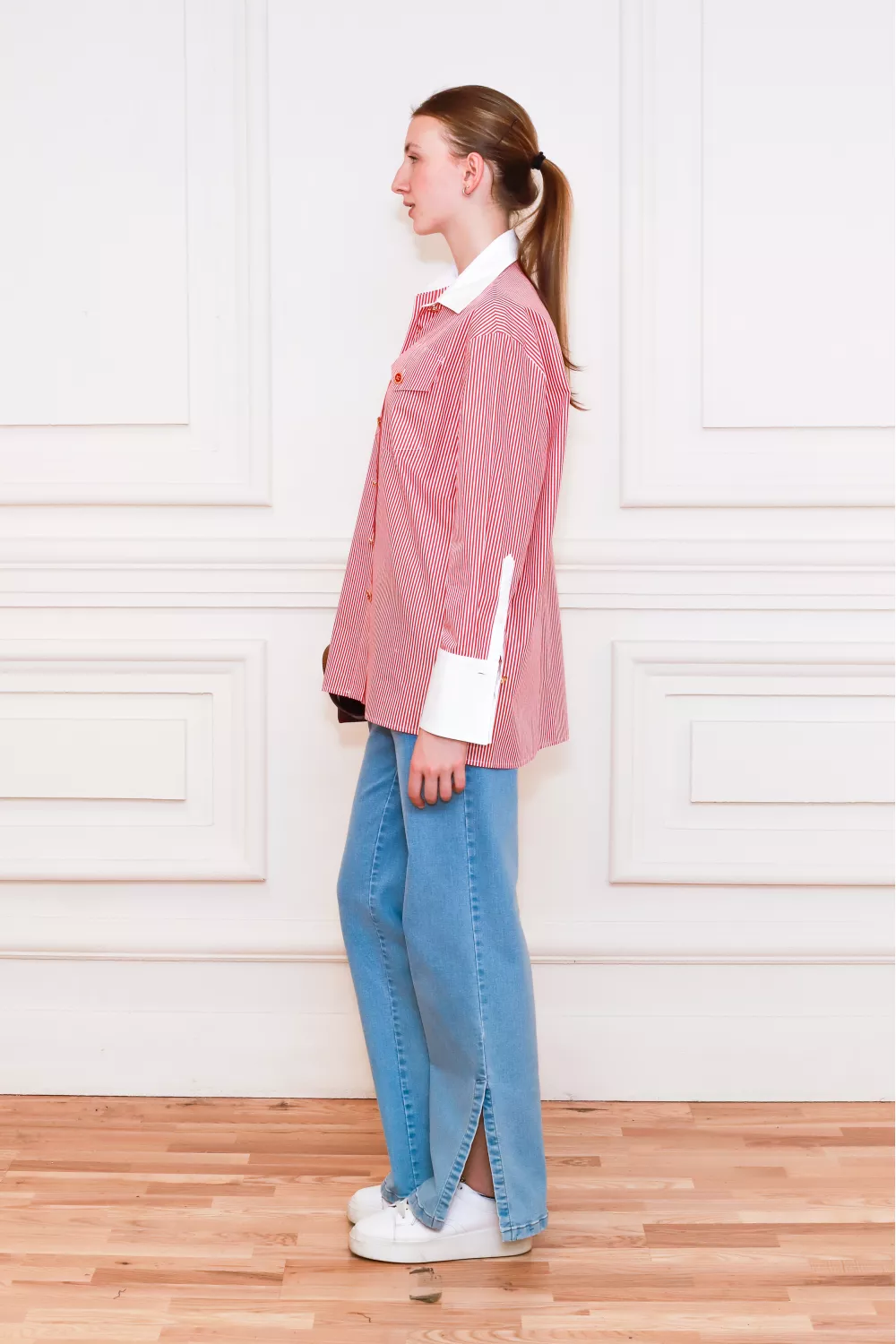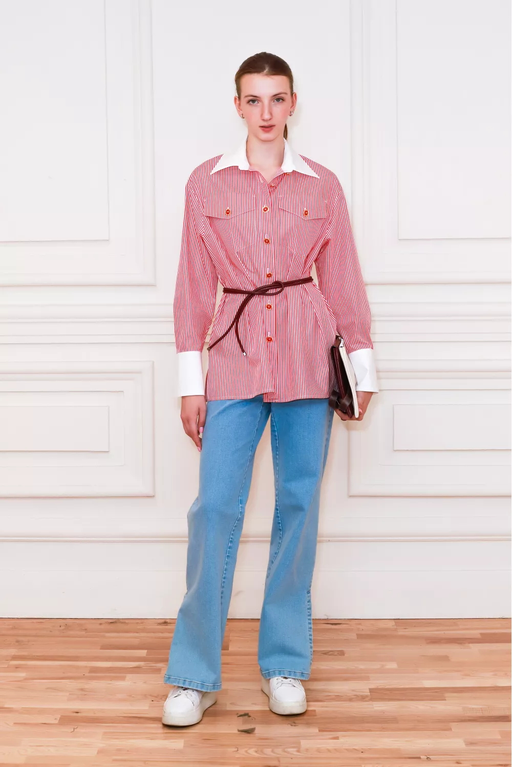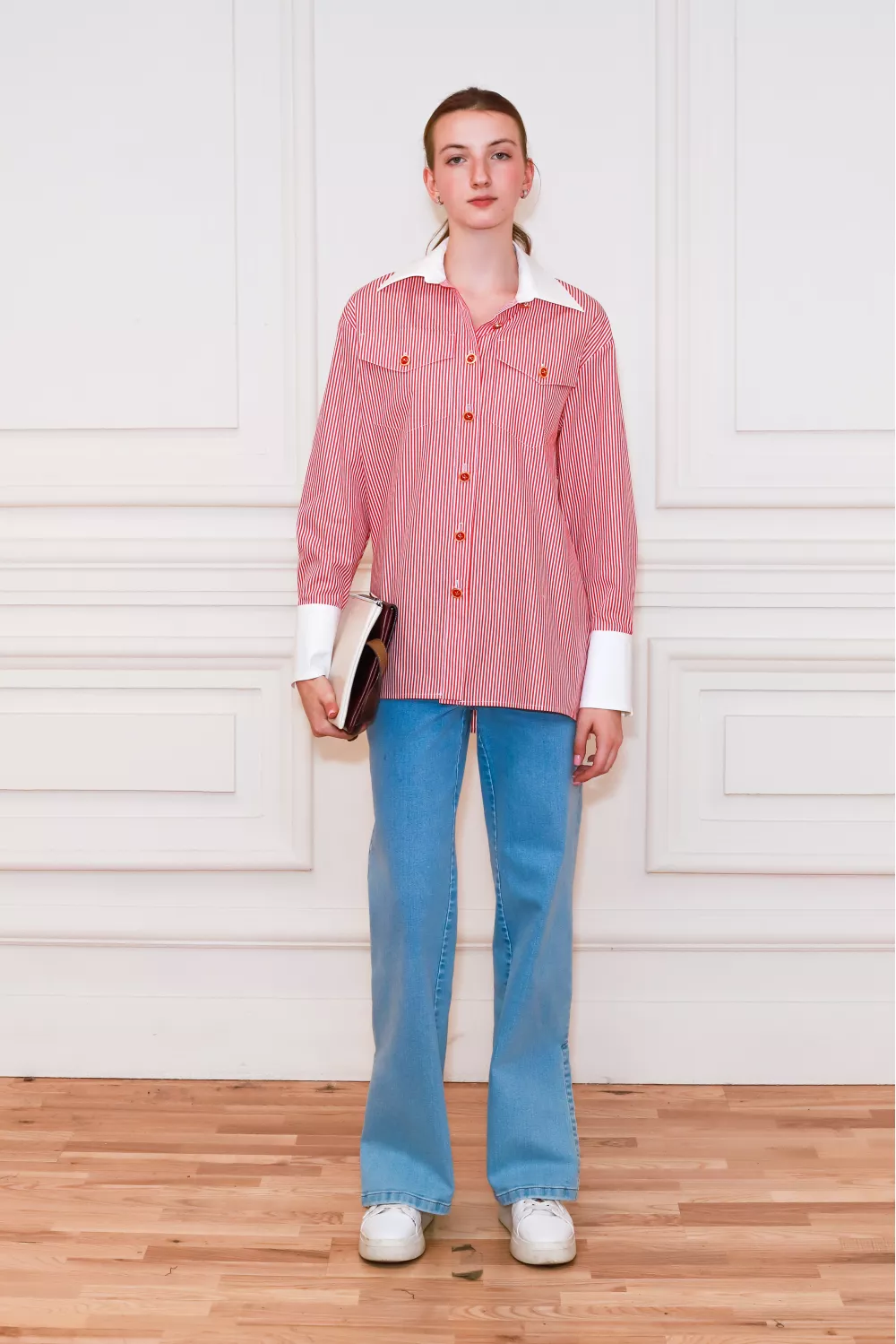Полосатая рубашка классического покроя, украшенная накладными карманами и широкими белоснежными манжетами, станет основой ваших образов на весь сезон