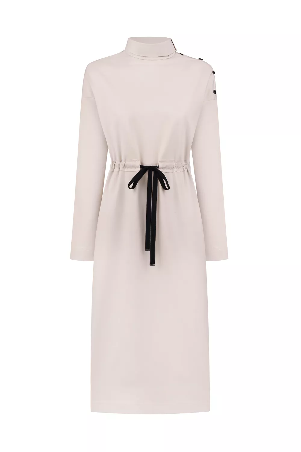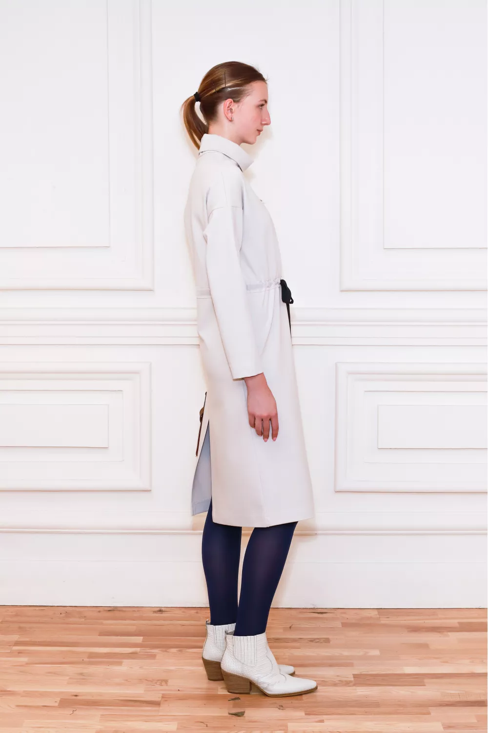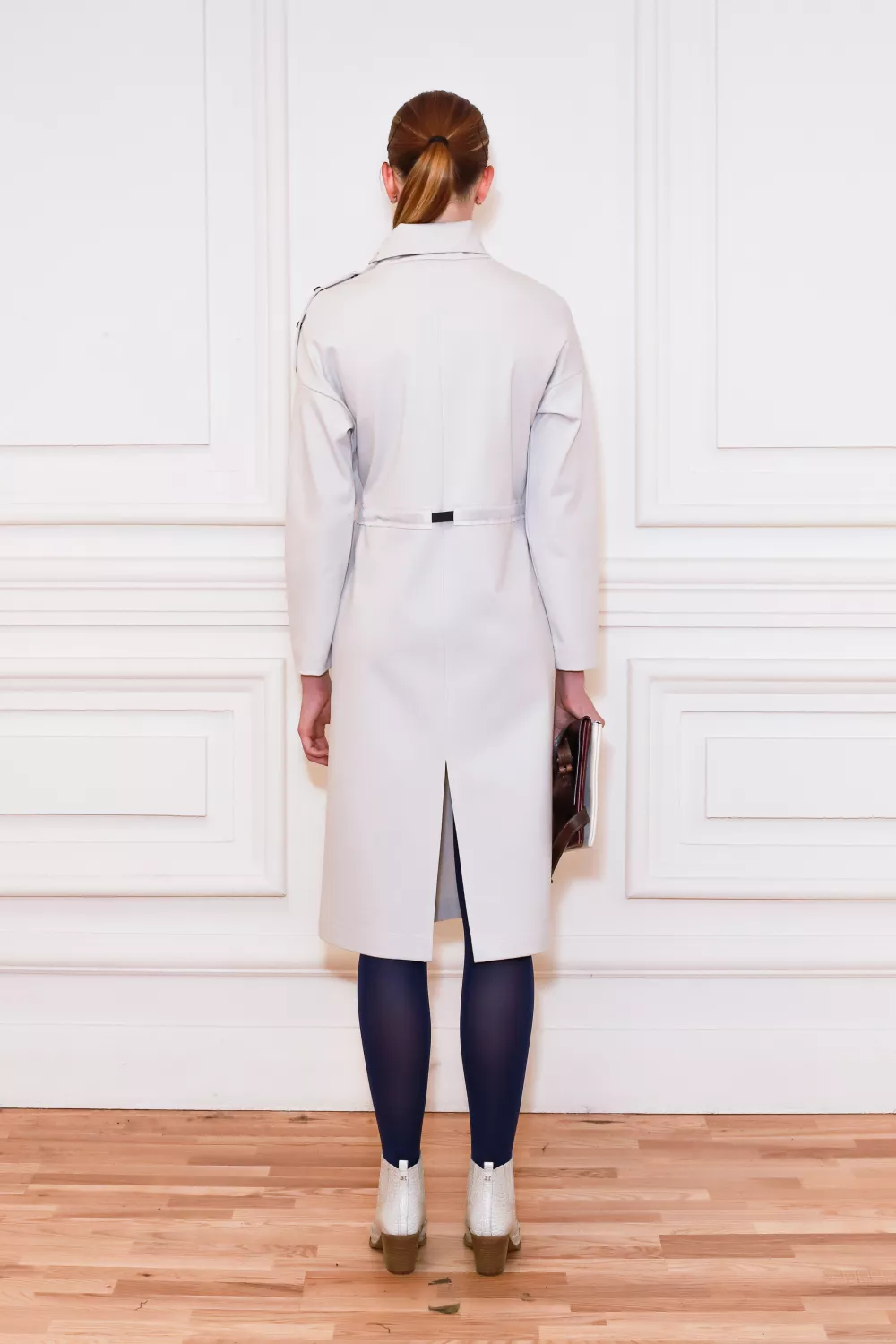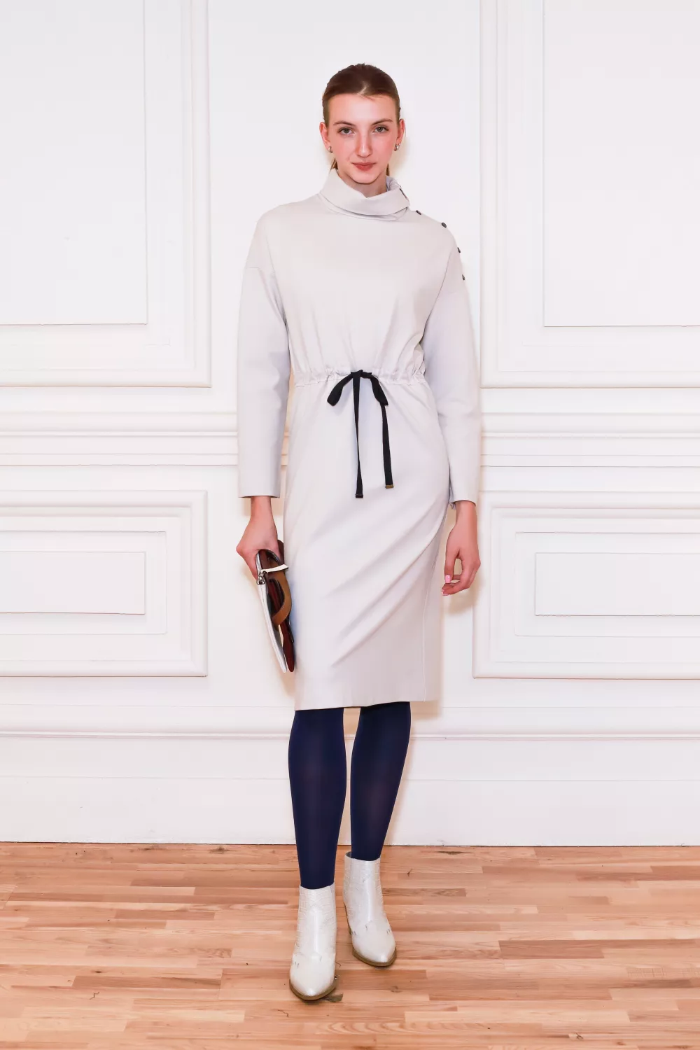Модель имеет ворот на кнопках и стягивается шнуровкой на талии, идеально формирующей силуэт