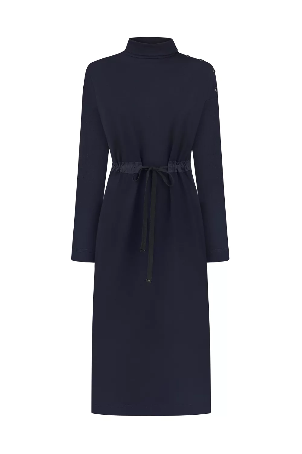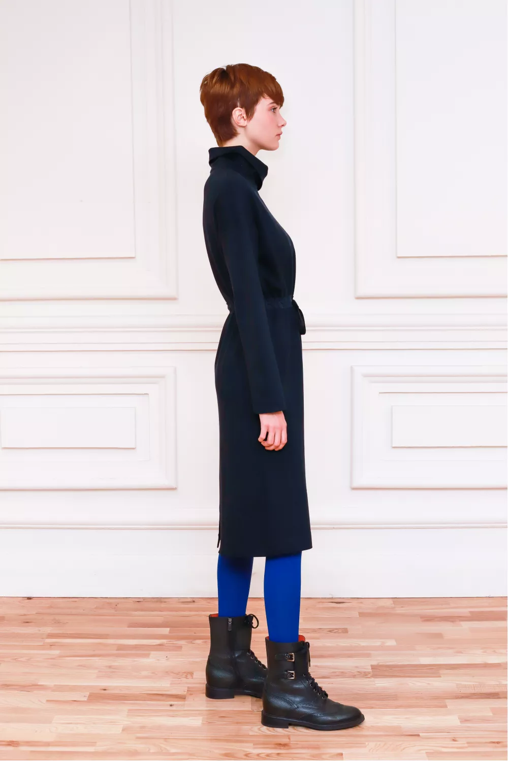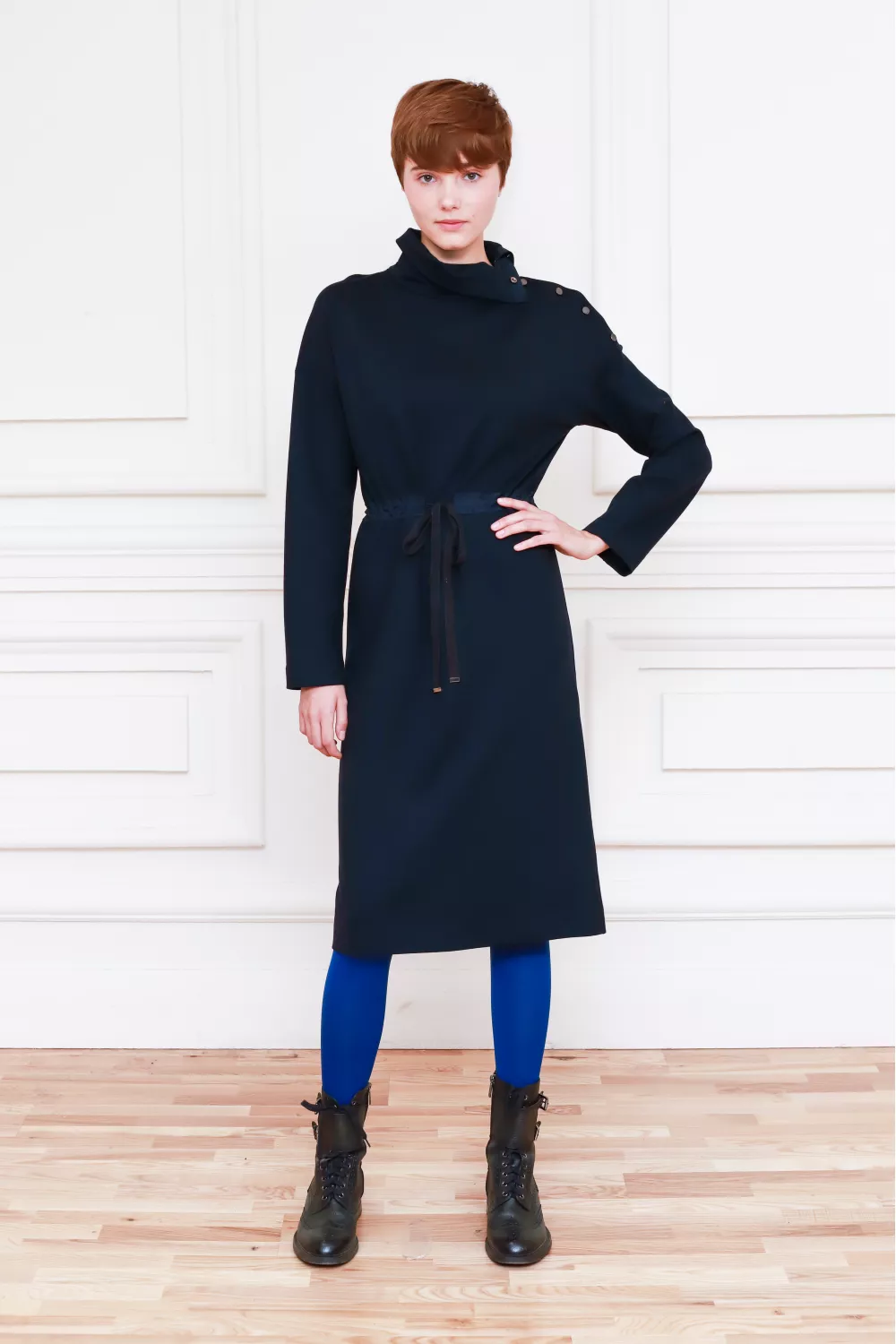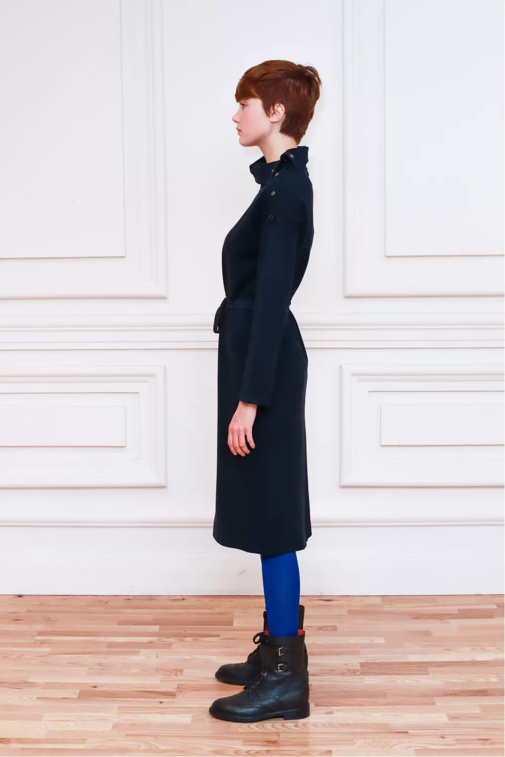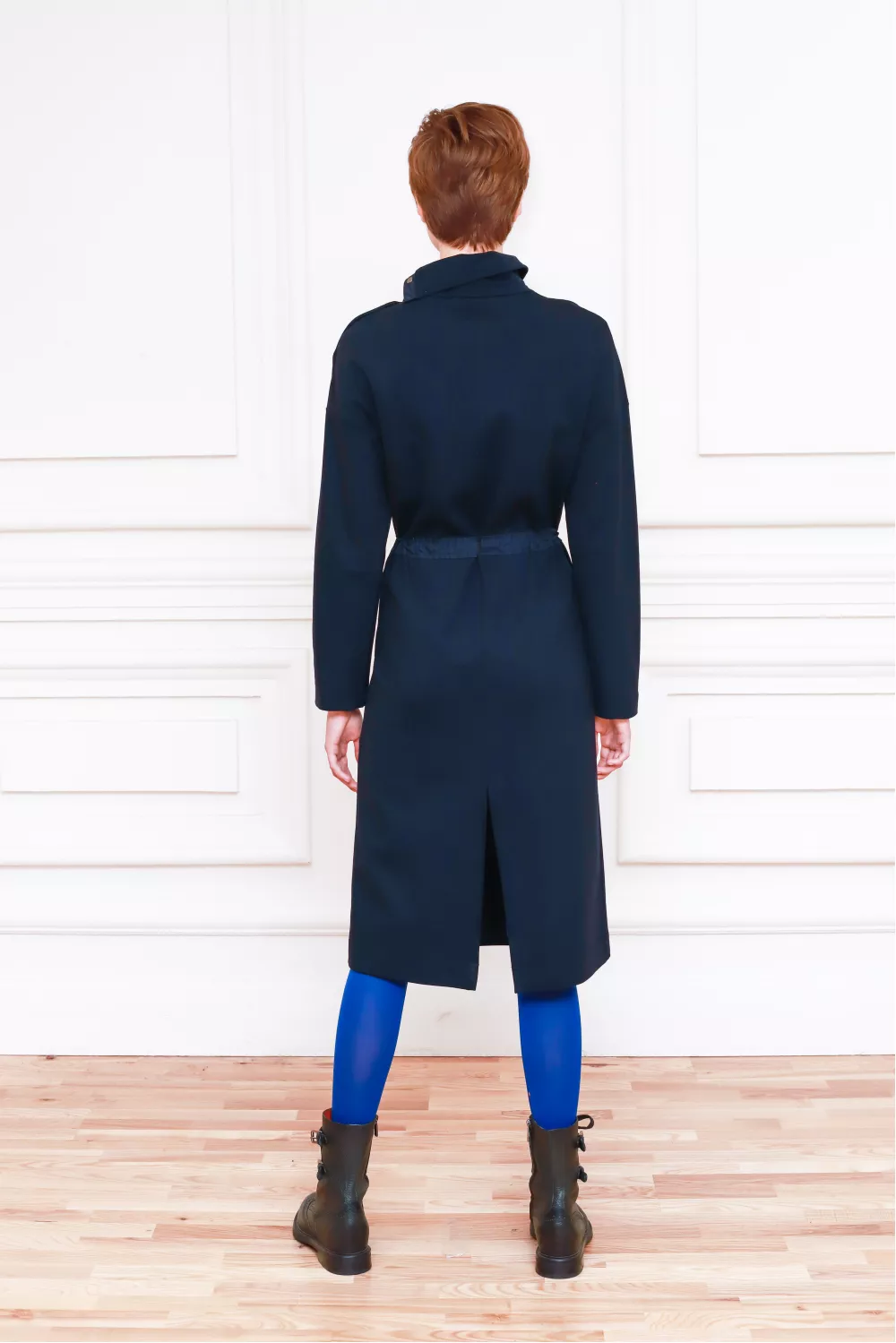 Модель имеет ворот на кнопках и стягивается шнуровкой на талии, идеально формирующей силуэт