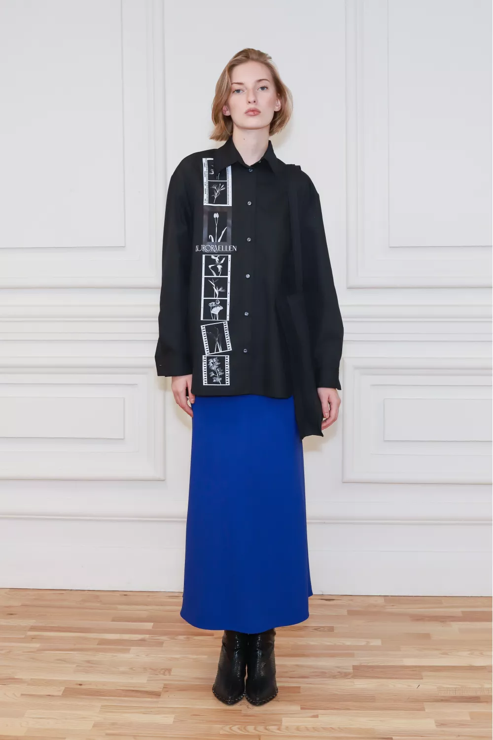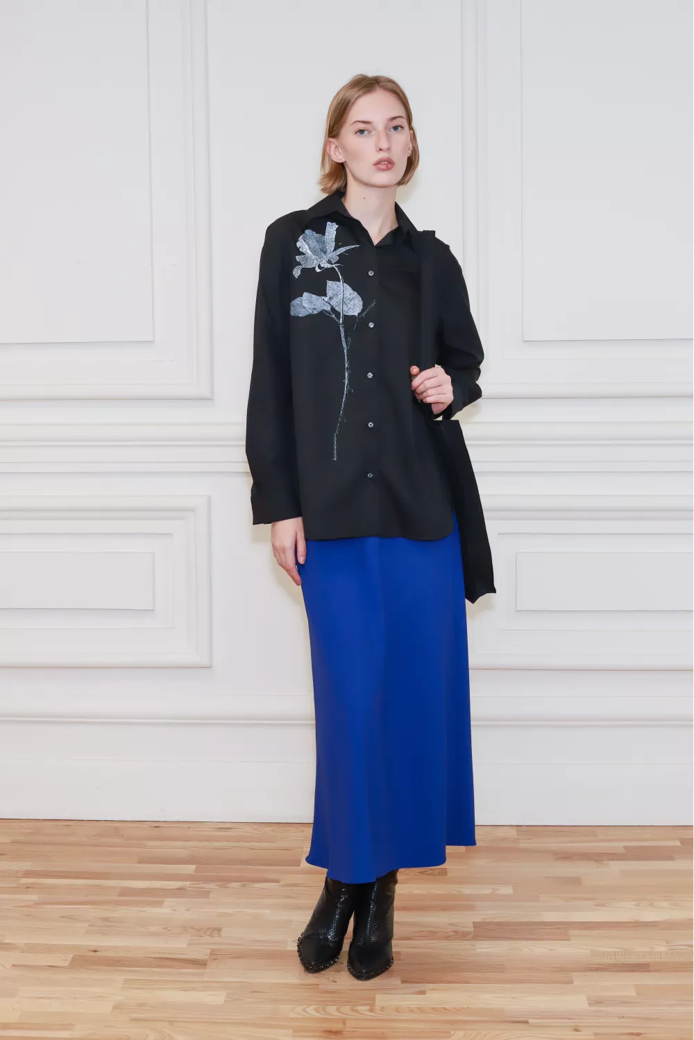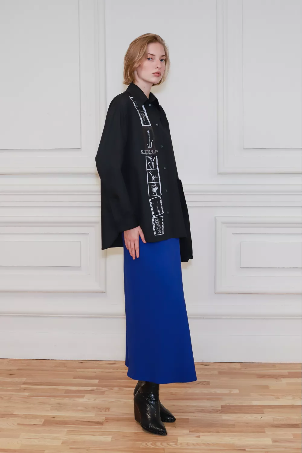 Рубашка классического покроя вне времени, декорированная принтованной линией с одной стороны, создает стильный журнальный образ