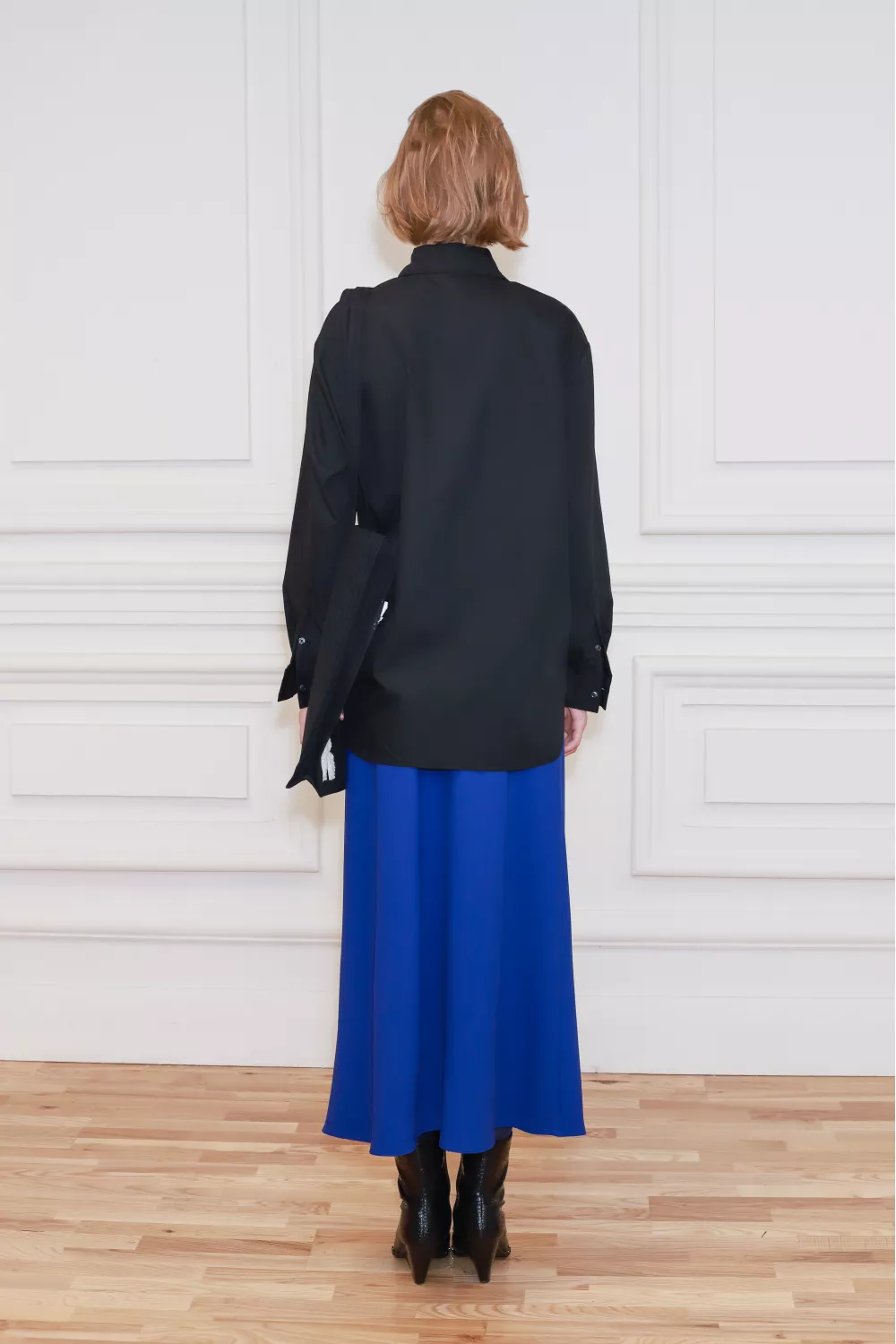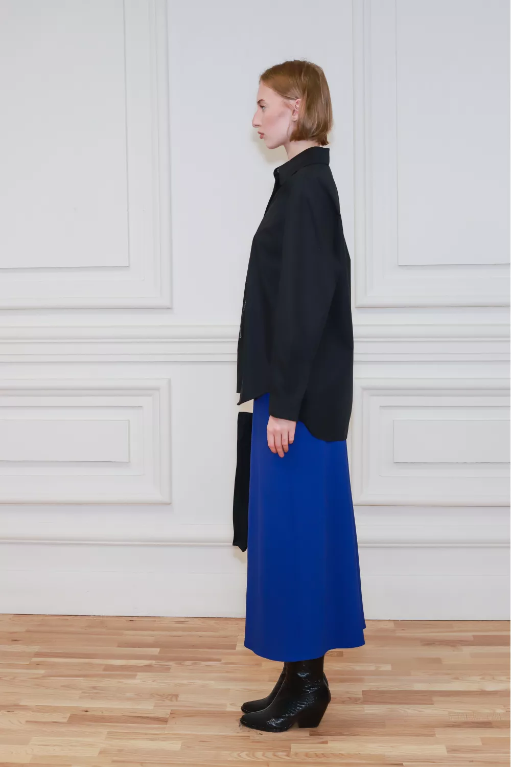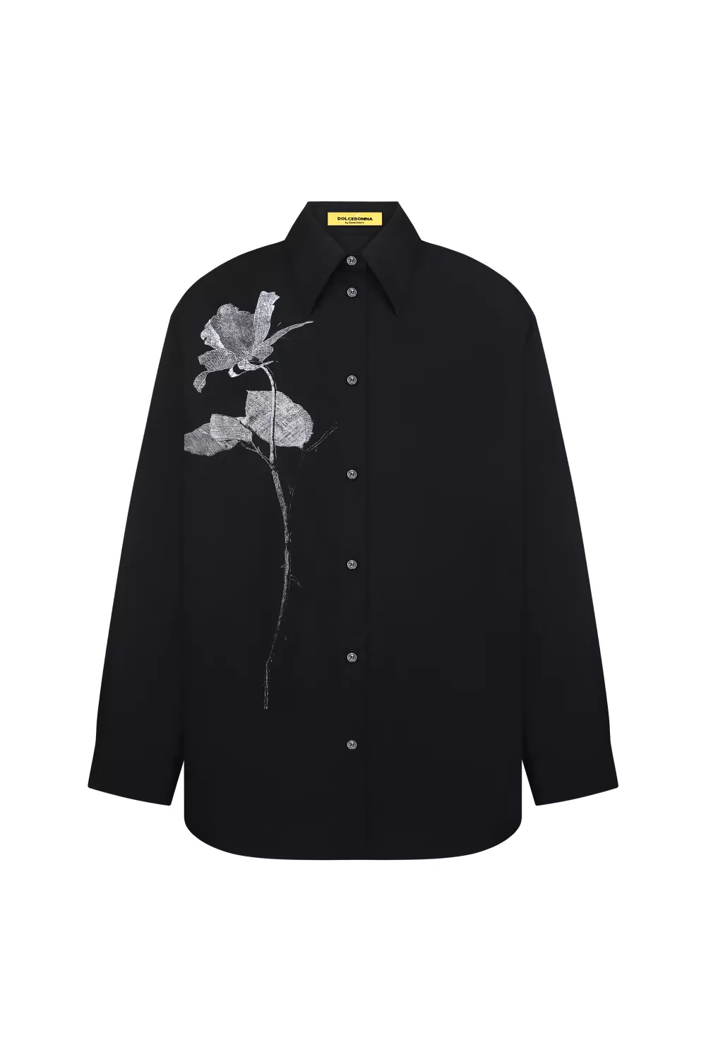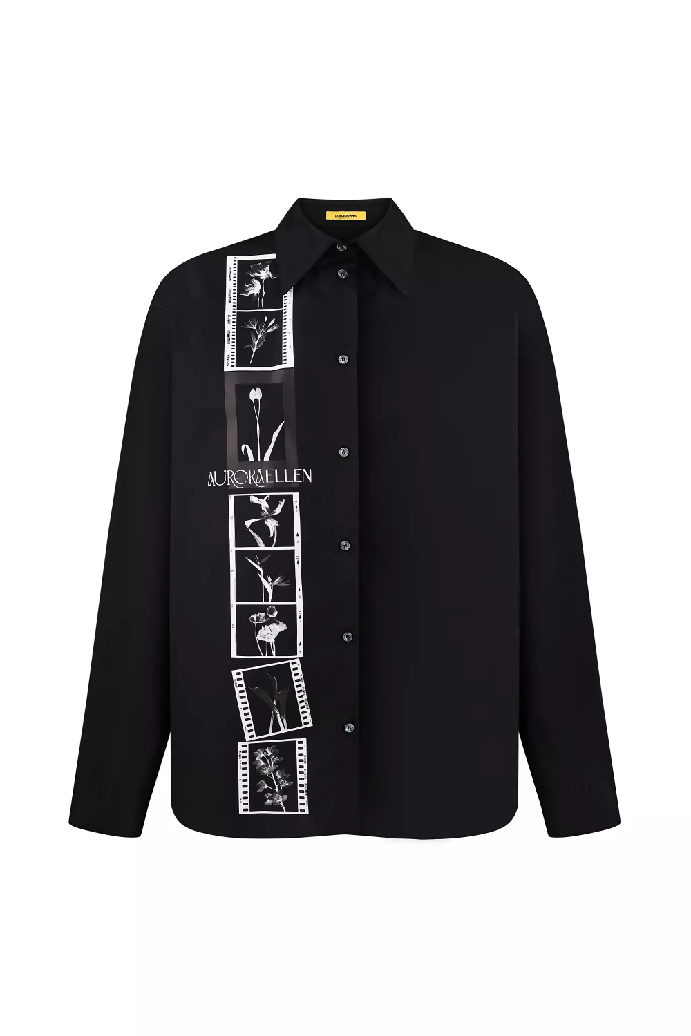 Рубашка классического покроя вне времени, декорированная принтованной линией с одной стороны, создает стильный журнальный образ
