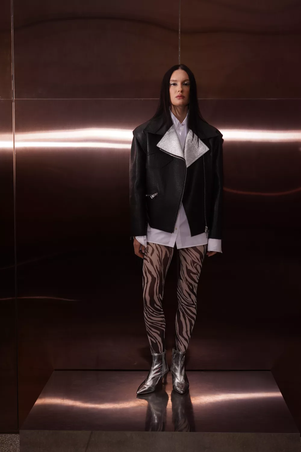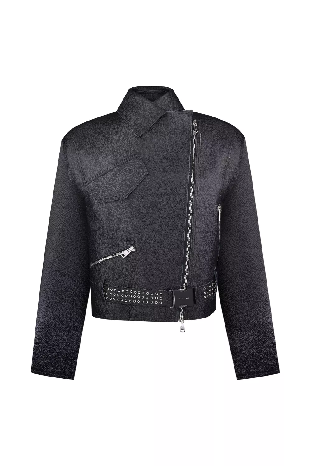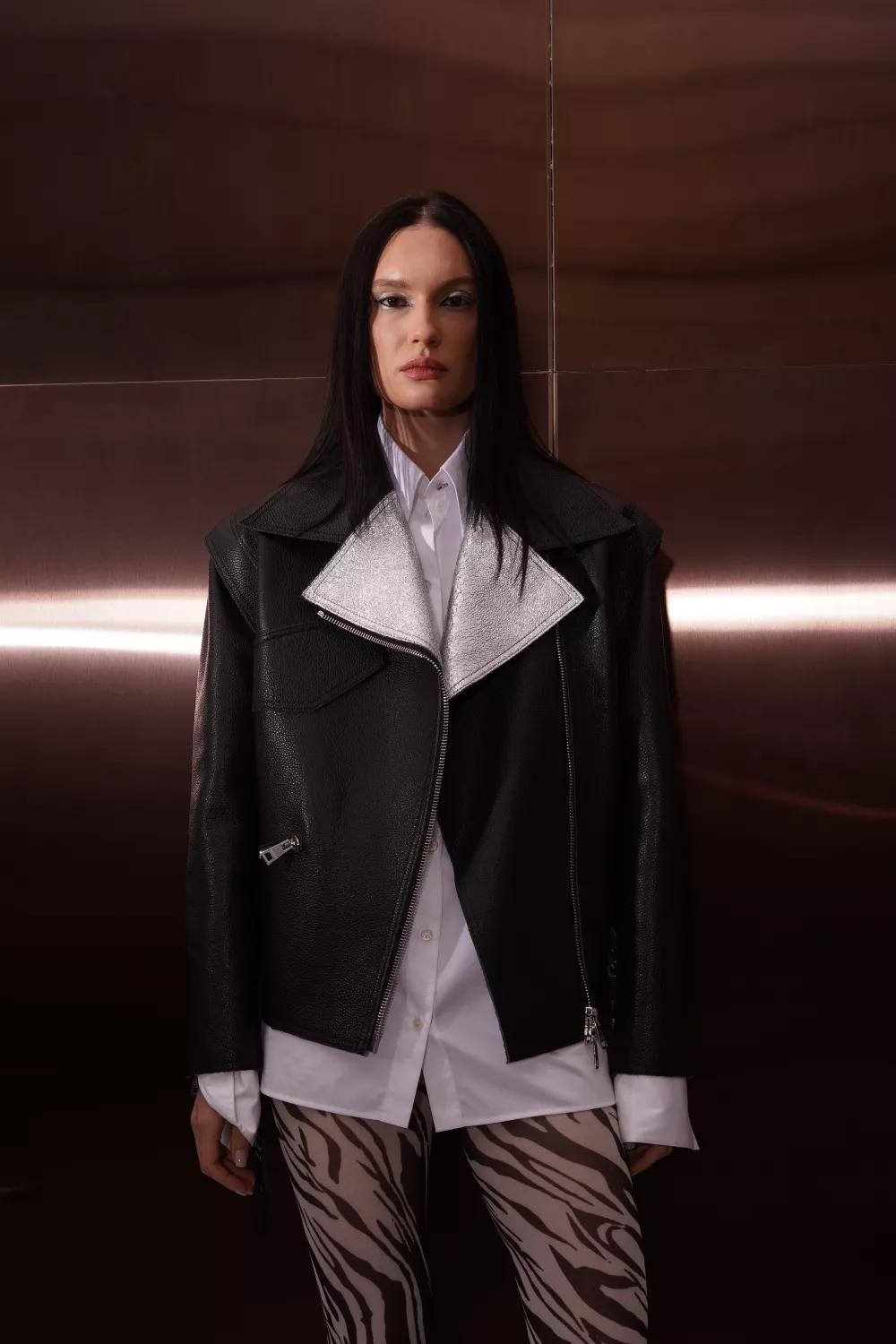 Roni's jacket features studs and zippers, paying homage to the house's classic biker style and punk roots. The model is made of thick cowhide leather with pointed shoulders and a cropped hem with a belt. Wear it open to reveal the silver lining.