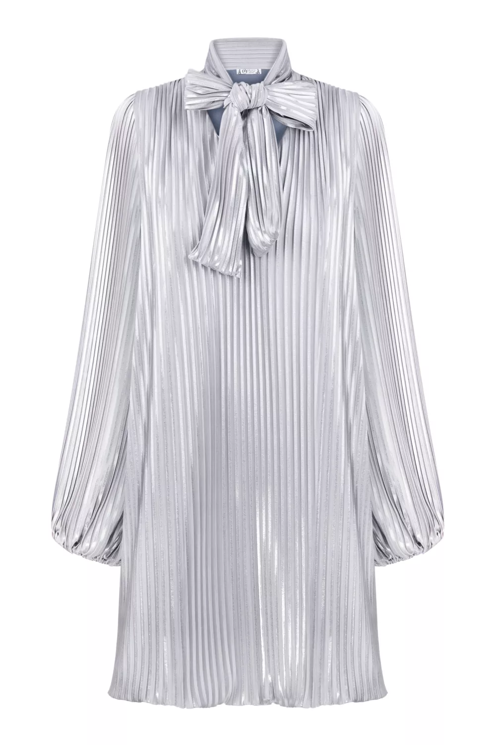 It's easy to see the Victorian influence in the Golets Trevi minidress. Made from metallic polyester, it features wide ties at the neck that can also be secured as a bow, and puffy sleeves accentuated by sharp pleats. The floating form moves beautifully.
