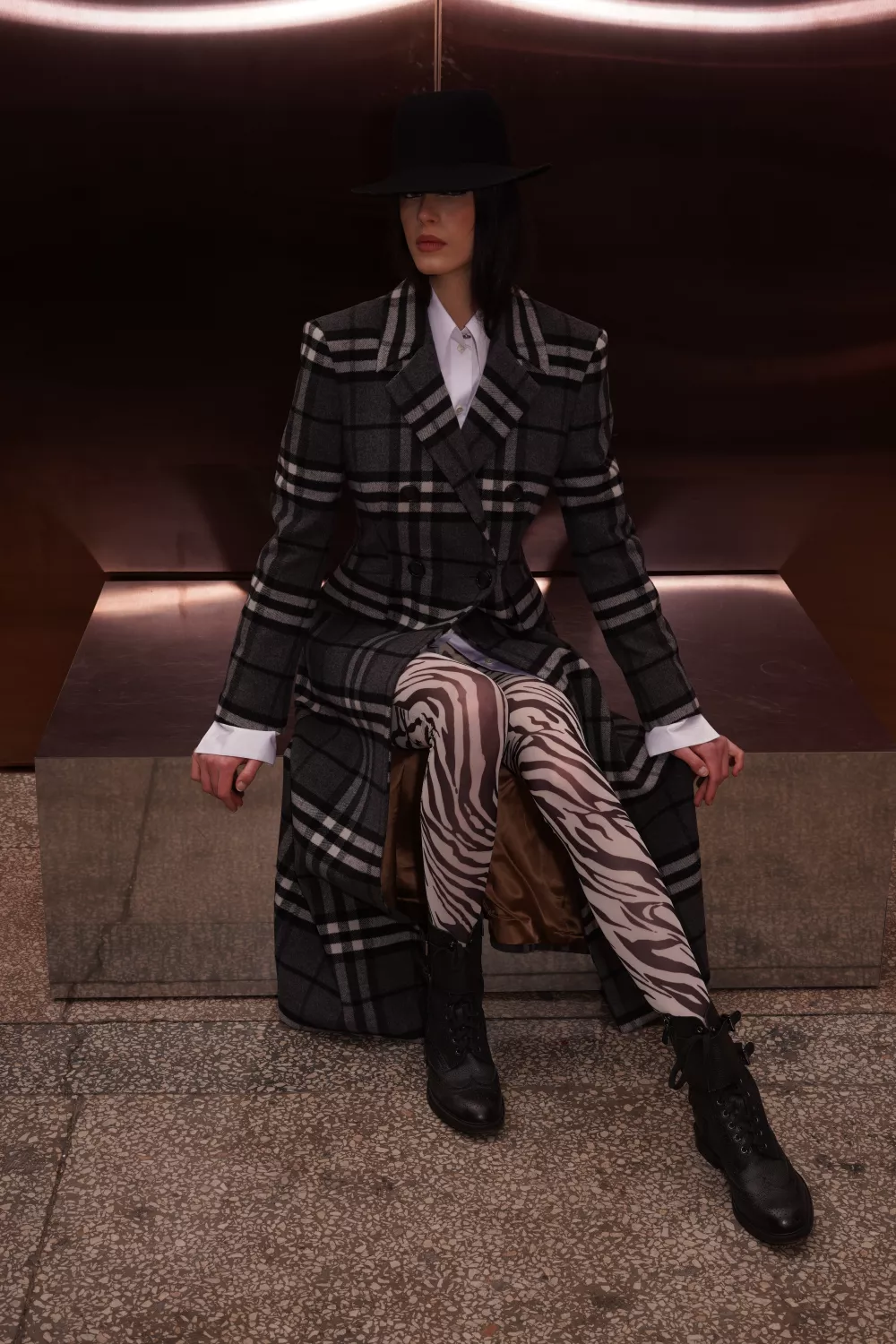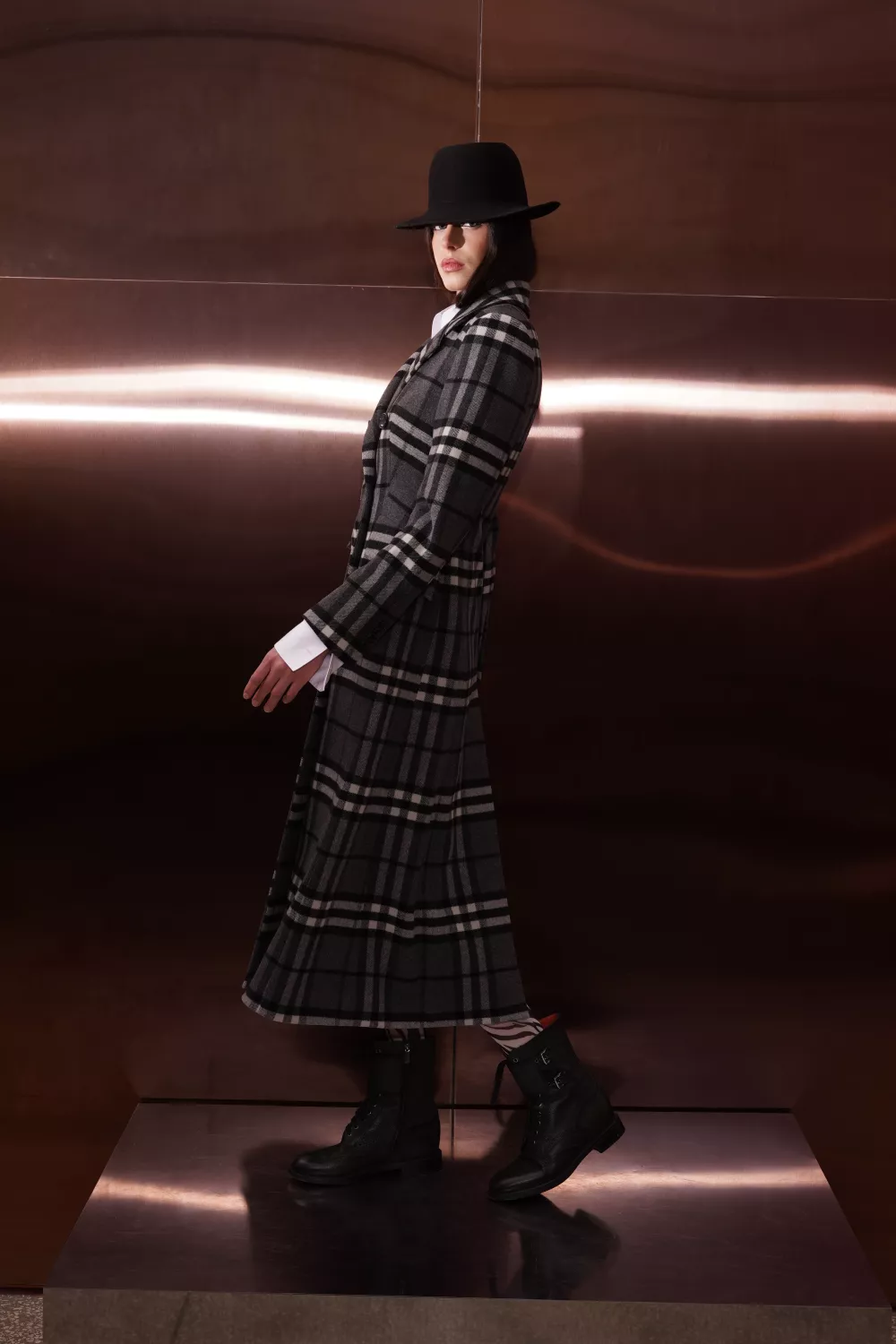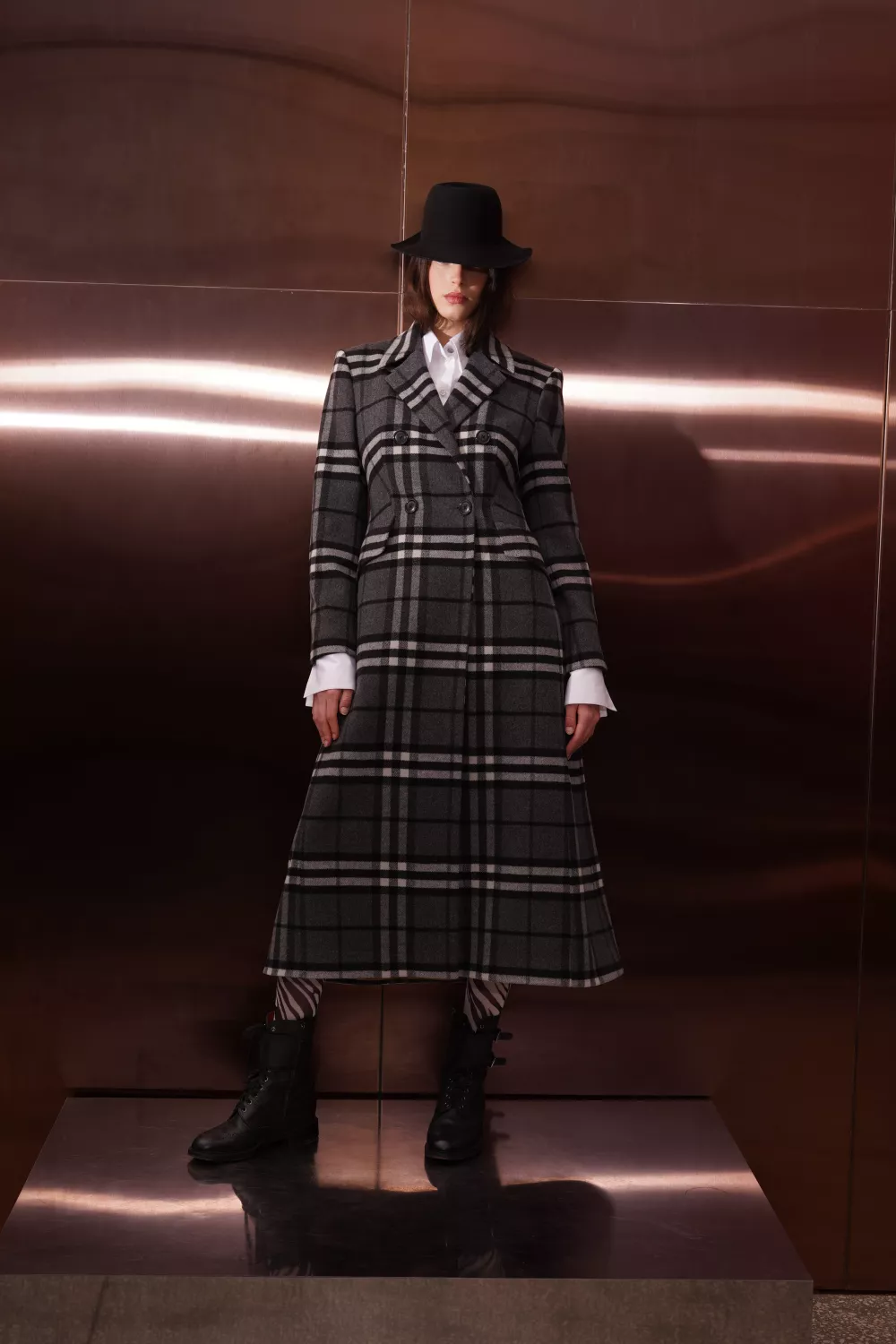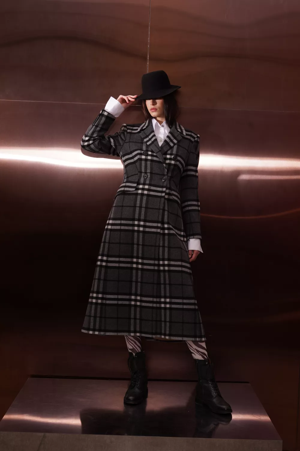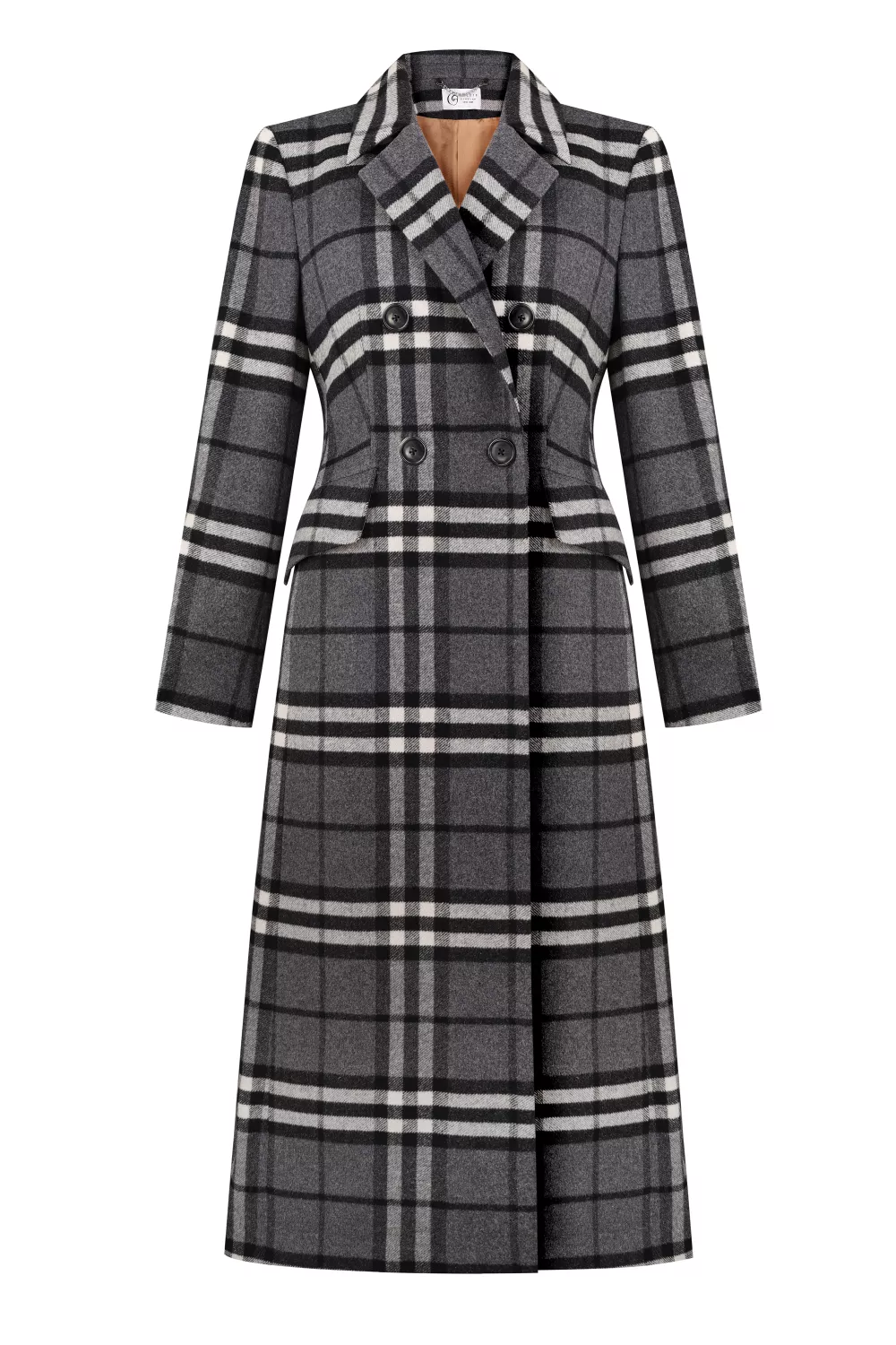 The sophisticated and formal Almeria coat is decorated with a black and white check. It's made from thick but super soft combed wool and cashmere, and has a fitted fit, peak lapels and a vent at the back. Wear yours over a dress or evening dress.
