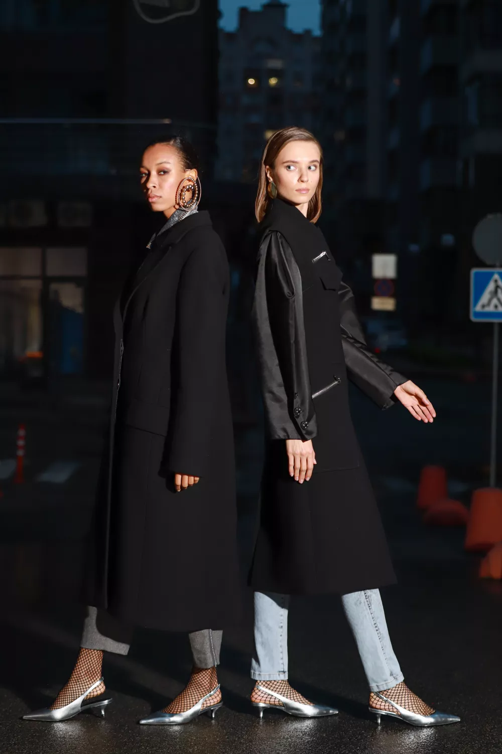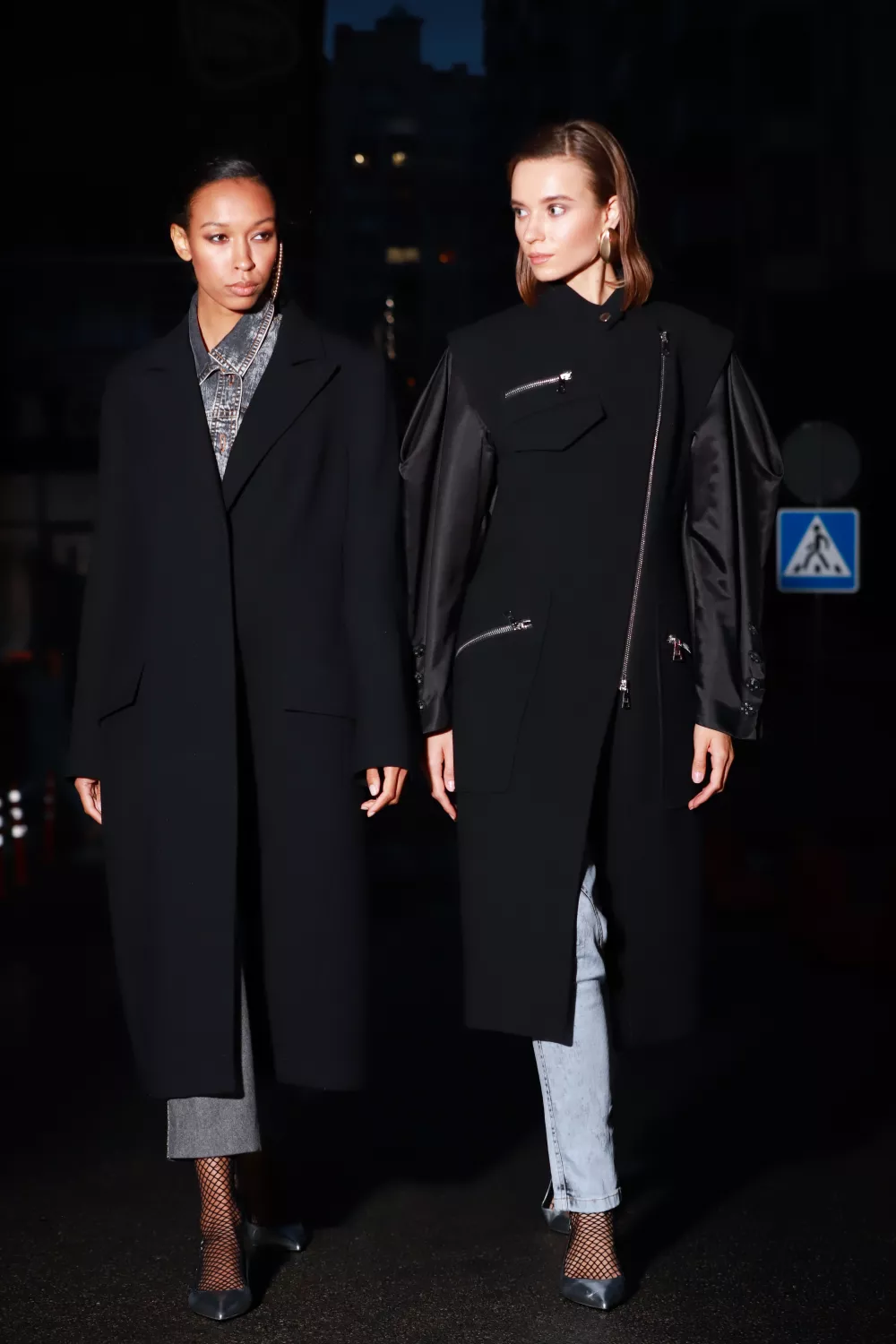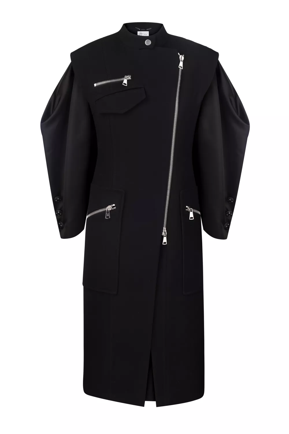 Runway coat with crepe wool in a biker style. It features zippers on the pockets and crepe satin sleeves