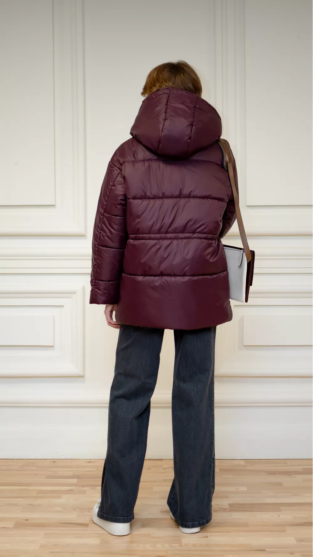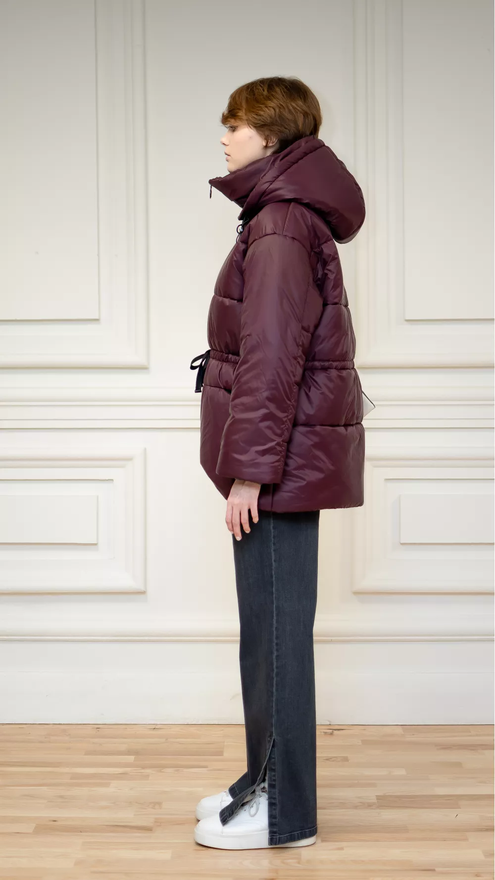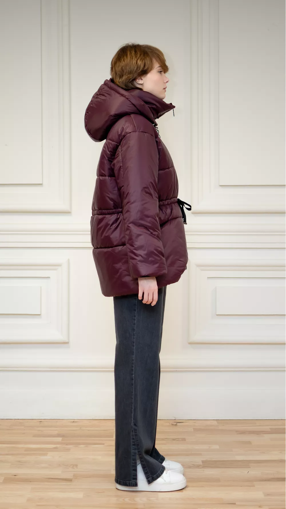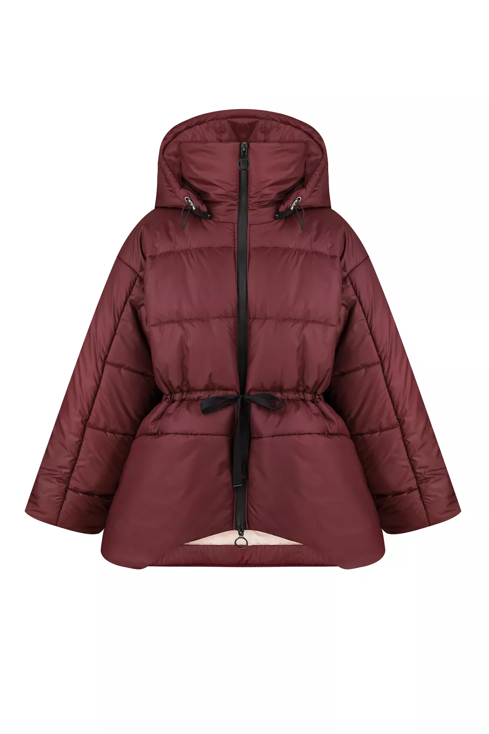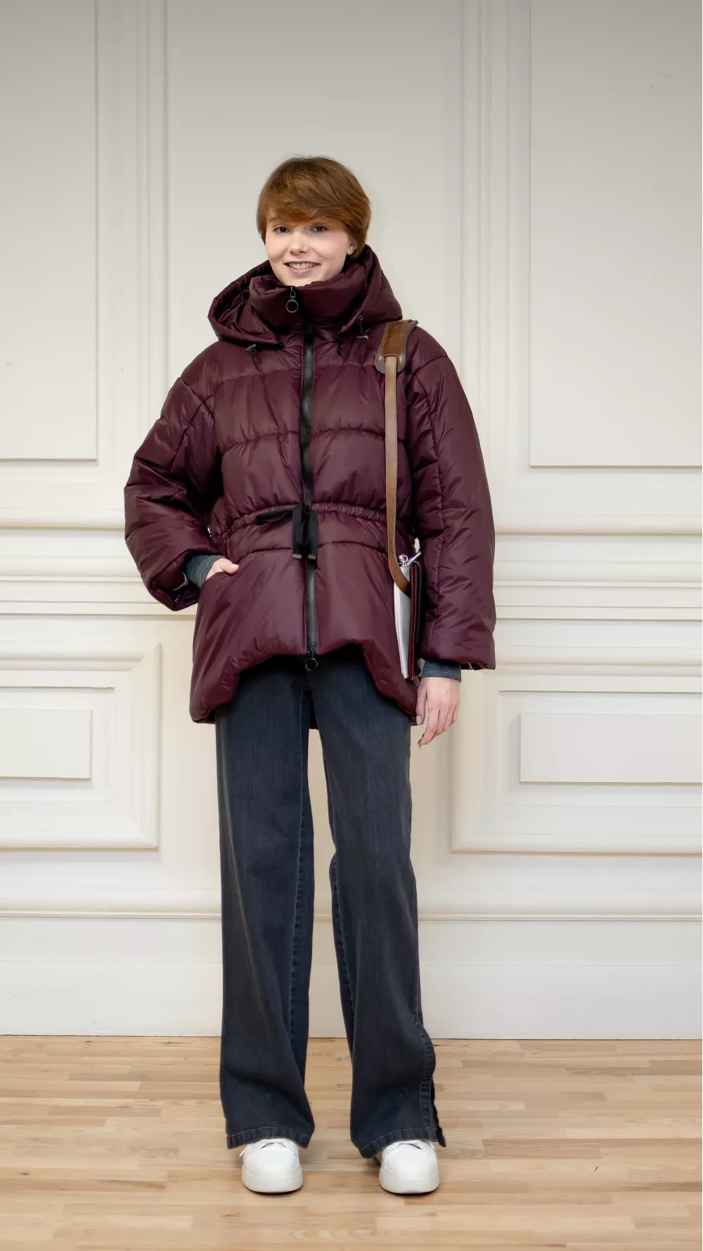 Бордовая куртка с асимметричным покроем.