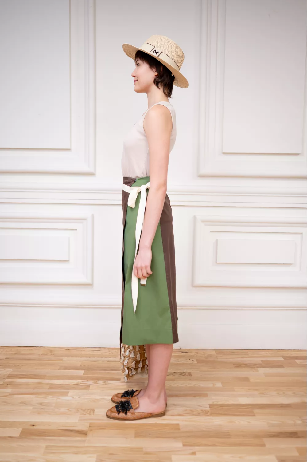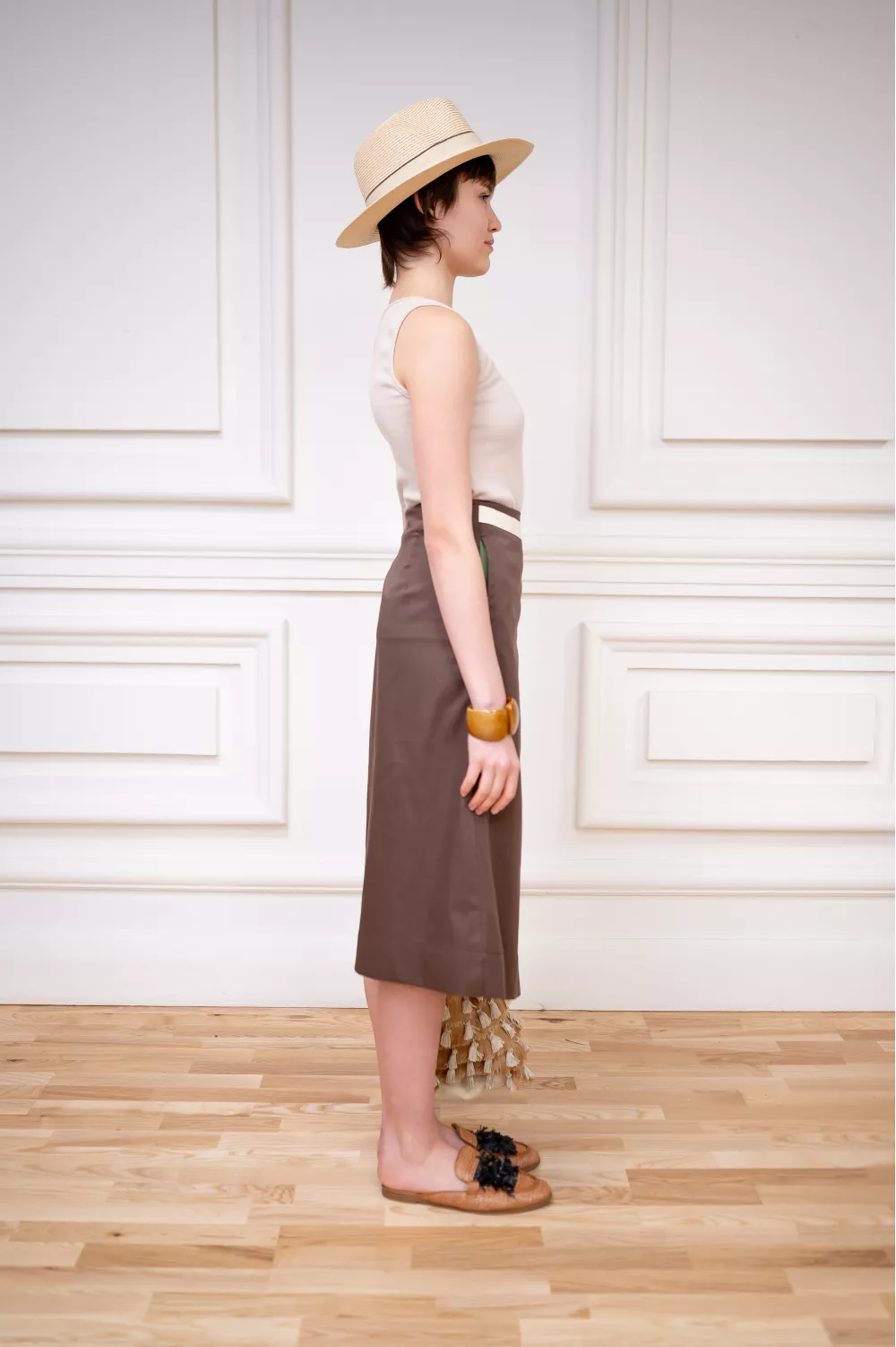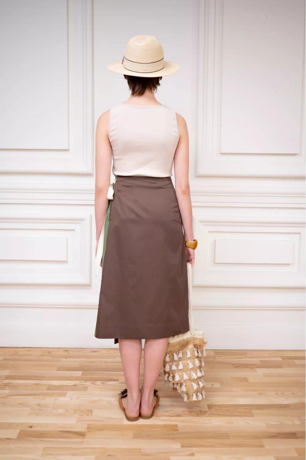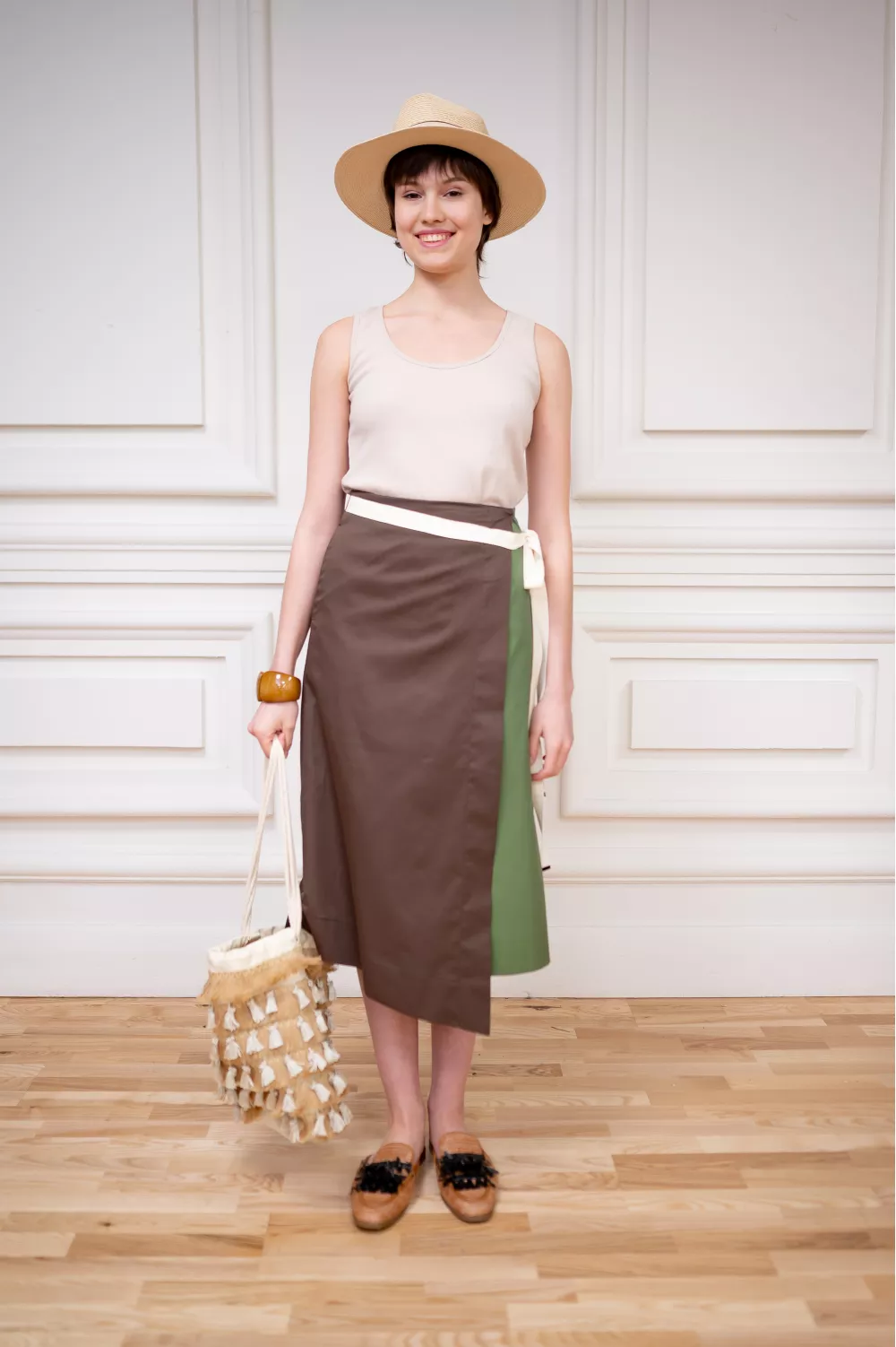 Асимметричная модель юбки на запах прекрасно сочетает в себе естественный цвет и отсылает нас к стилю сафари.