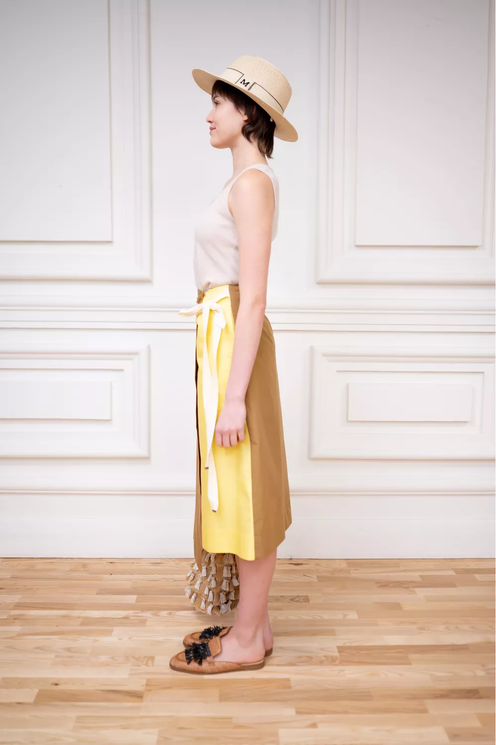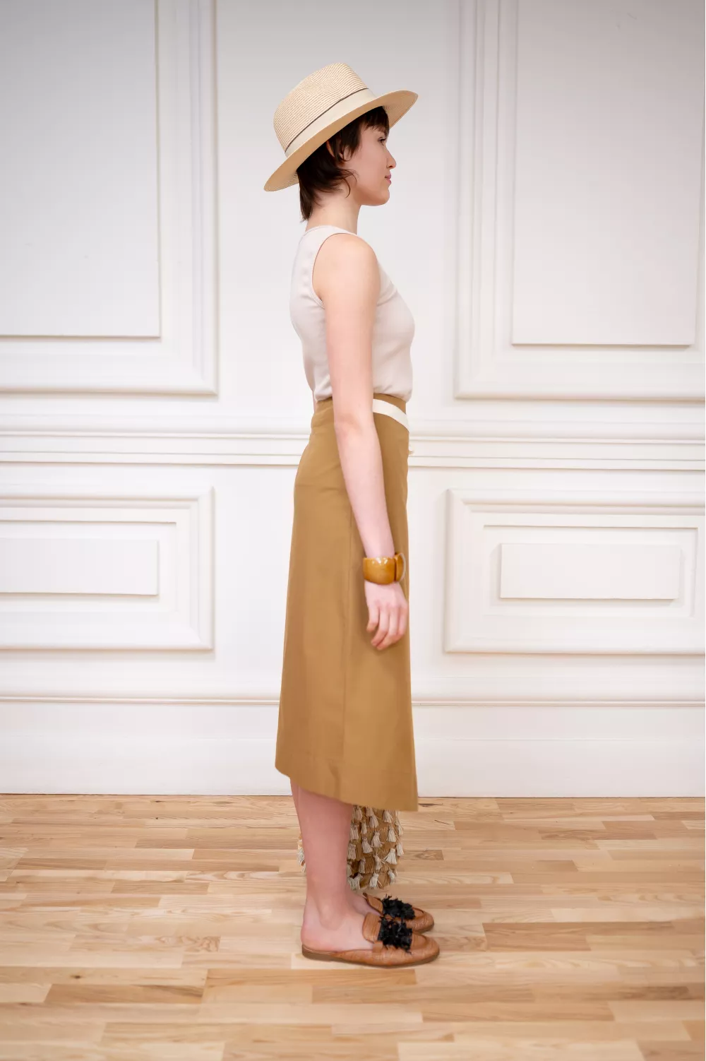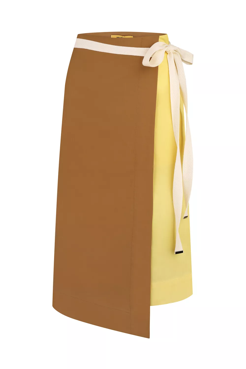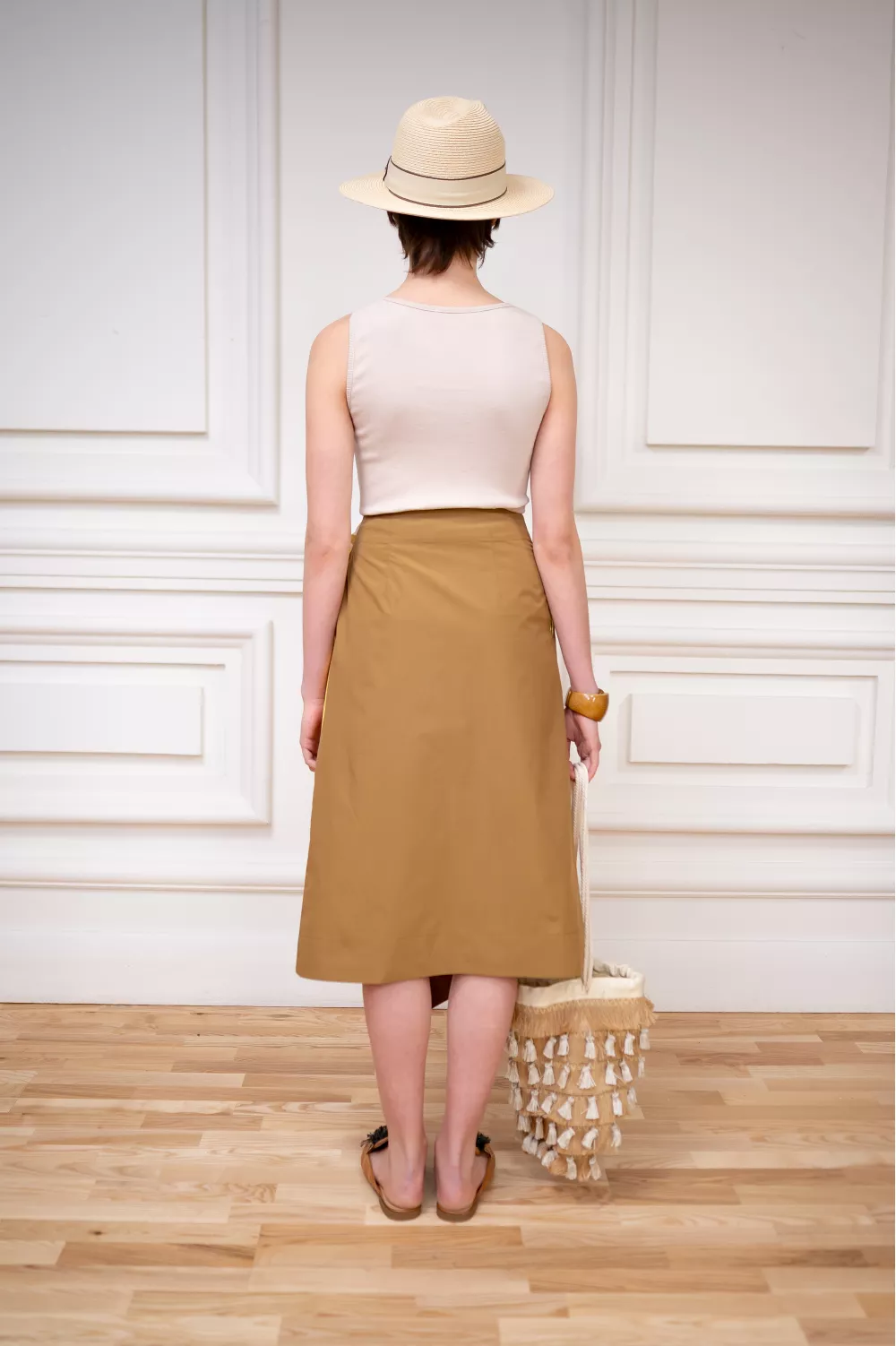 Асимметричная модель юбки на запах прекрасно сочетает в себе естественный цвет и отсылает нас к стилю сафари. Можно носить с базовыми майками и футболками