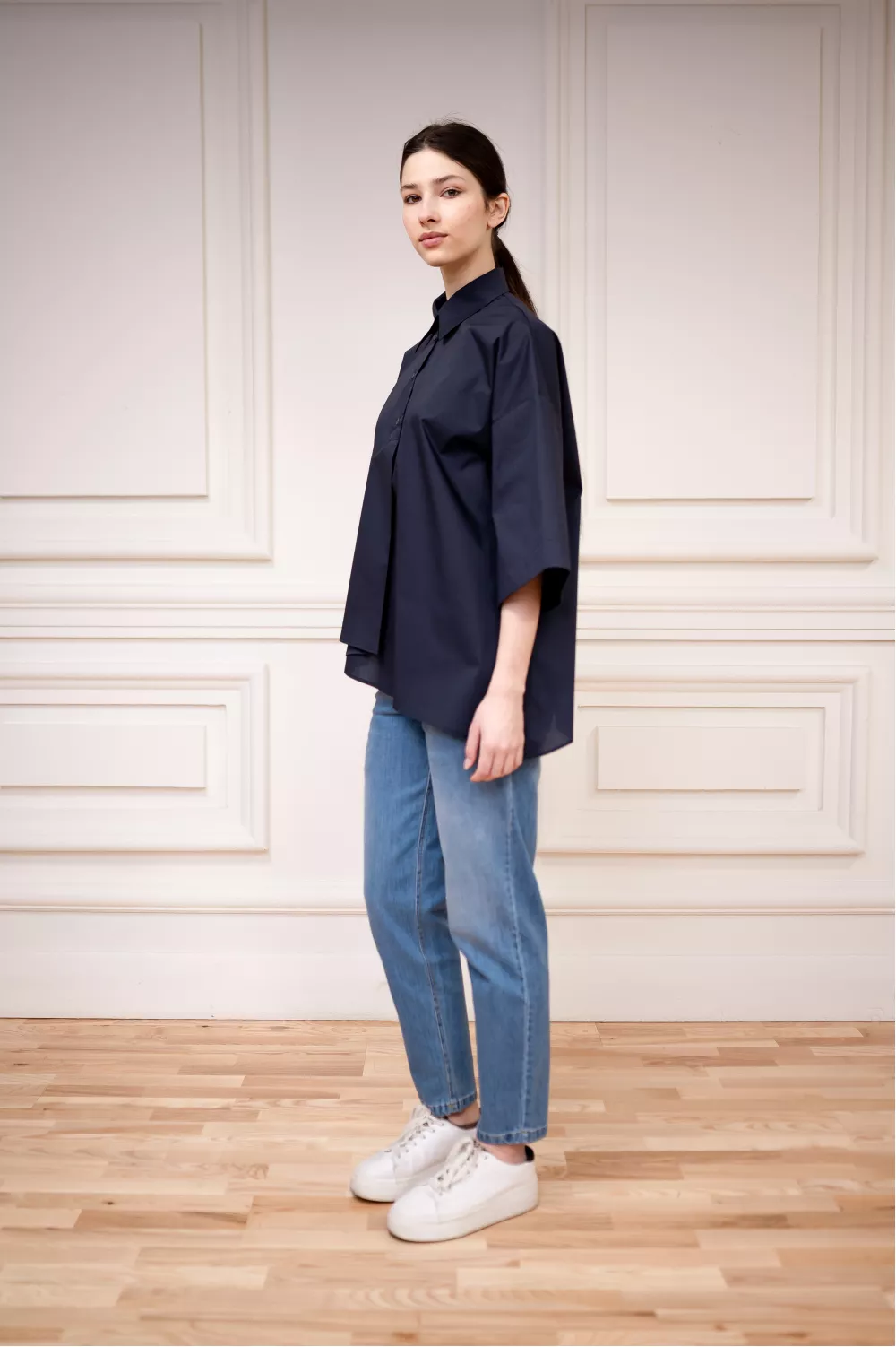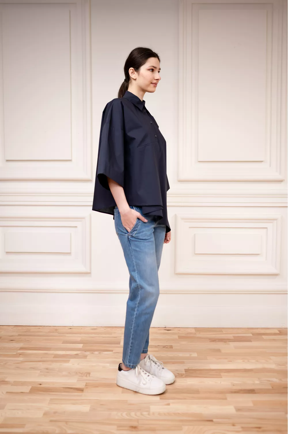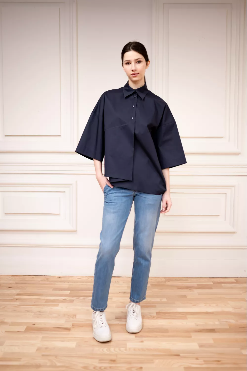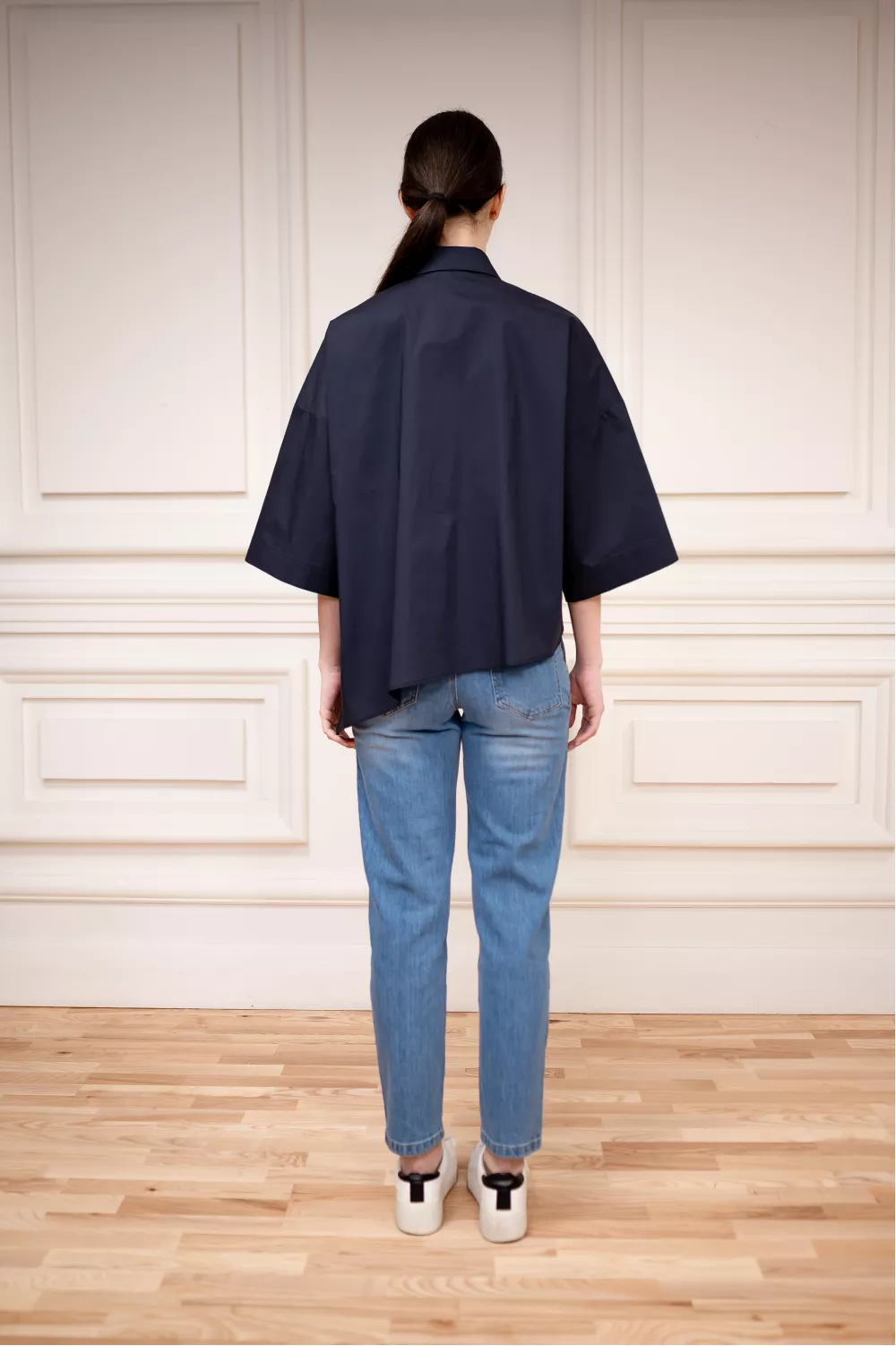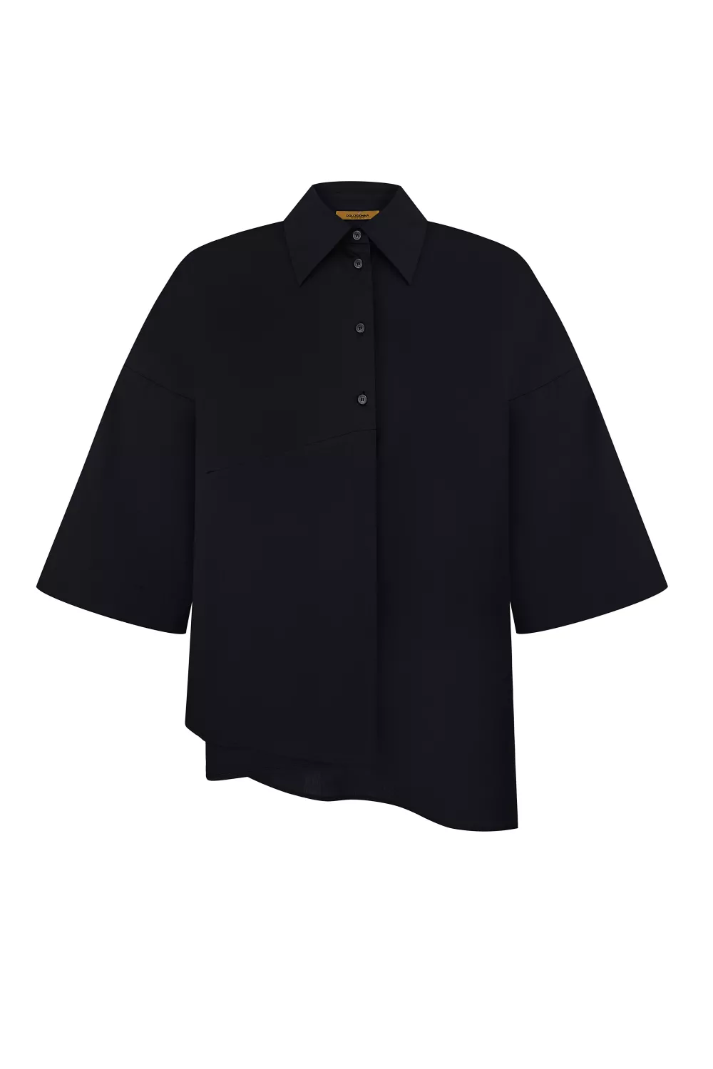 Блуза трендового покроя асимметрия и укороченным расширенным рукавом станут прекрасным элементом стилизации вашего гардероба.