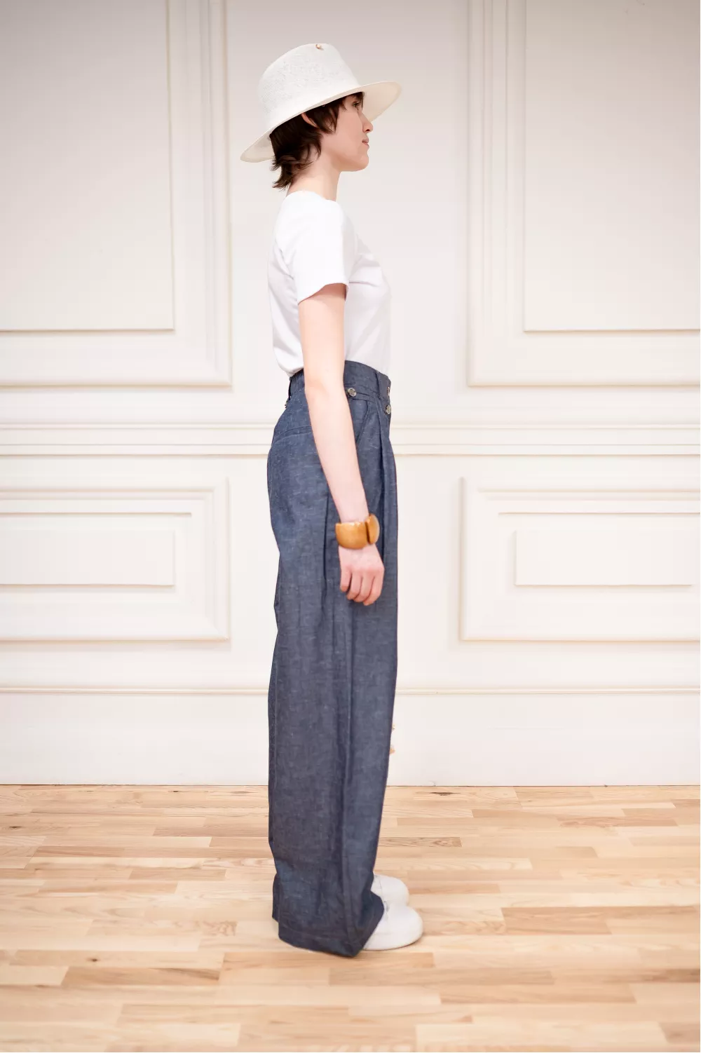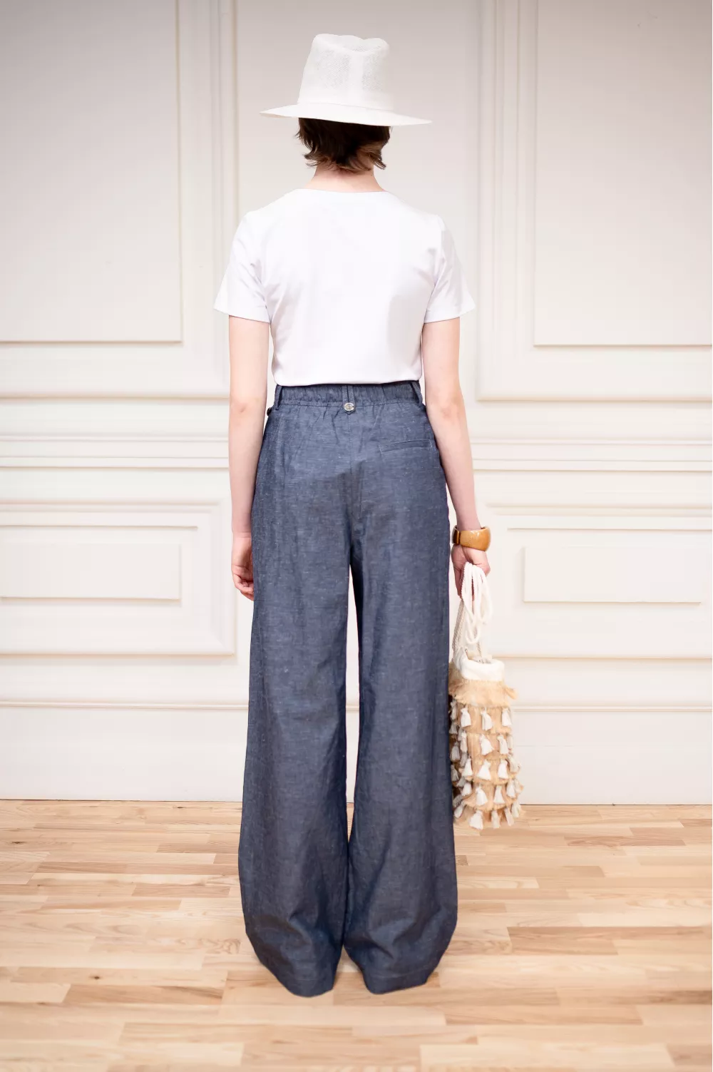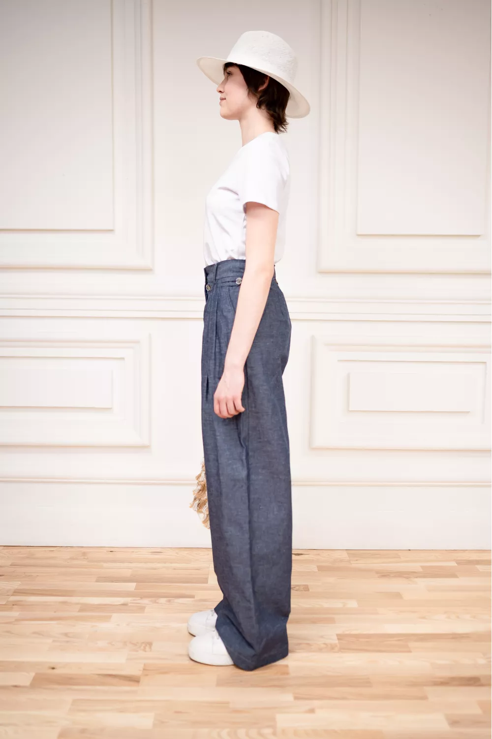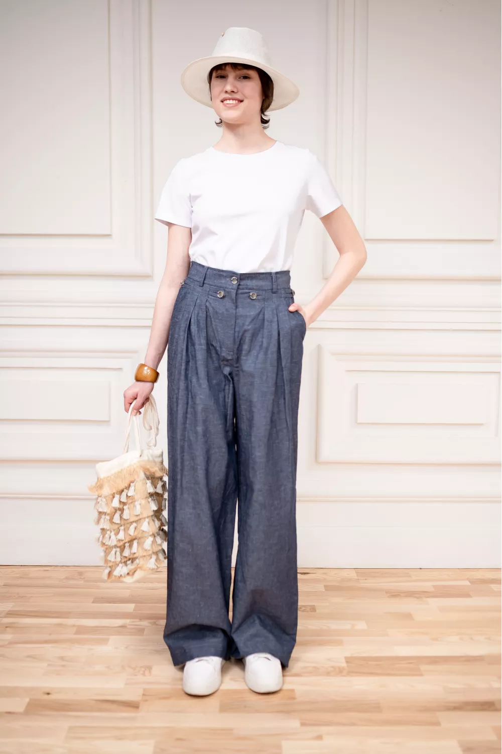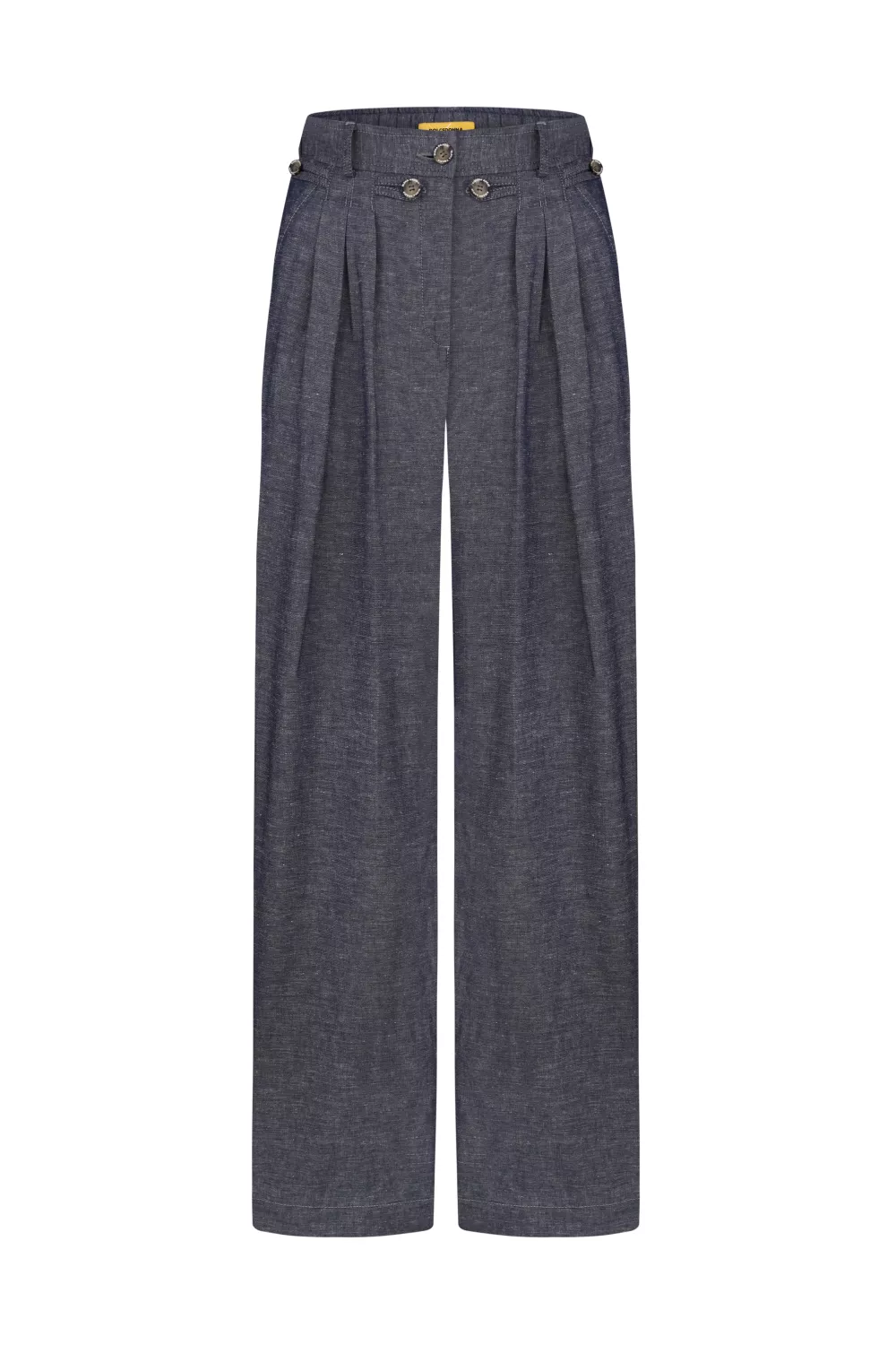 Трендовые брюки с защипами в синем цвете, своей текстурой имитирующие джинс. Идеальная посадка по фигуре и длина позволяют одевать их как под каблук, так и под кеды или кроссовки.