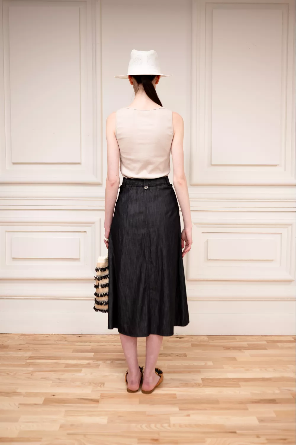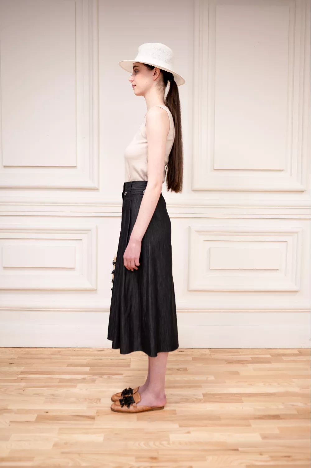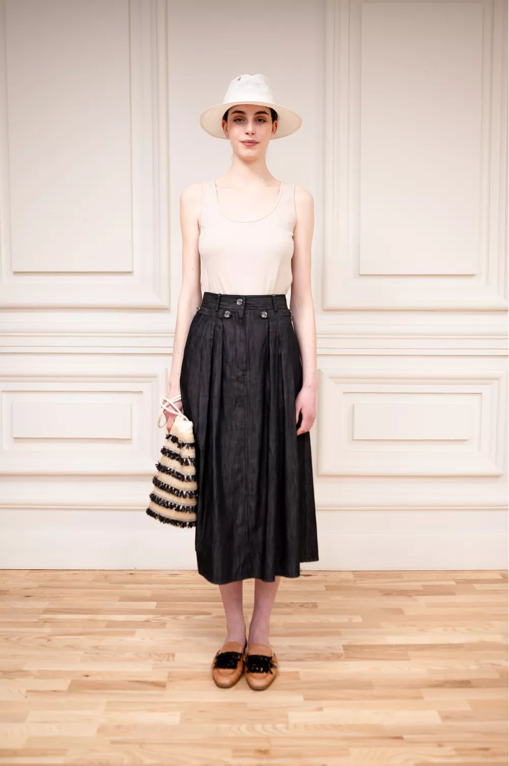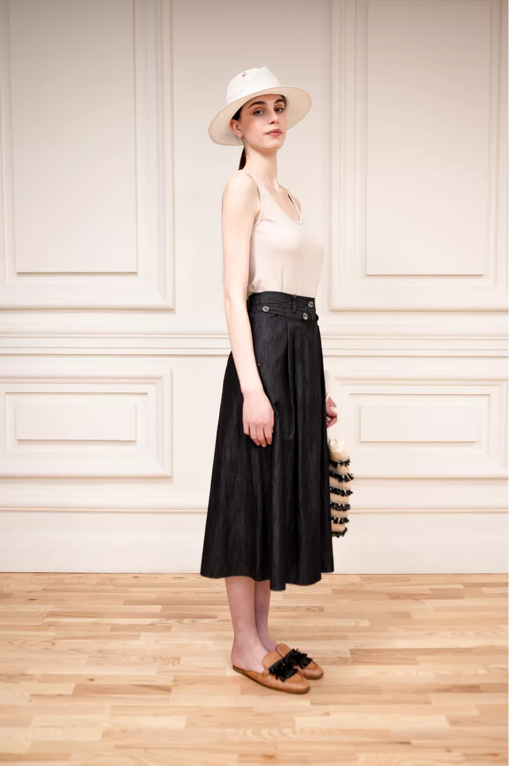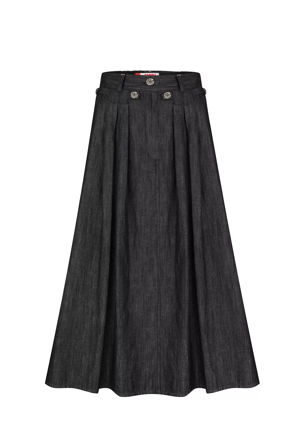Трендовая модель юбки из легкого хлопка, своей текстурой напоминающая джинс. Стилизованная защипами, фурнитурой и карманами
